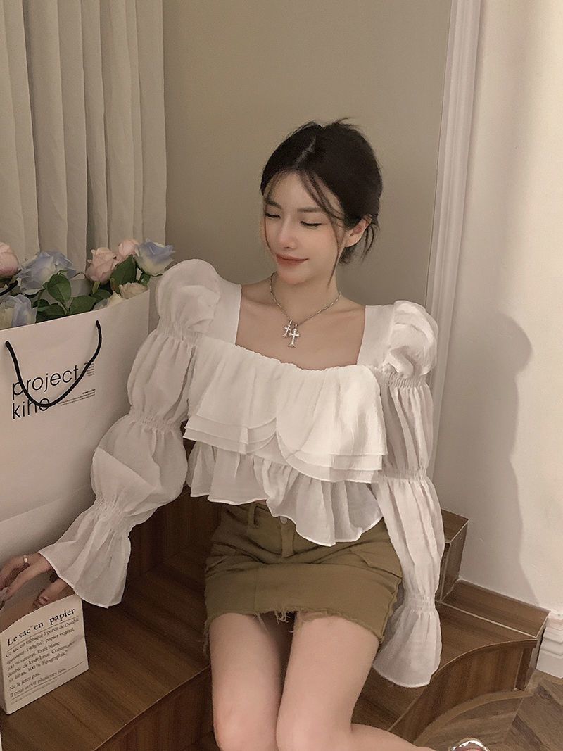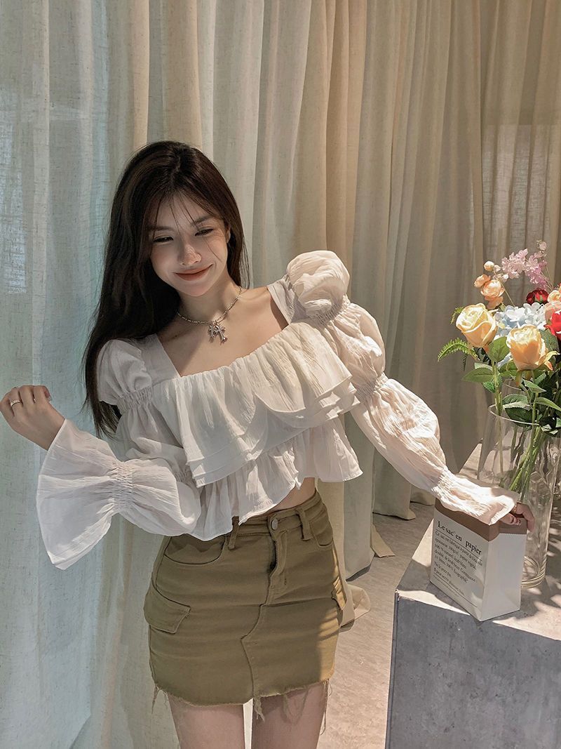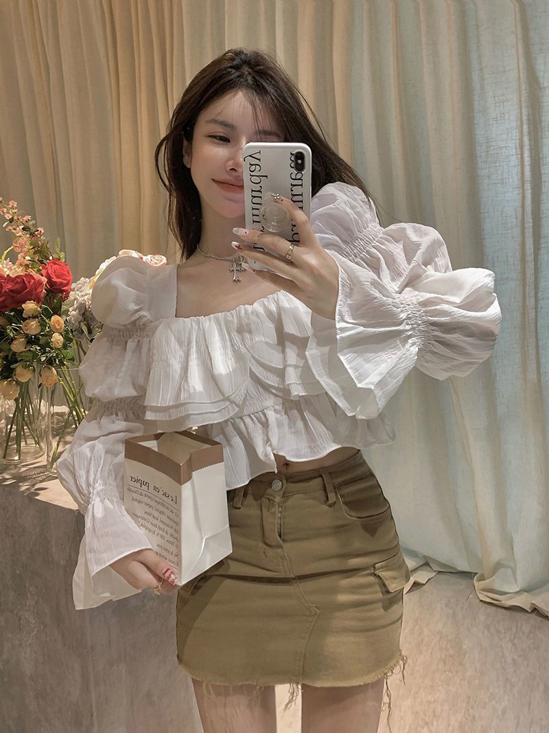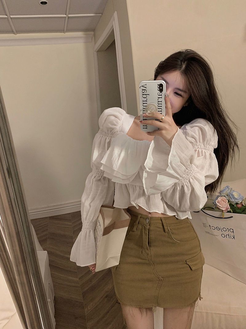 뜨거운 소녀 화이트 랜턴 소매 긴 소매 봄과 가을 셔츠 달콤한 섹시한 슬리밍 짧은 최고 디자인 센스 셔츠스토어 가기