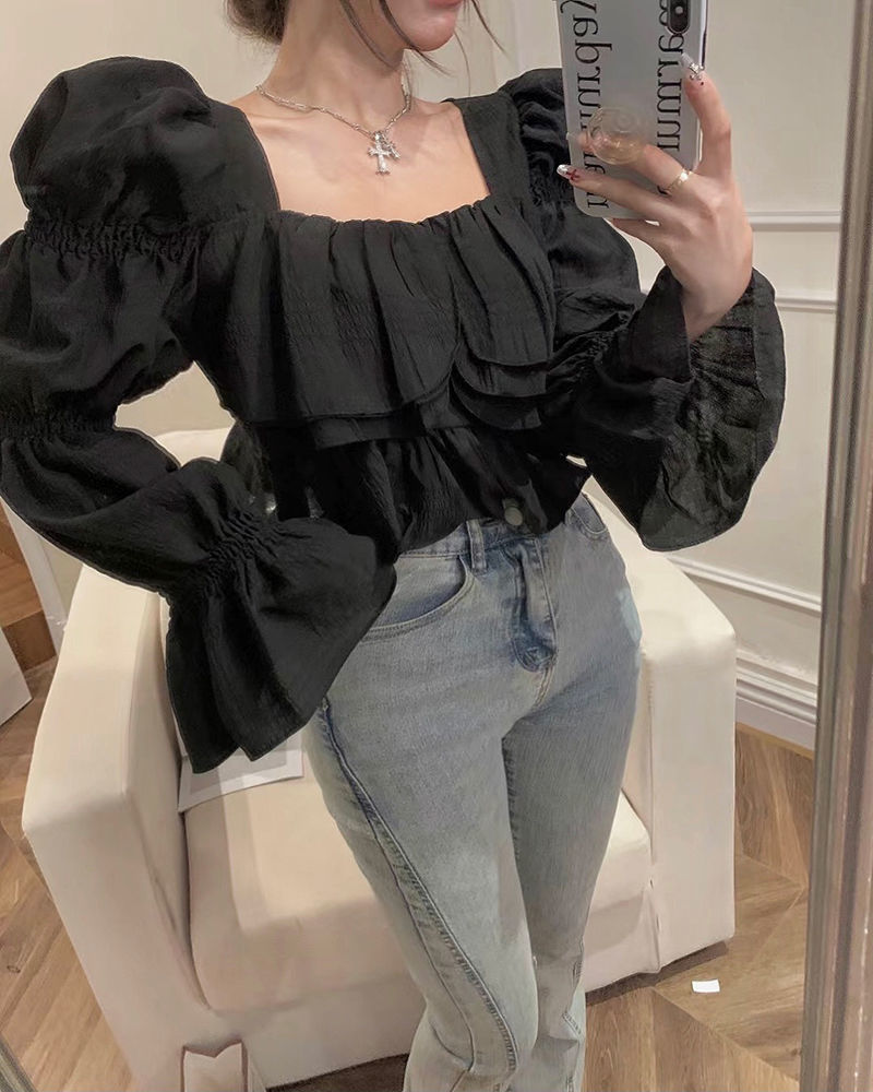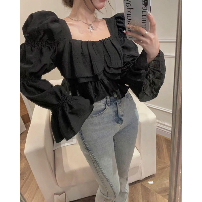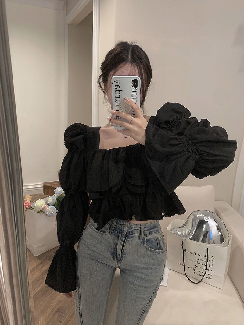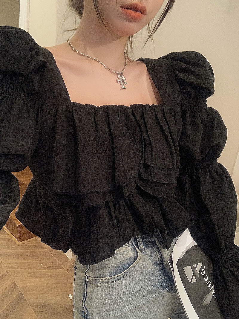 뜨거운 소녀 화이트 랜턴 소매 긴 소매 봄과 가을 셔츠 달콤한 섹시한 슬리밍 짧은 최고 디자인 센스 셔츠스토어 가기