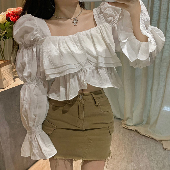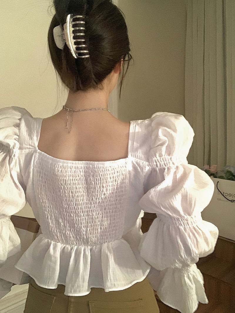 뜨거운 소녀 화이트 랜턴 소매 긴 소매 봄과 가을 셔츠 달콤한 섹시한 슬리밍 짧은 최고 디자인 센스 셔츠