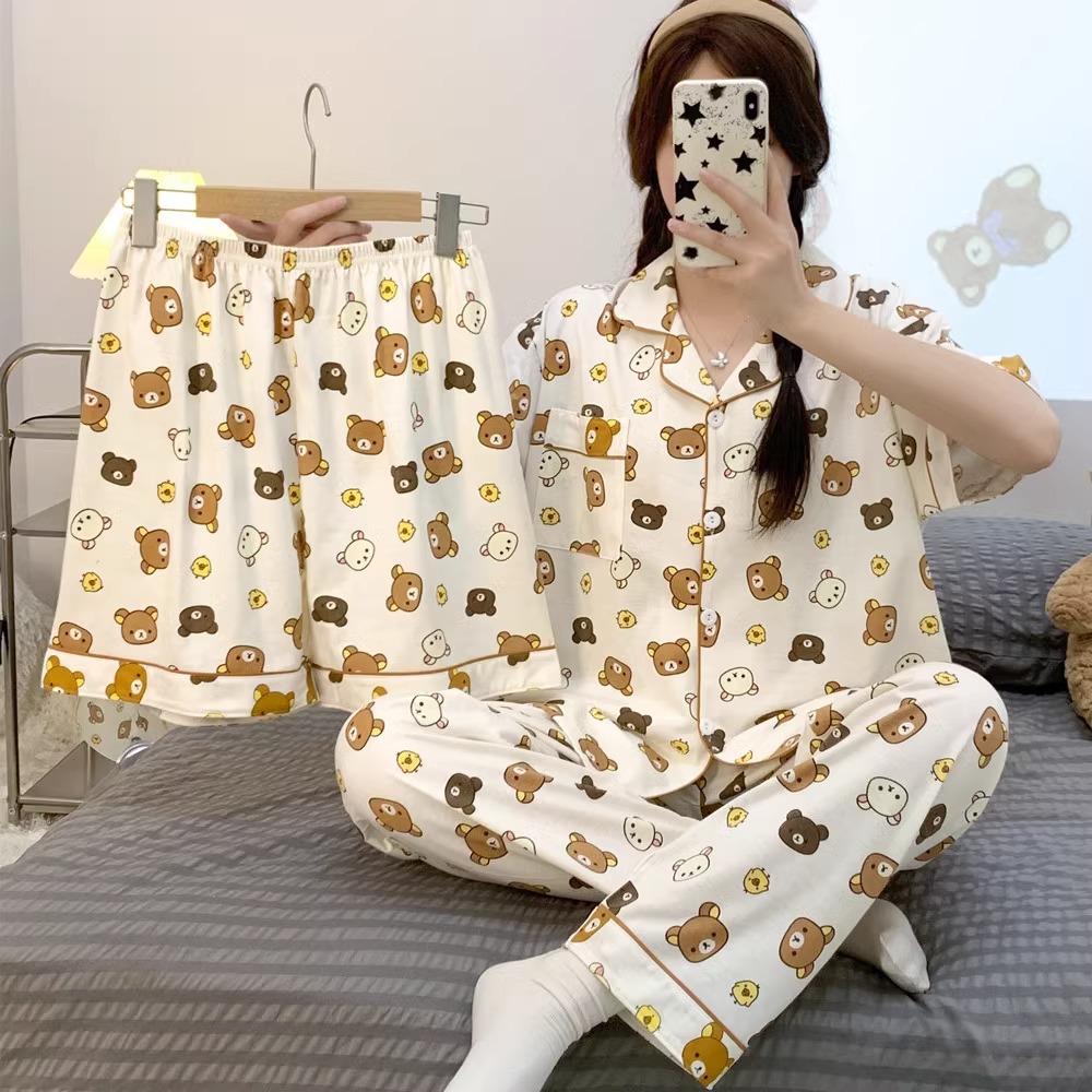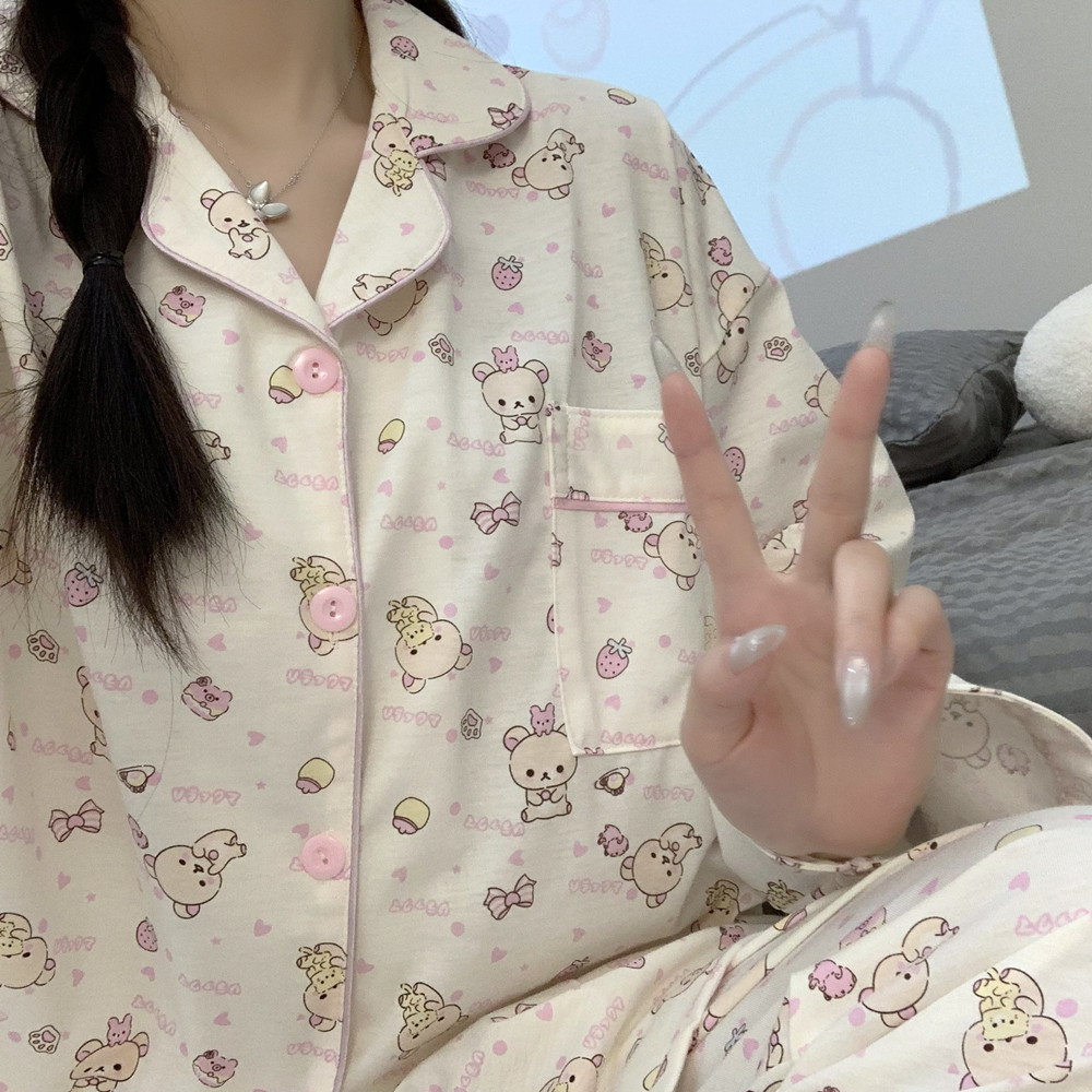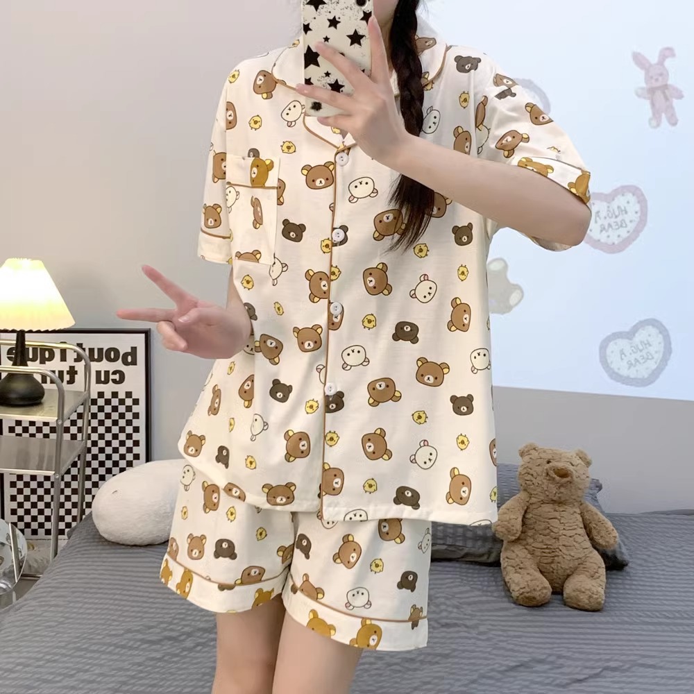 귀여운 리락쿠마 잠옷 여성용 봄 여름 니트 면 반팔 반바지 학생용 루즈핏 큰 사이즈 여름 홈웨어 세트