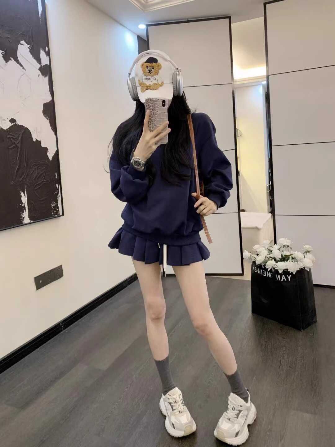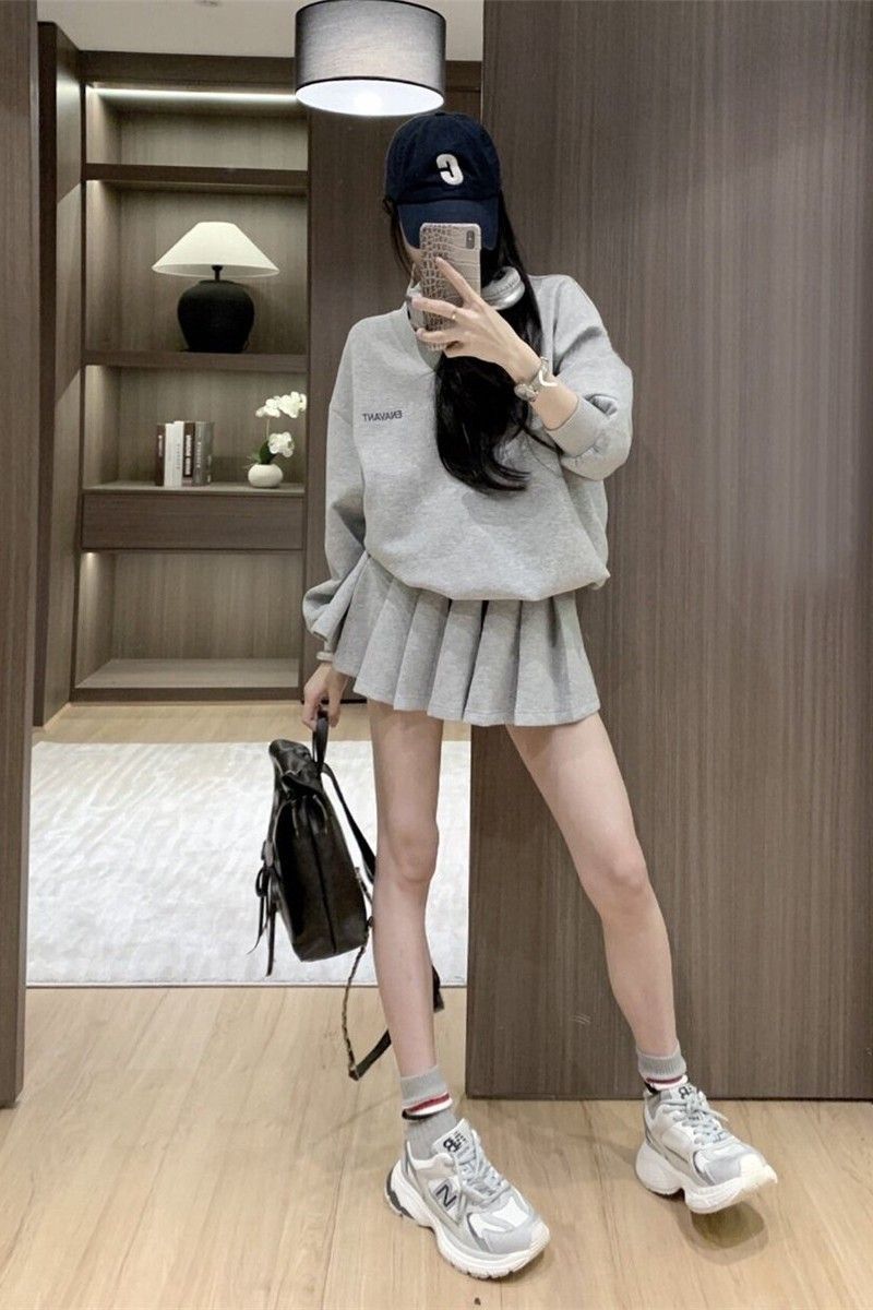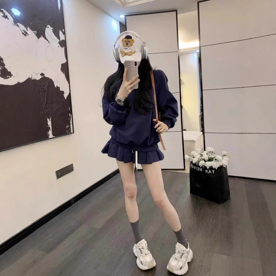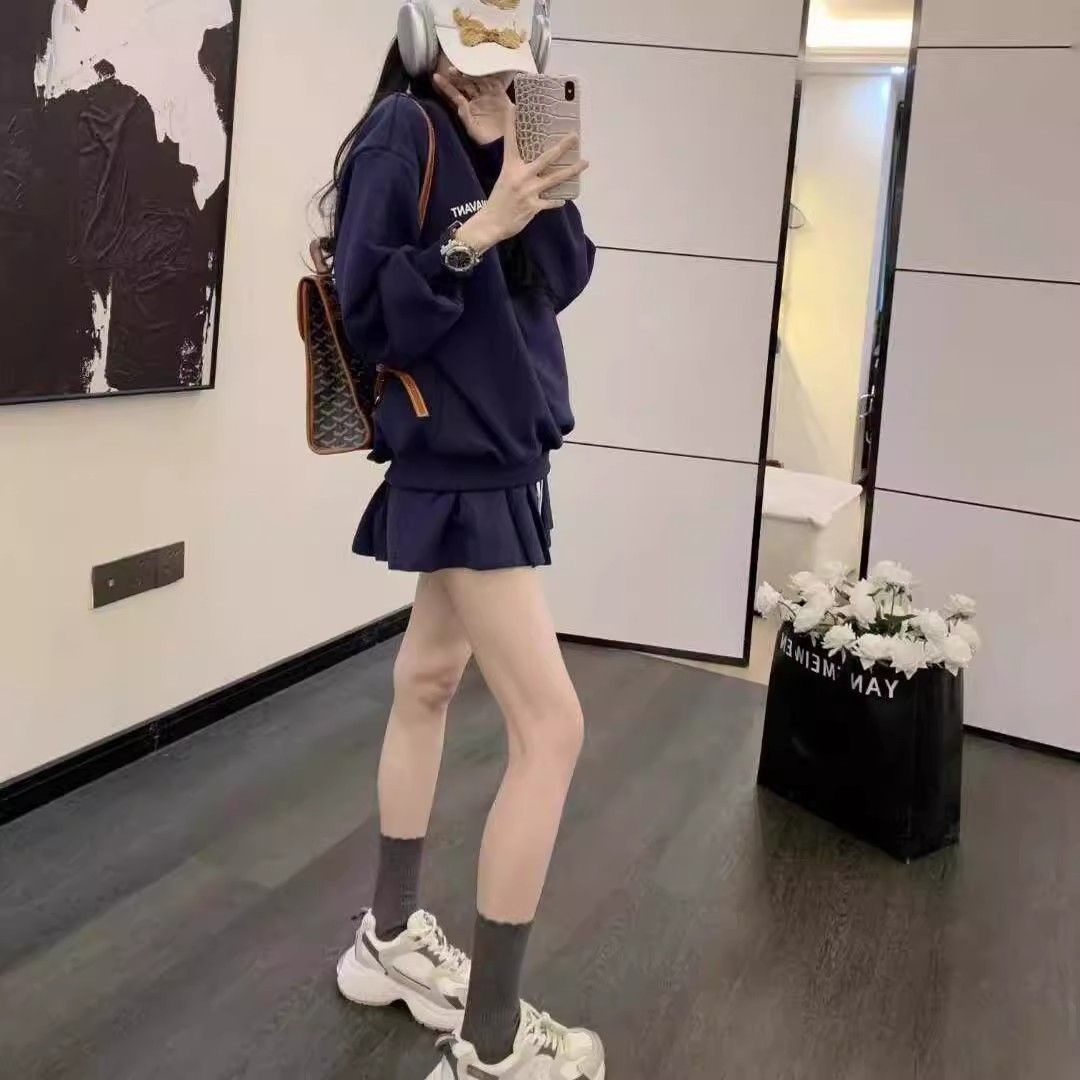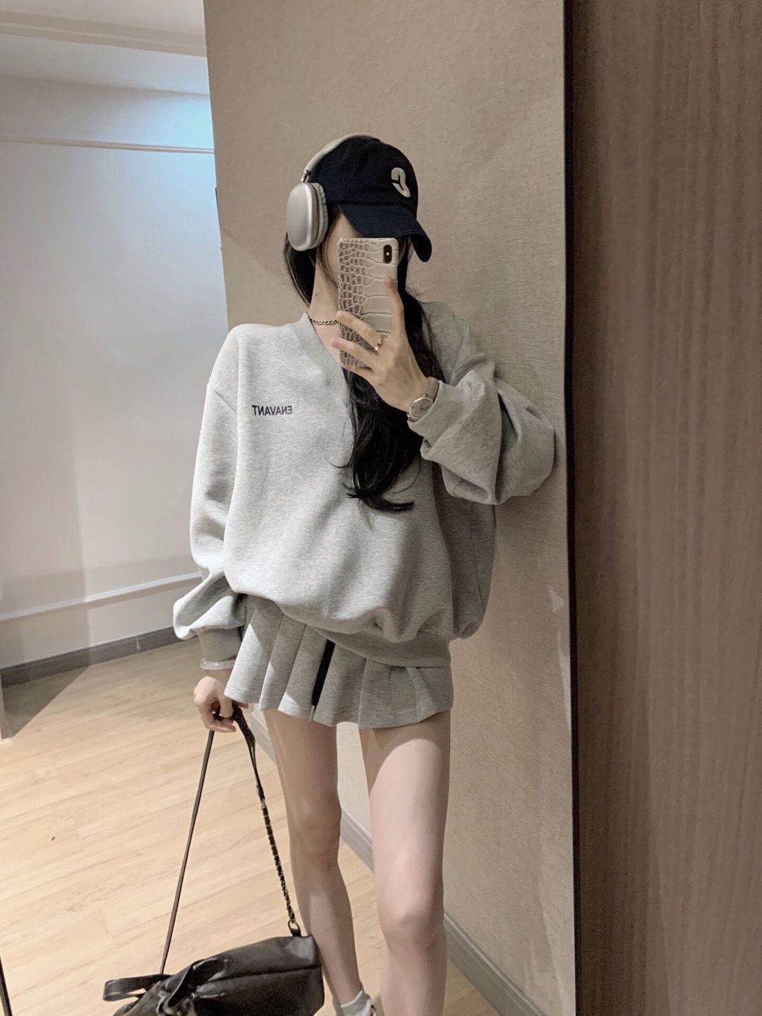 유럽 봄 가을 뉴 세트 여성 한국식 패션 캐주얼 스포츠 V 넥 스웨트 셔츠 플리츠 스커트 에이지 줄이기 투 피스 세트스토어 가기