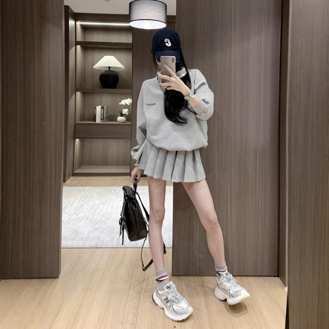 유럽 봄 가을 뉴 세트 여성 한국식 패션 캐주얼 스포츠 V 넥 스웨트 셔츠 플리츠 스커트 에이지 줄이기 투 피스 세트