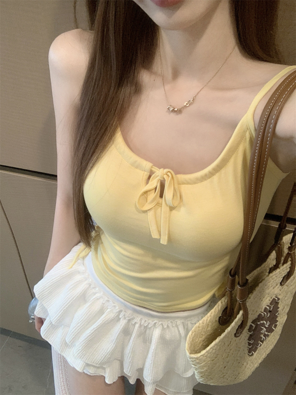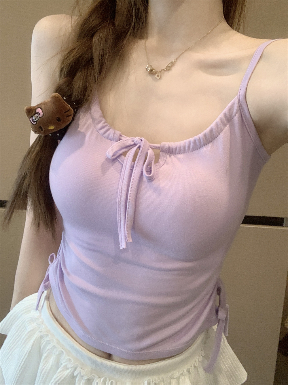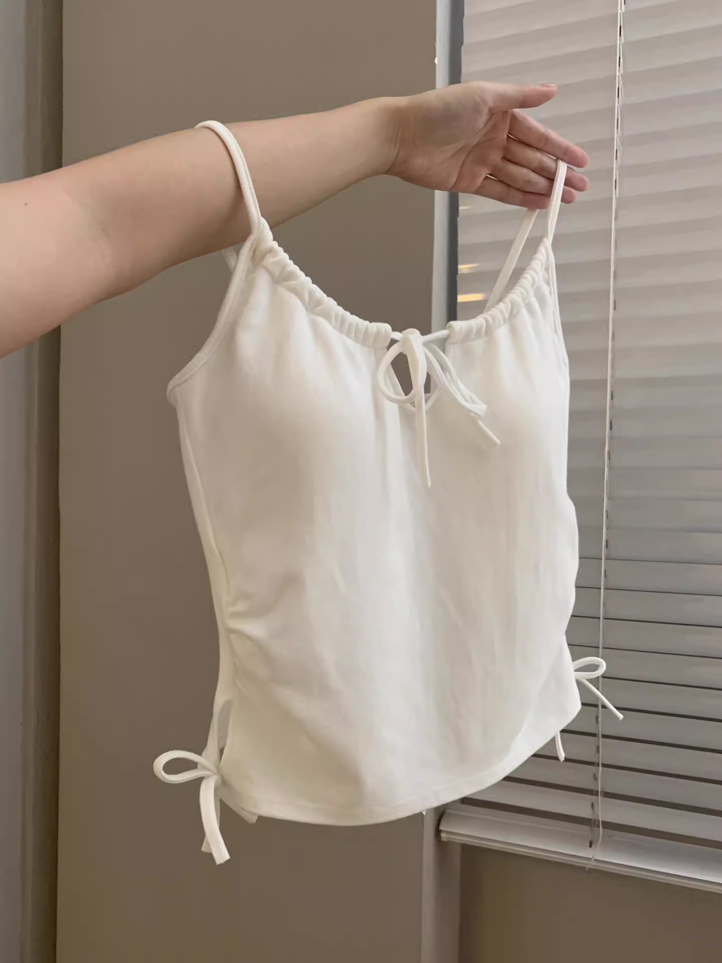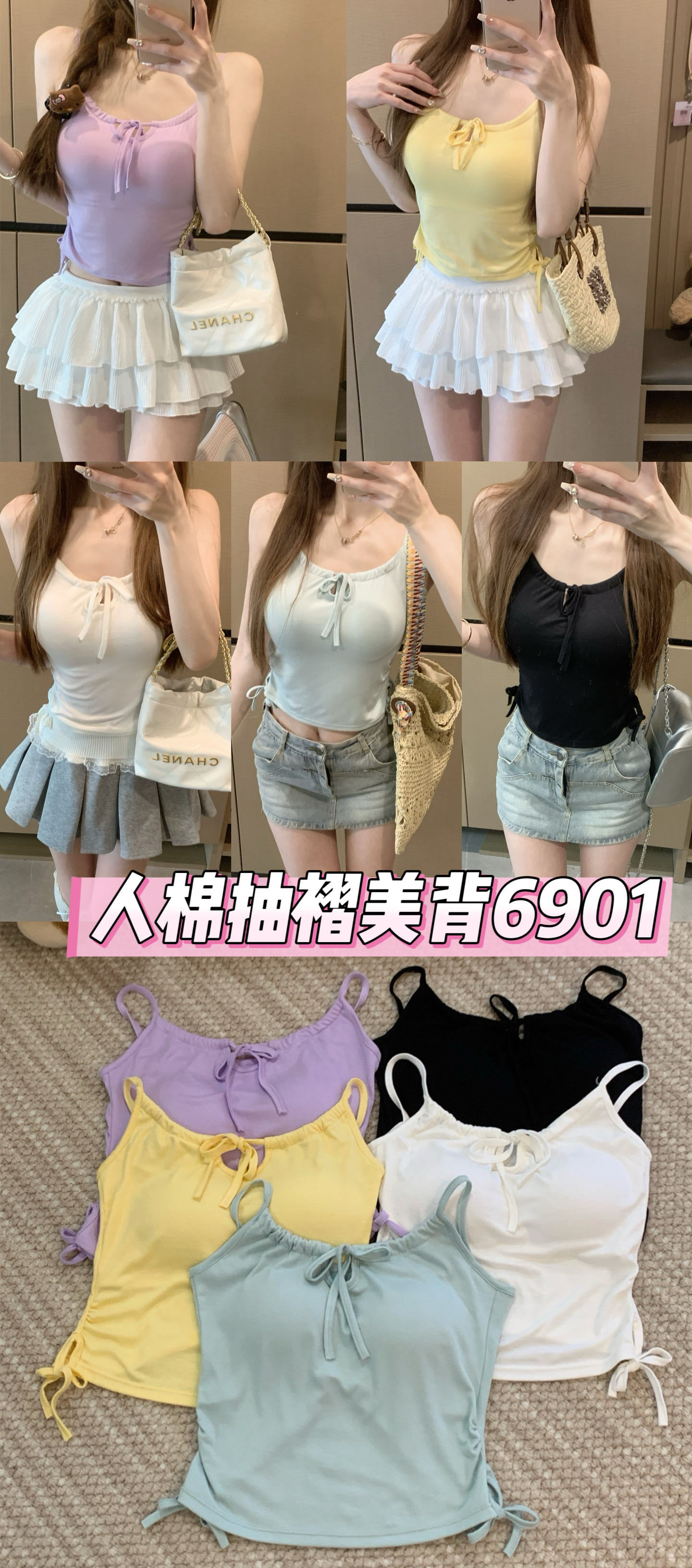 6901 # Sweet Spice Girl Drawstring 레이스 카미솔 여름 슬림 핏 슬림 짧은 외부 착용 민소매 아름다운 백탑