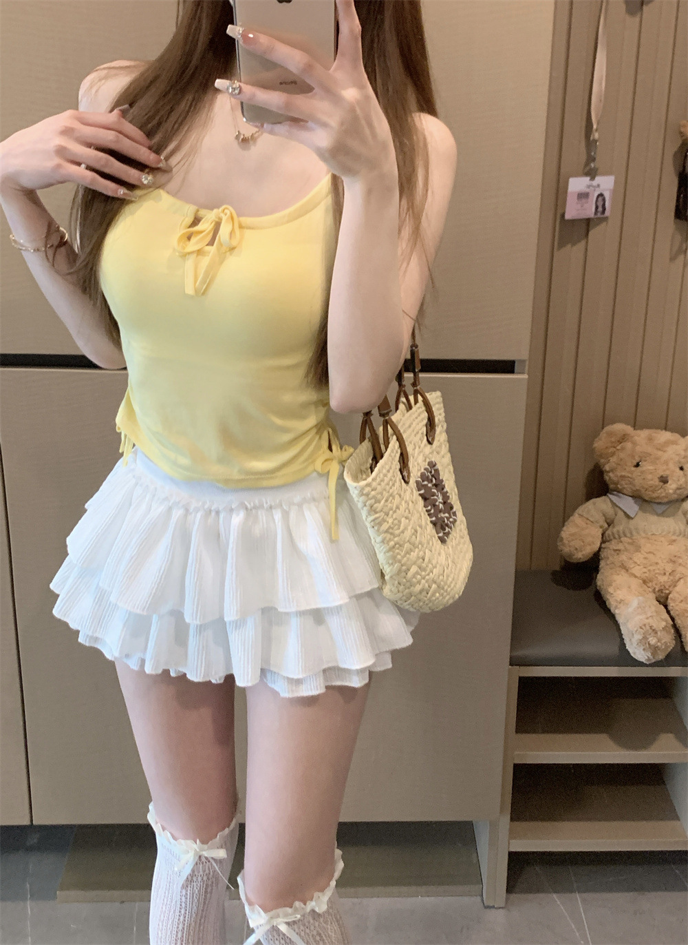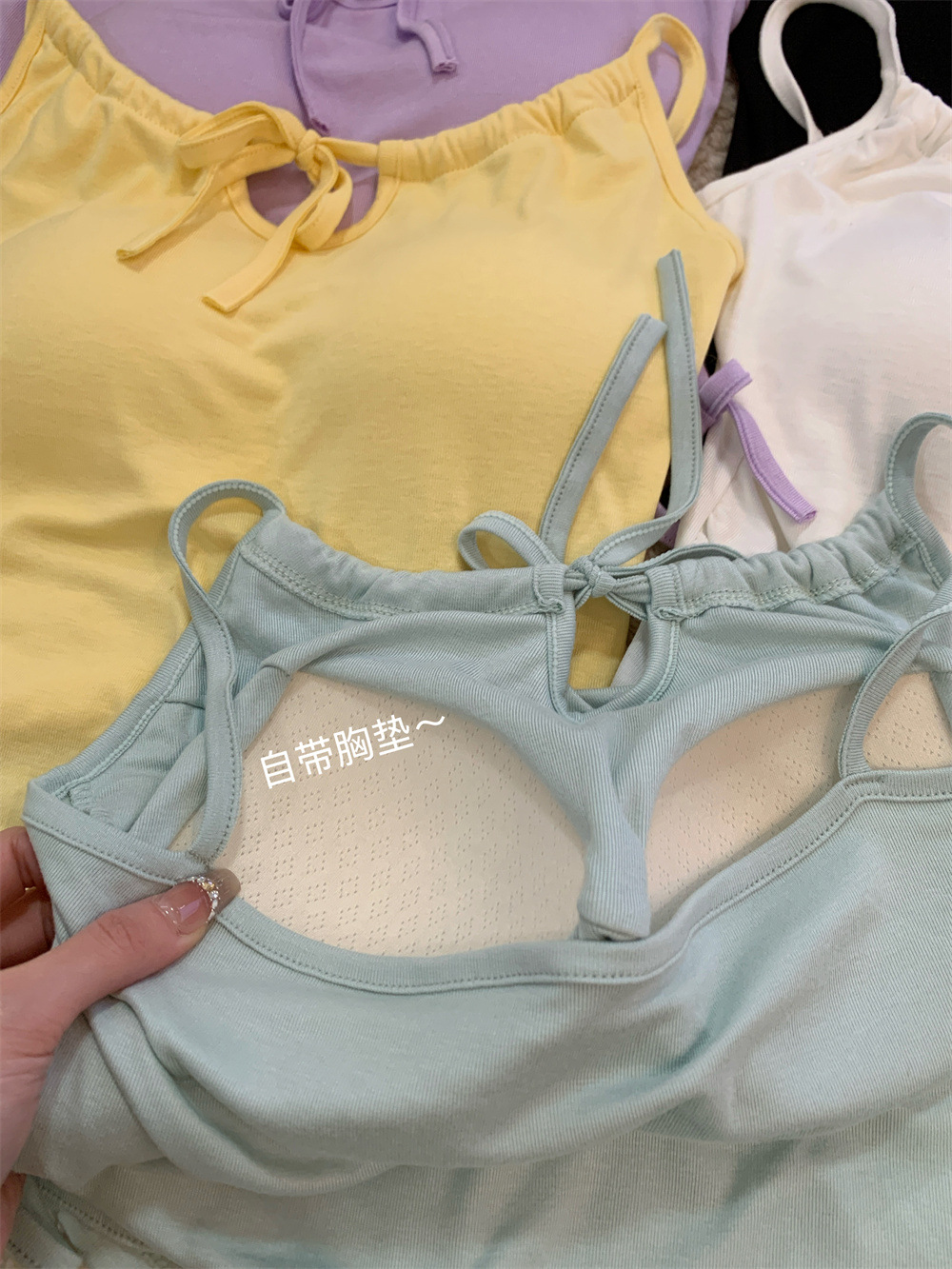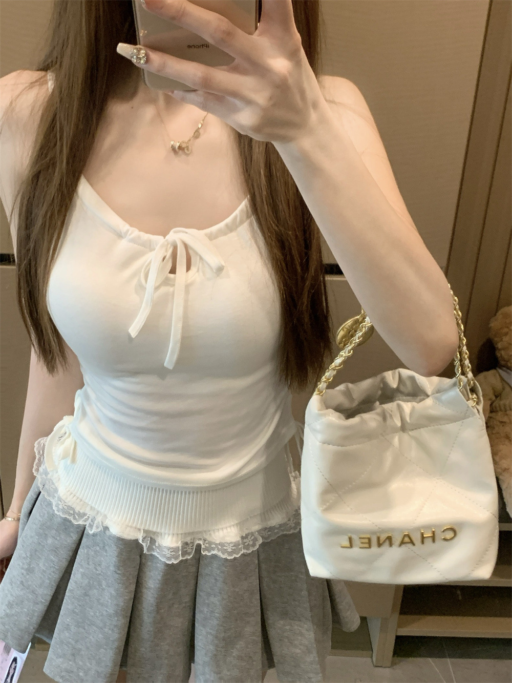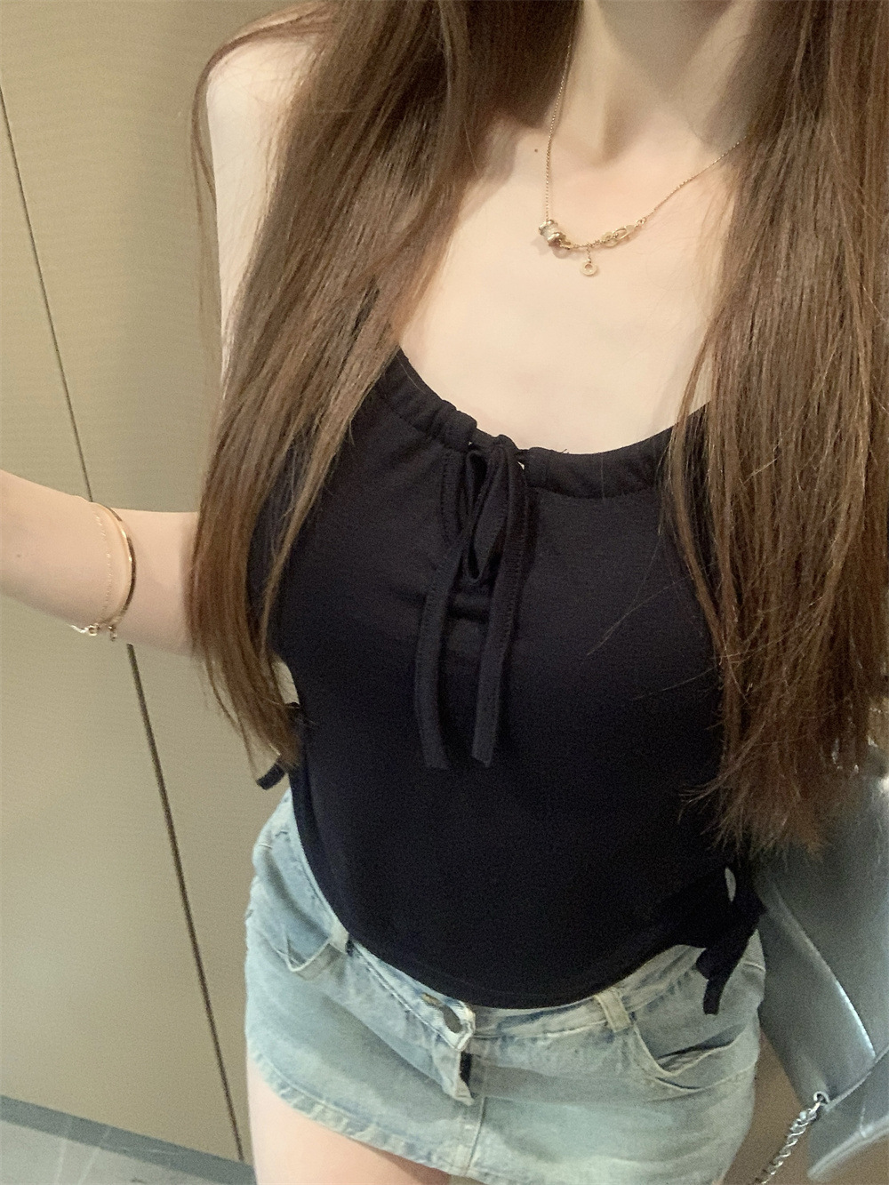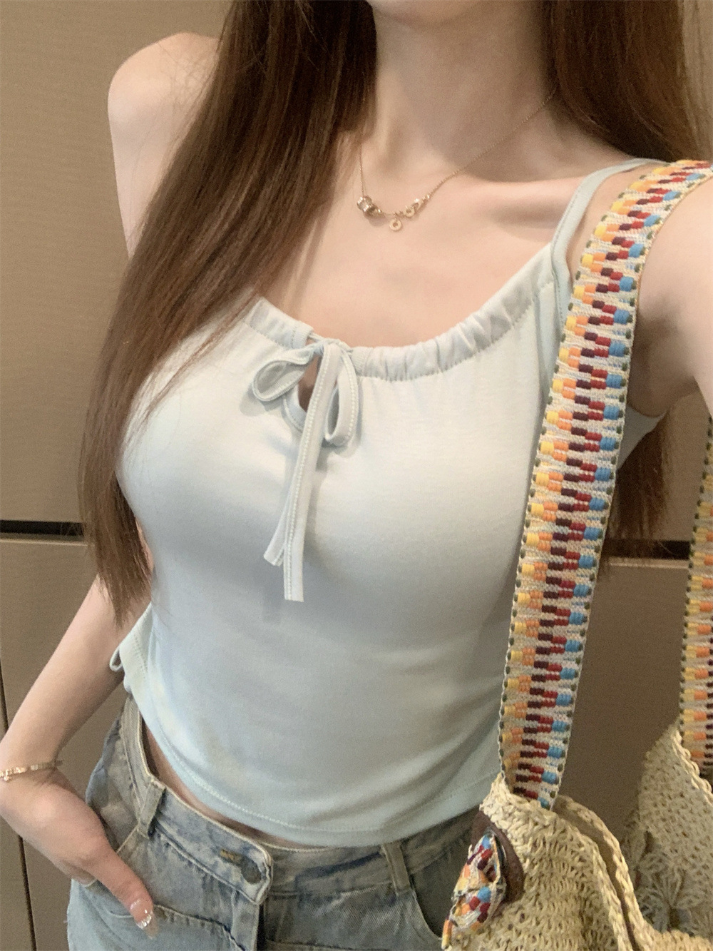 6901 # Sweet Spice Girl Drawstring 레이스 카미솔 여름 슬림 핏 슬림 짧은 외부 착용 민소매 아름다운 백탑
