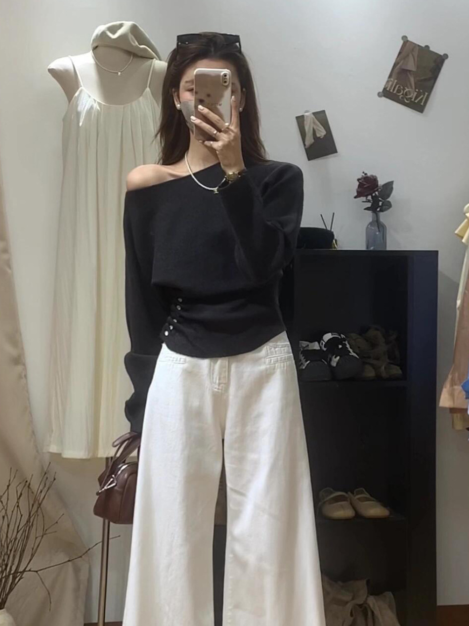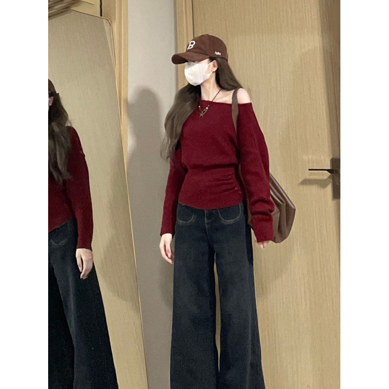 여성의 봄과 가을 새로운 하이 엔드 스타일 게으른 스타일 타이트 허리 오픈 숄더 느슨한 슬림 핏 긴팔 스웨터 탑스토어 가기