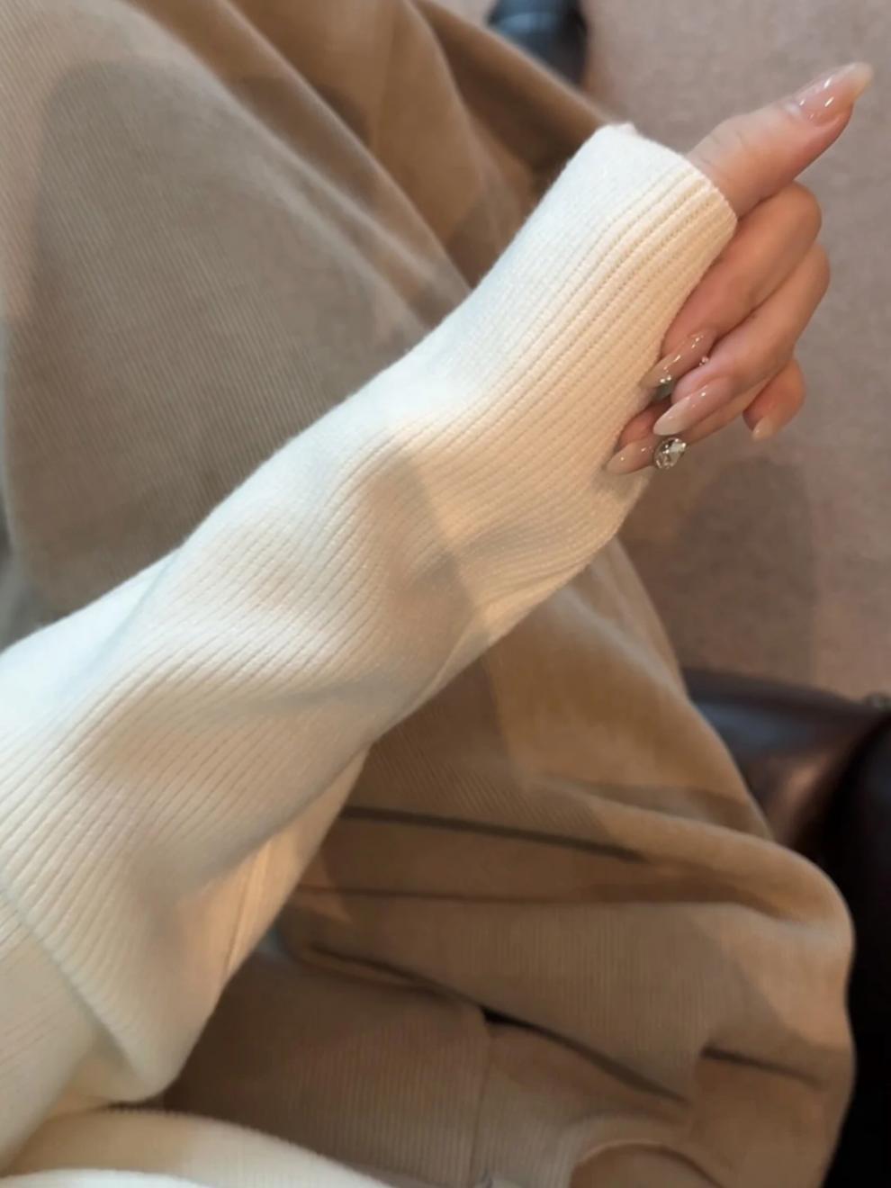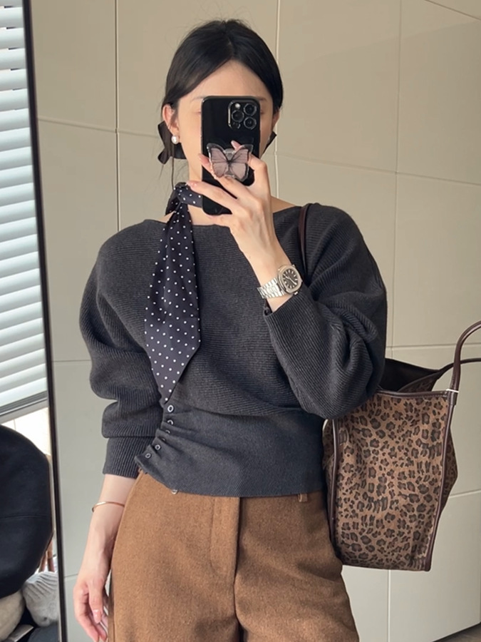 여성의 봄과 가을 새로운 하이 엔드 스타일 게으른 스타일 타이트 허리 오픈 숄더 느슨한 슬림 핏 긴팔 스웨터 탑