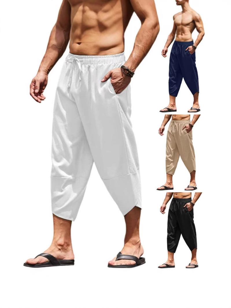 2025 Amazon Independent Station 새로운 남성용 코튼 및 리넨 솔리드 컬러 느슨한 드로우 스트링 크롭 팬츠 캐주얼 반바지