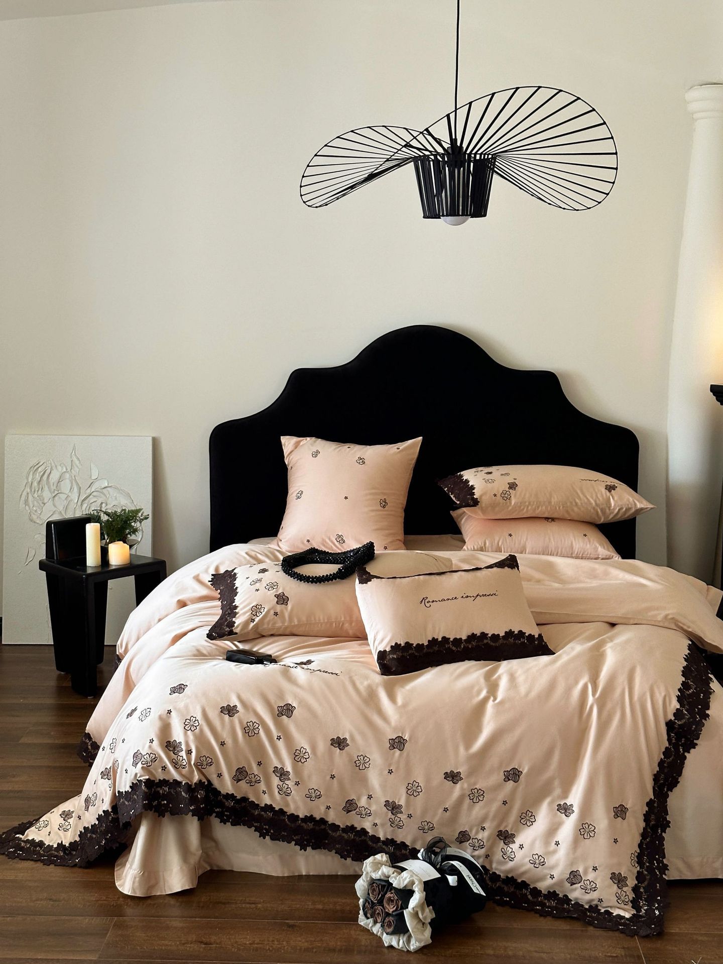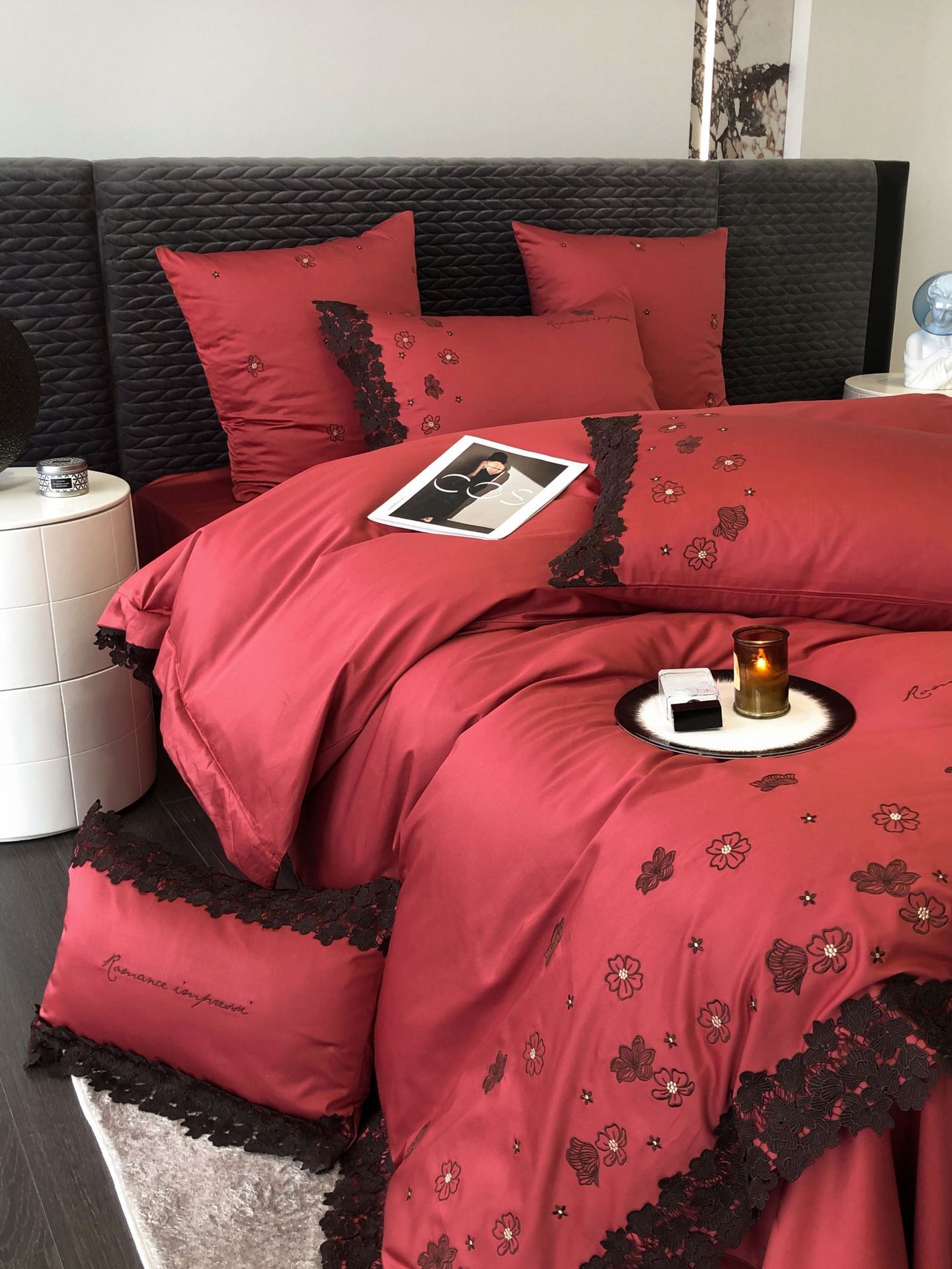 프렌치 라이트 럭셔리 100 면 4 피스 세트 로맨틱 플라워 자수 레이스 코튼 퀼트 커버 부드럽고 편안한 알몸 슬리핑
