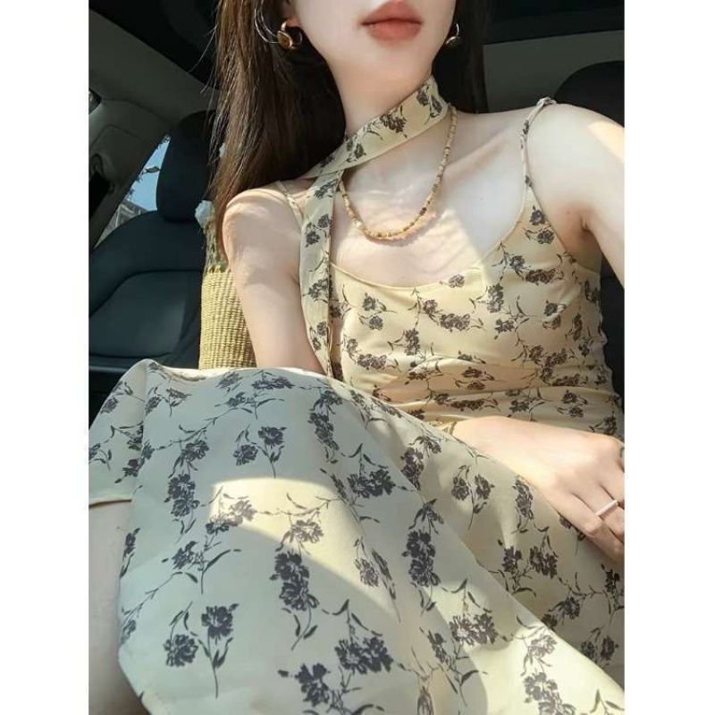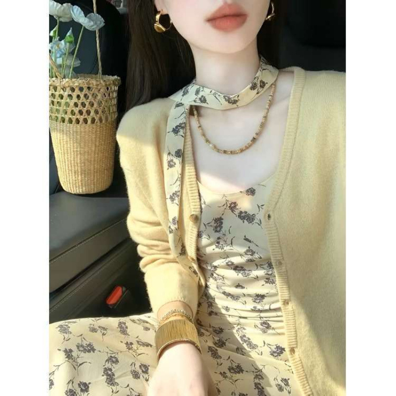 봄과 가을은 차 브레이크 프랑스 휴가 로맨틱 빈티지 꽃 슬링 원피스 카디건 세트 완벽한 세트를 착용하십시오.스토어 가기