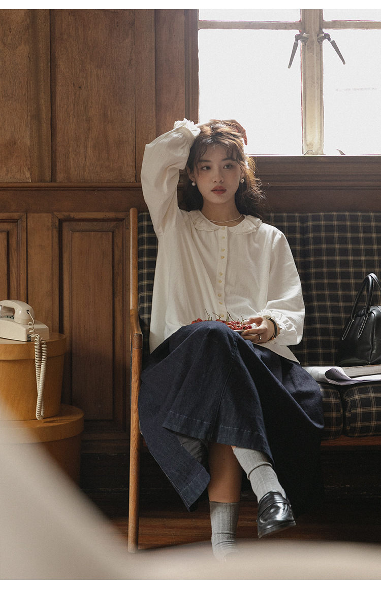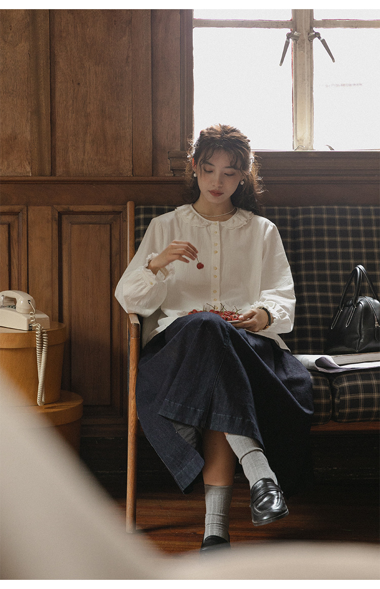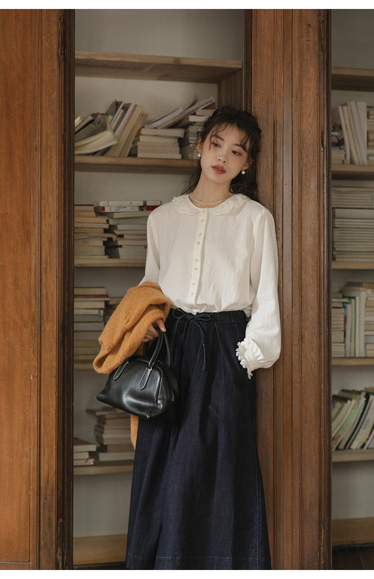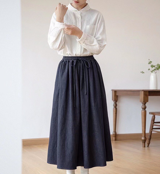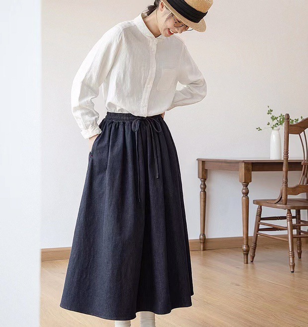 봄과 가을 새로운 데님 치마 작은 높은 허리 레이스 업 느슨한 캐주얼 A 라인 긴 치마