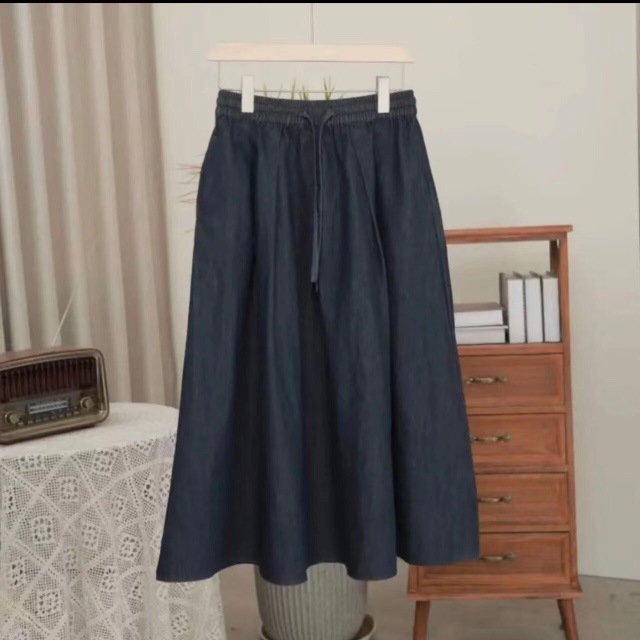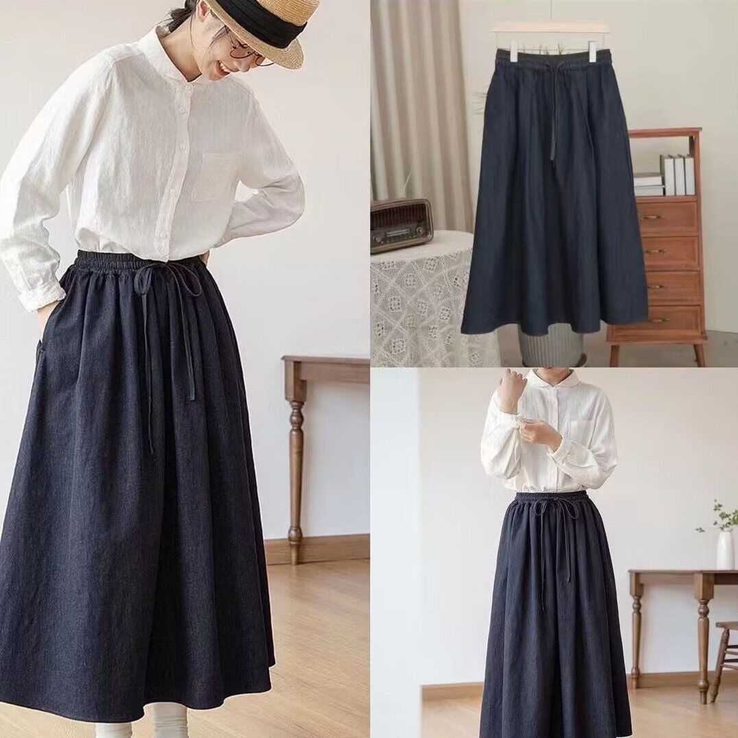 봄과 가을 새로운 데님 치마 작은 높은 허리 레이스 업 느슨한 캐주얼 A 라인 긴 치마스토어 가기