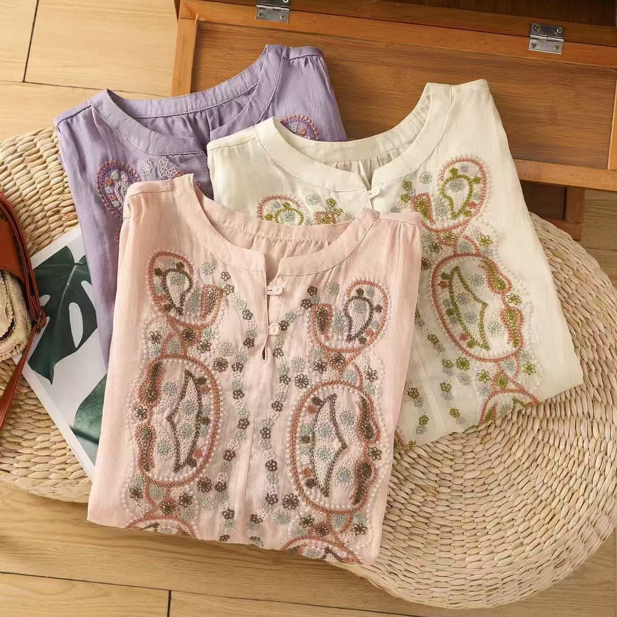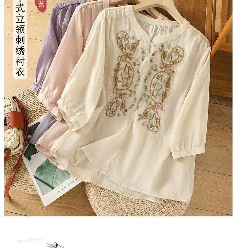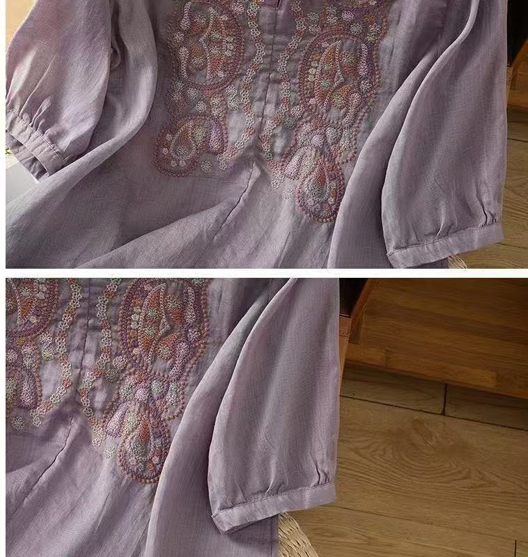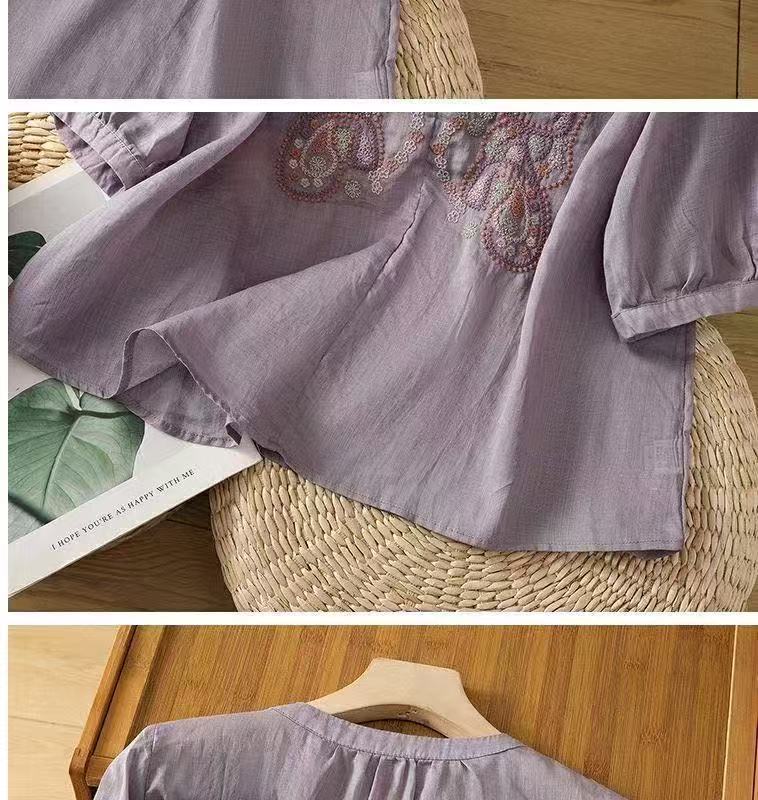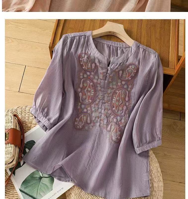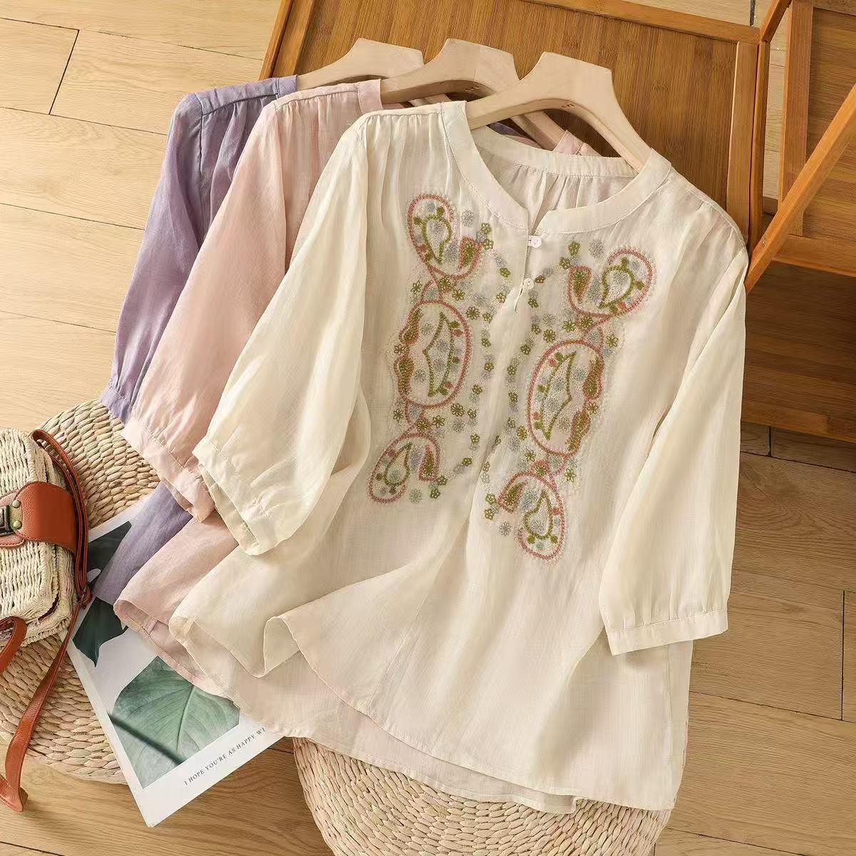 2024 년 여름 새로운 라운드 넥 레트로 버클 5 포인트 슬리브 셔츠 예술적 자수 로터스 하프 플래켓 풀오버 티셔츠