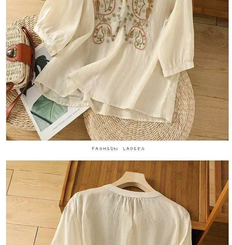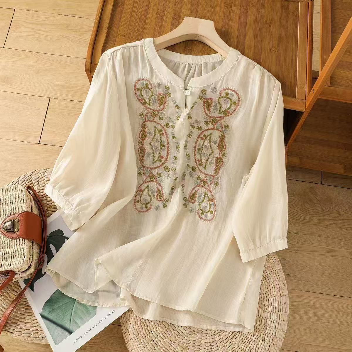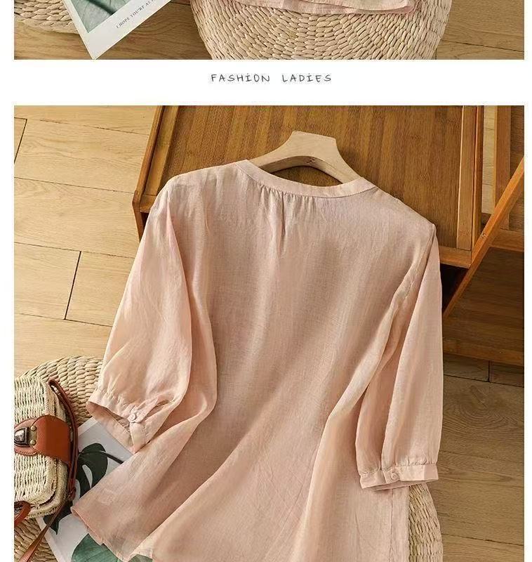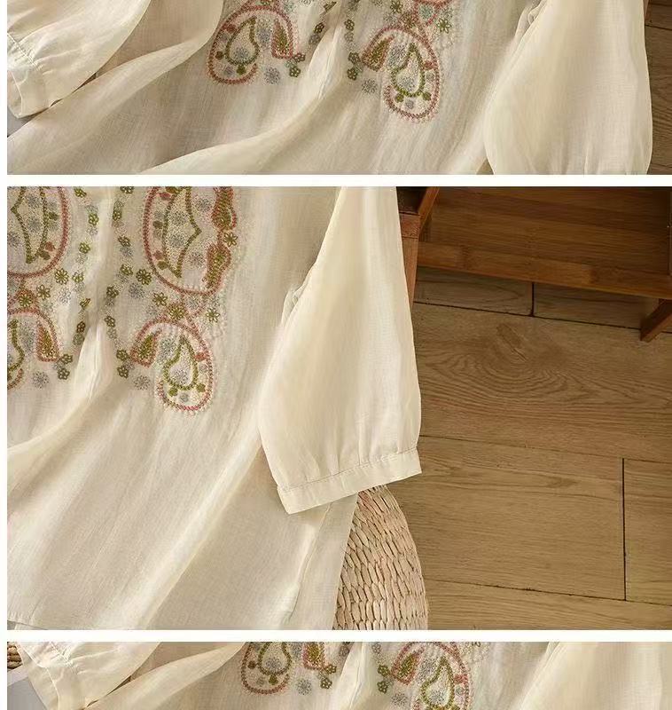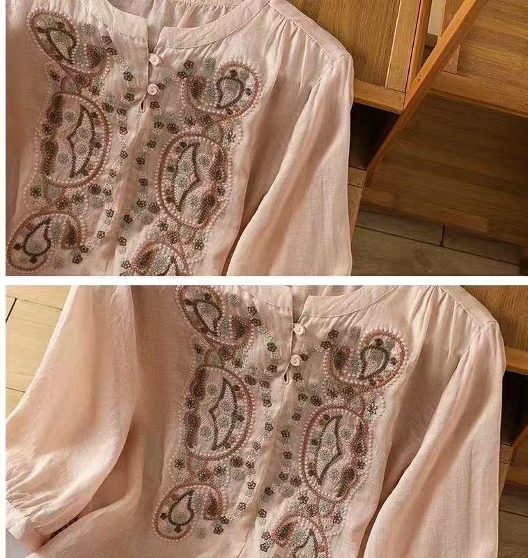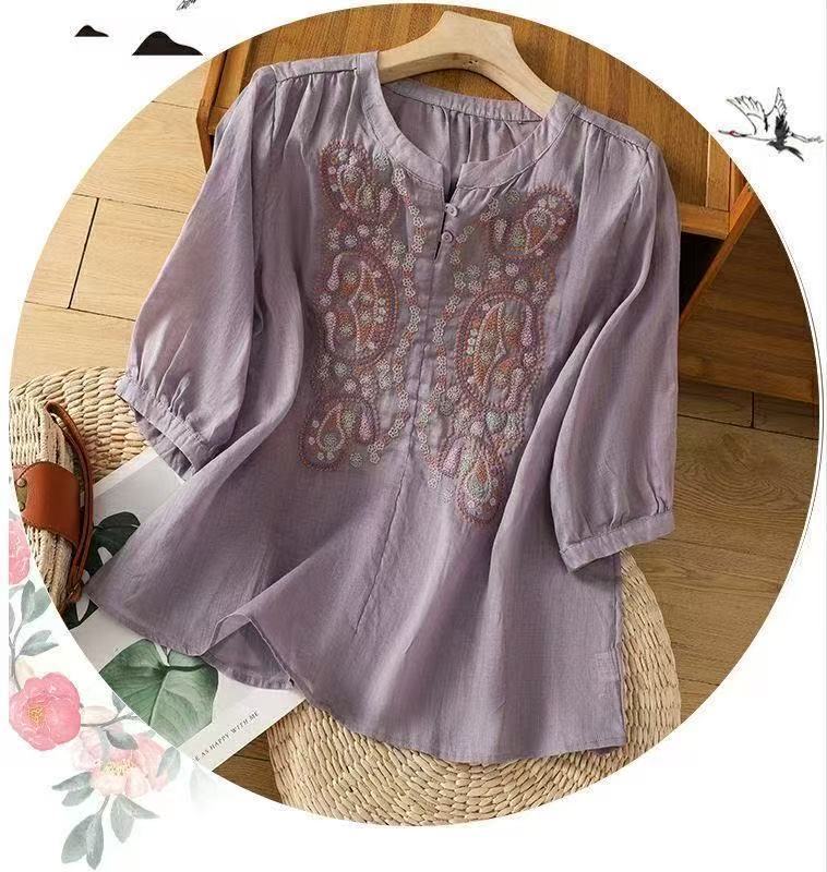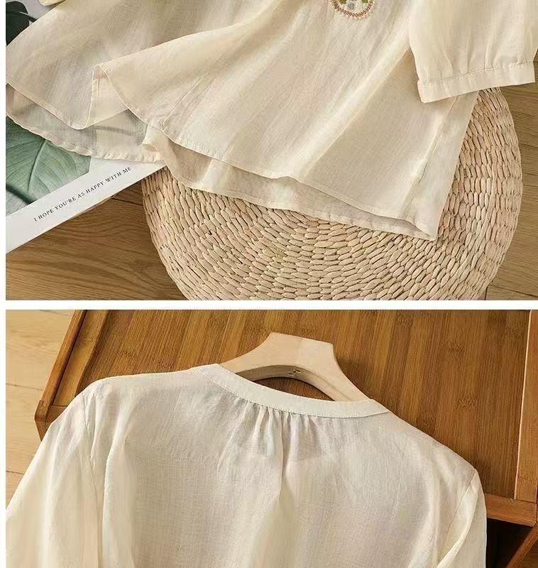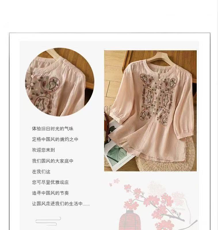 2024 년 여름 새로운 라운드 넥 레트로 버클 5 포인트 슬리브 셔츠 예술적 자수 로터스 하프 플래켓 풀오버 티셔츠