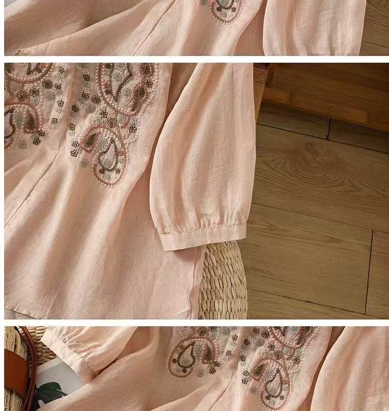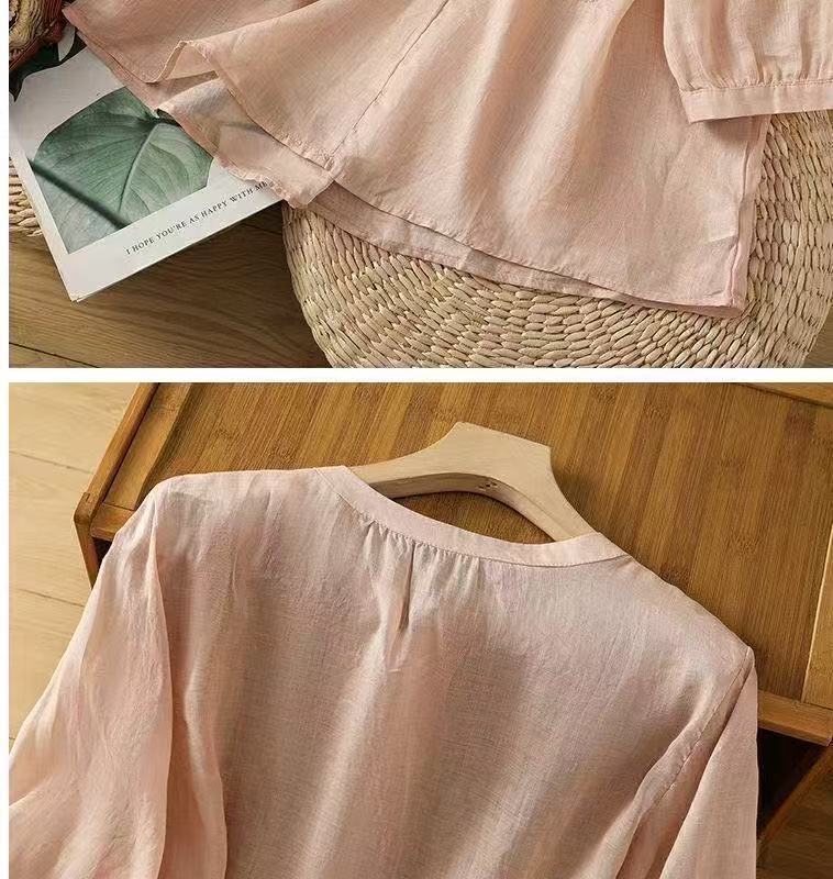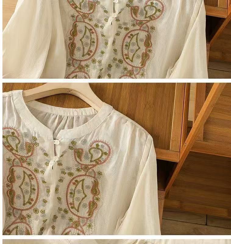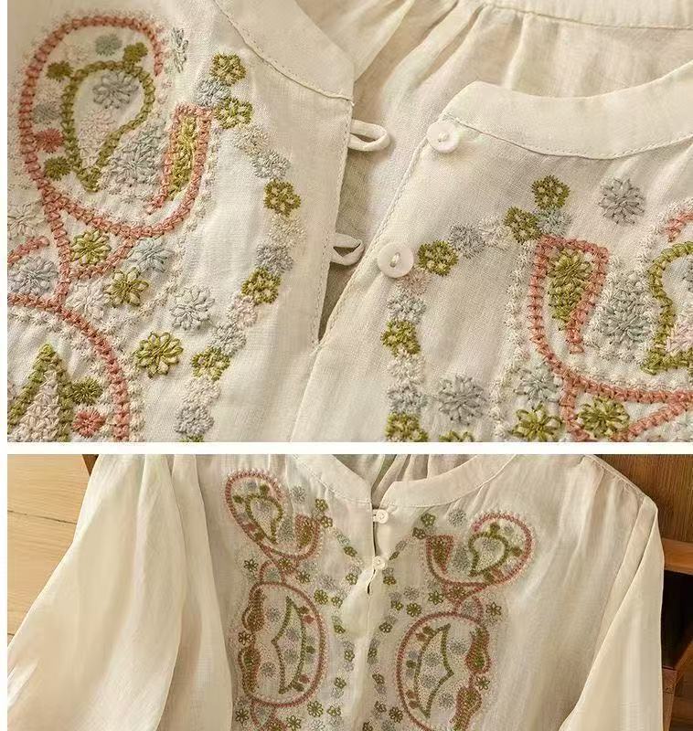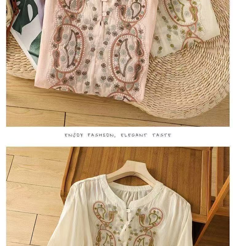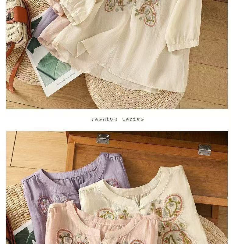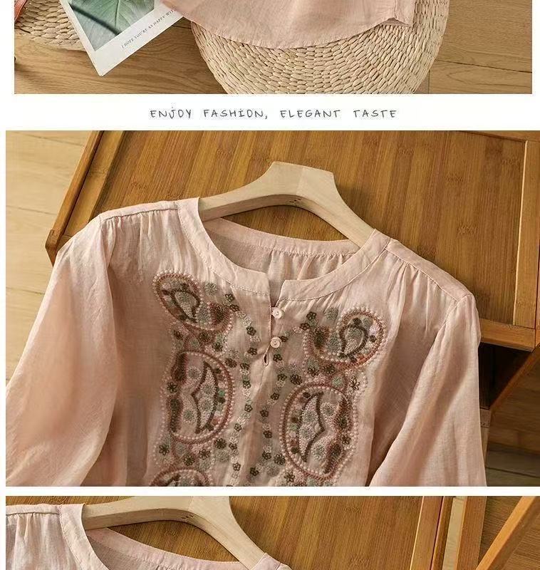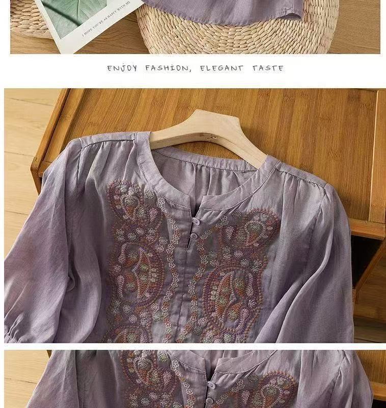 2024 년 여름 새로운 라운드 넥 레트로 버클 5 포인트 슬리브 셔츠 예술적 자수 로터스 하프 플래켓 풀오버 티셔츠