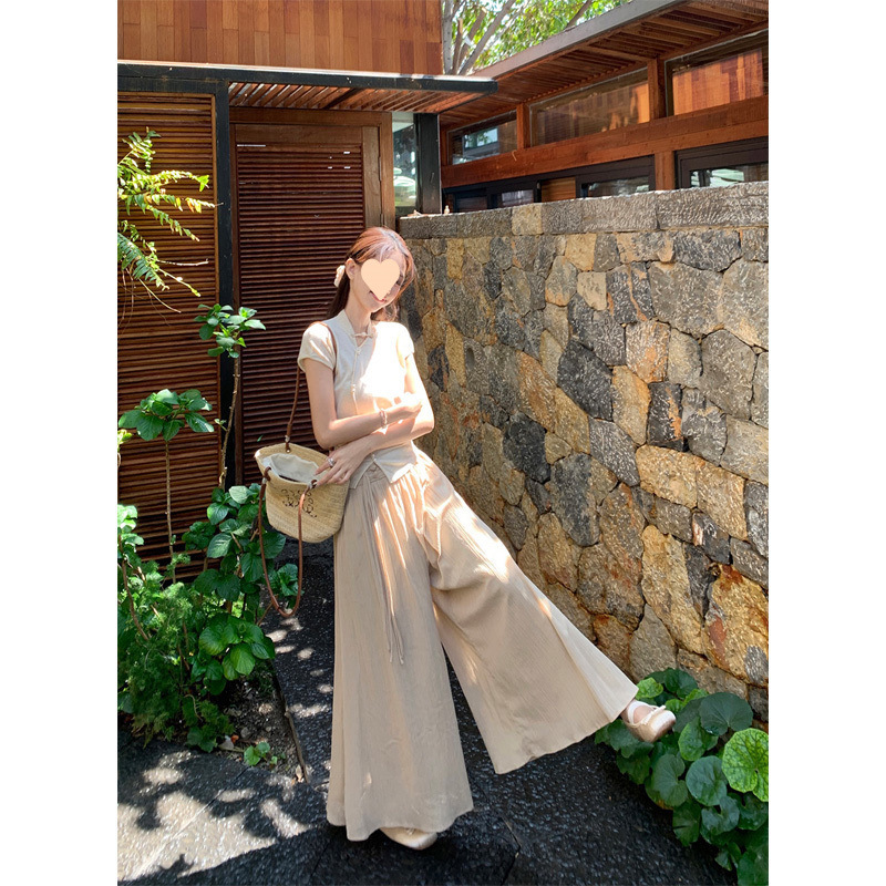 2025 년 여름 새로운 중국 스타일 버클 디자인 센스 작은 스탠드 칼라 반팔 셔츠 여성용 Fluttering Culottes 투피스 세트스토어 가기