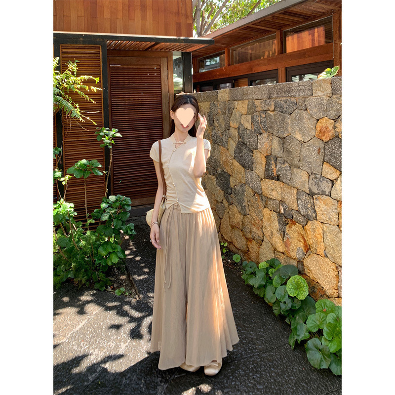 2025 년 여름 새로운 중국 스타일 버클 디자인 센스 작은 스탠드 칼라 반팔 셔츠 여성용 Fluttering Culottes 투피스 세트