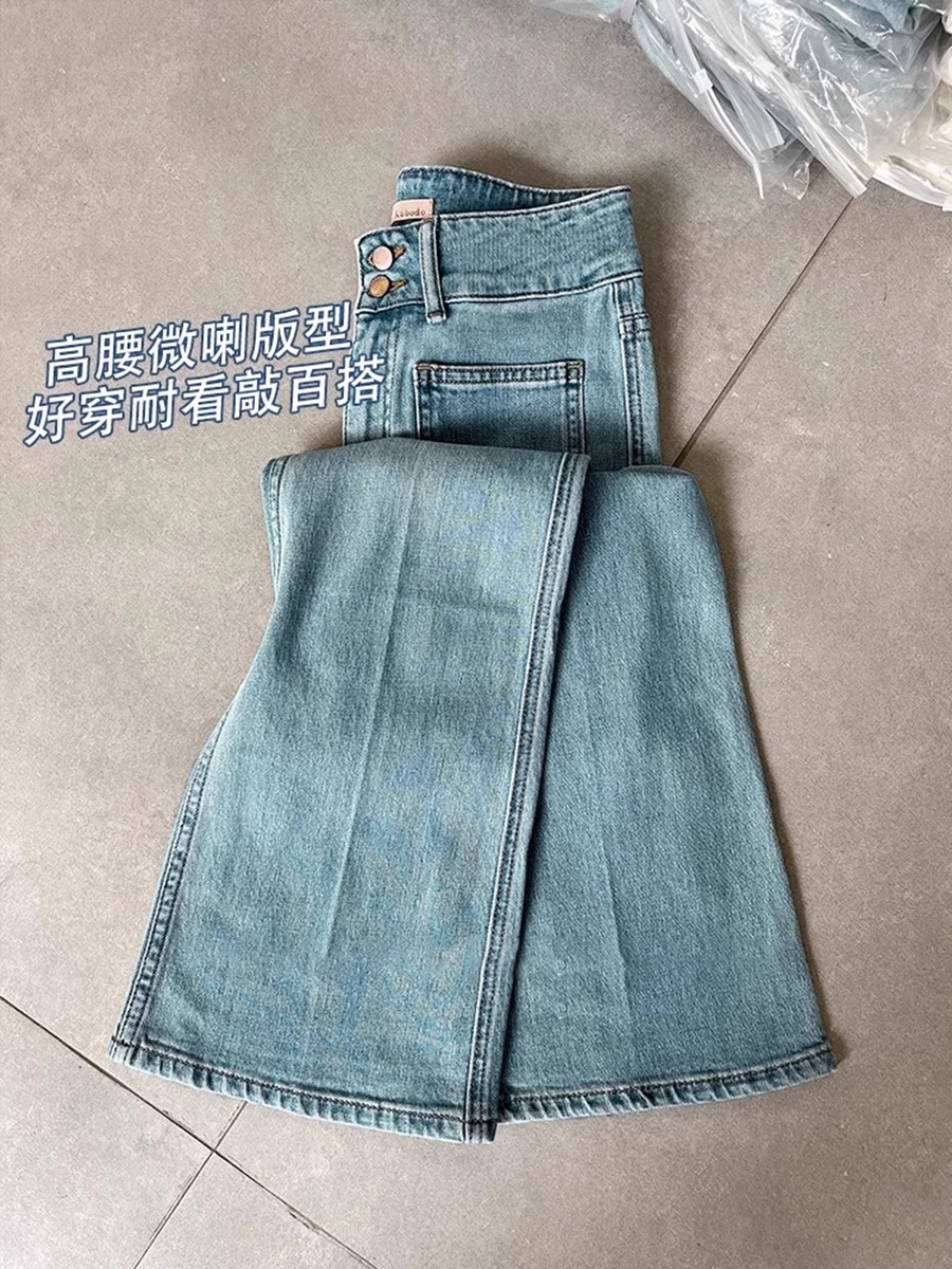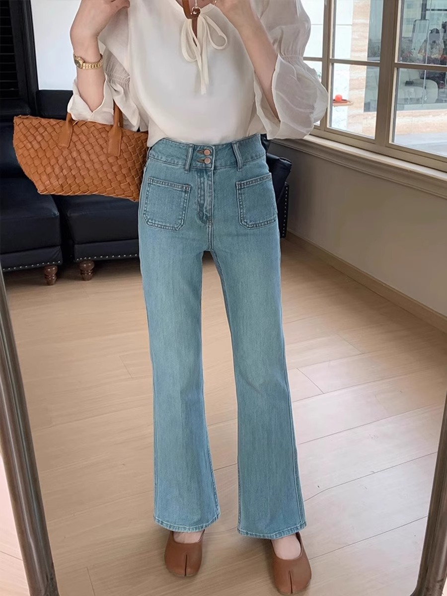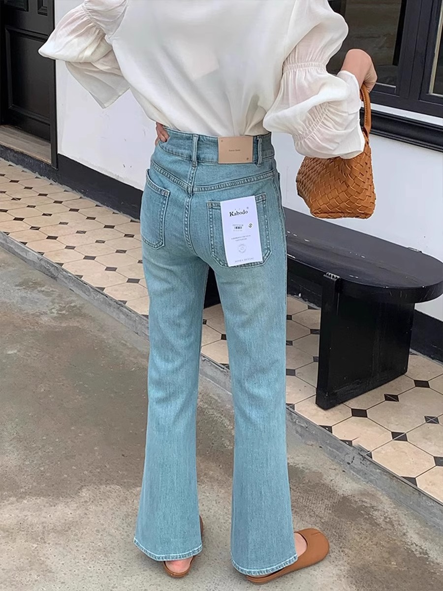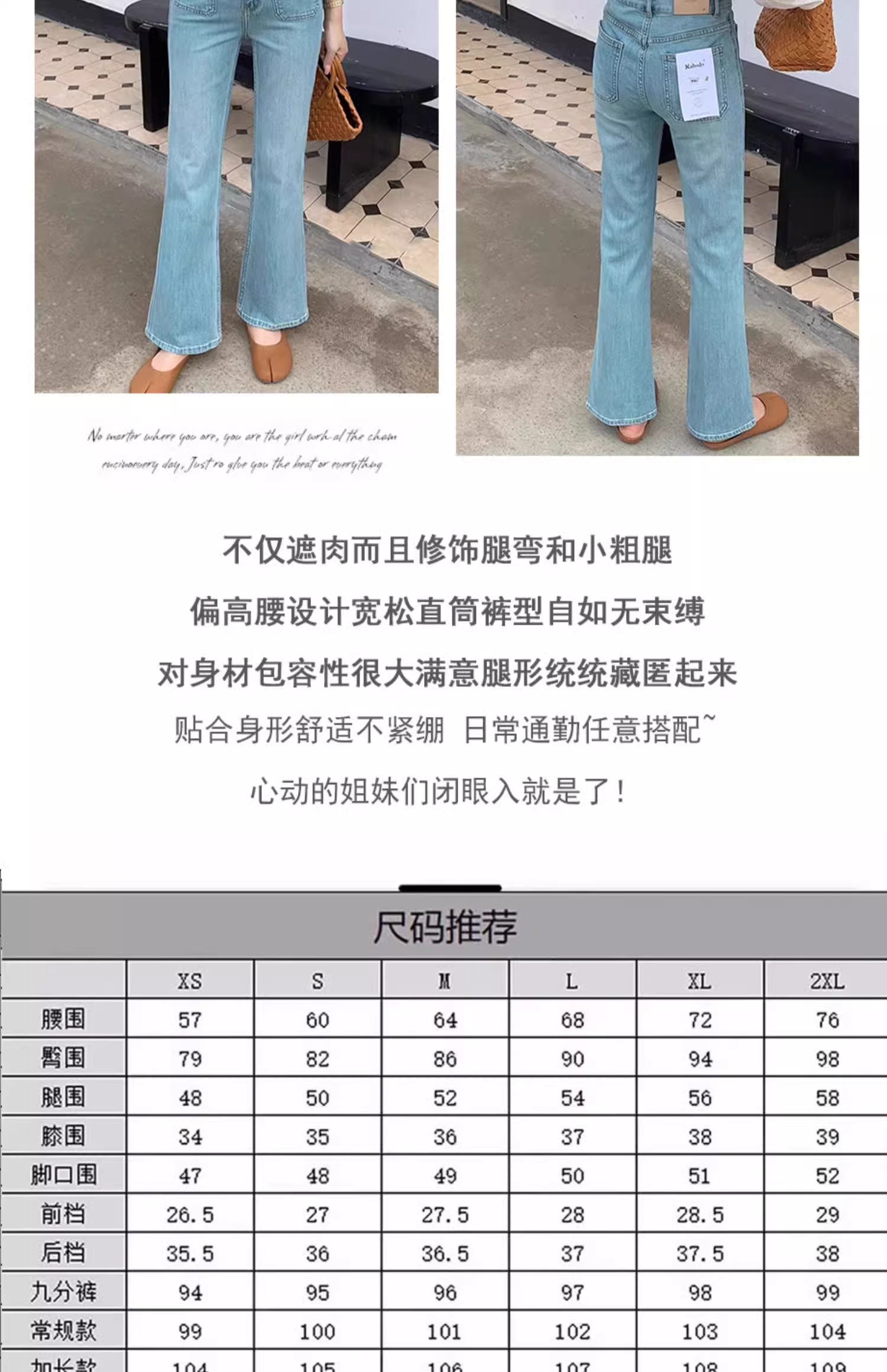 라이트 블루 마이크로 라 청바지 여성의 여름 얇은 2024 새로운 스타일 작은 높은 허리 슬리밍 플레어 팬츠스토어 가기
