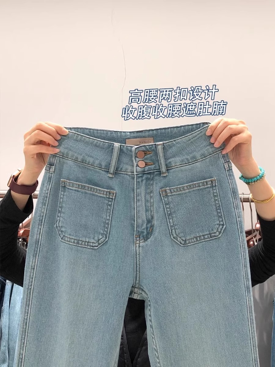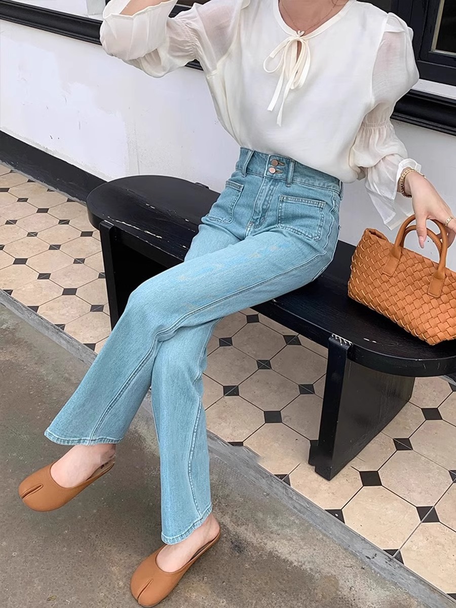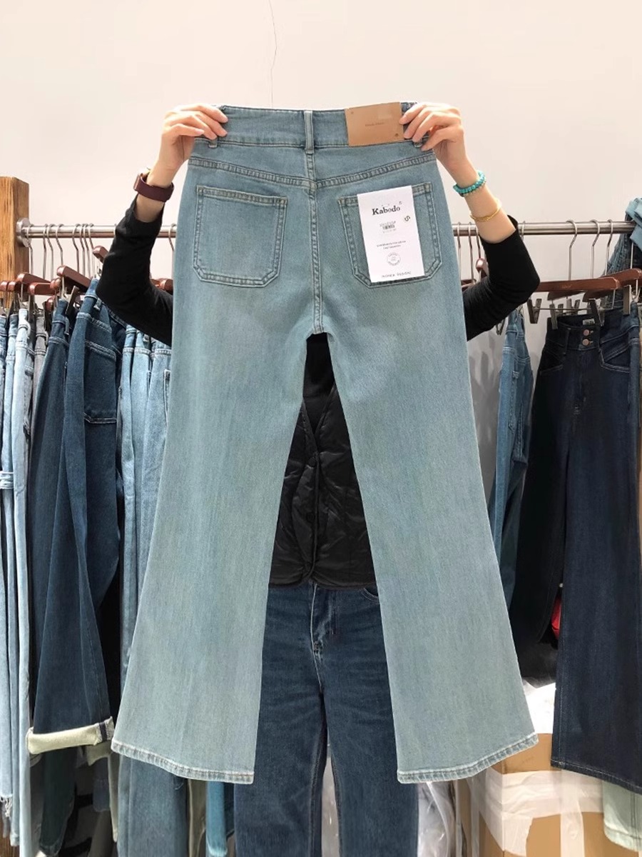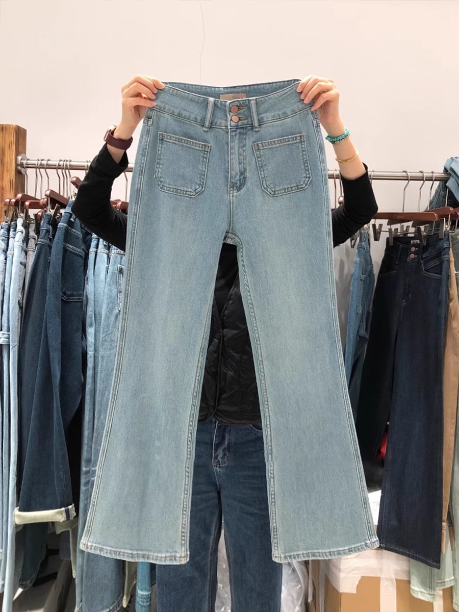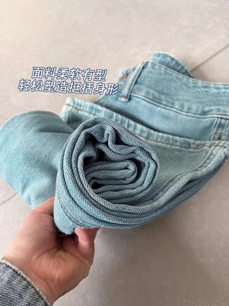 라이트 블루 마이크로 라 청바지 여성의 여름 얇은 2024 새로운 스타일 작은 높은 허리 슬리밍 플레어 팬츠스토어 가기