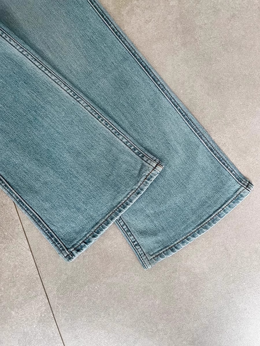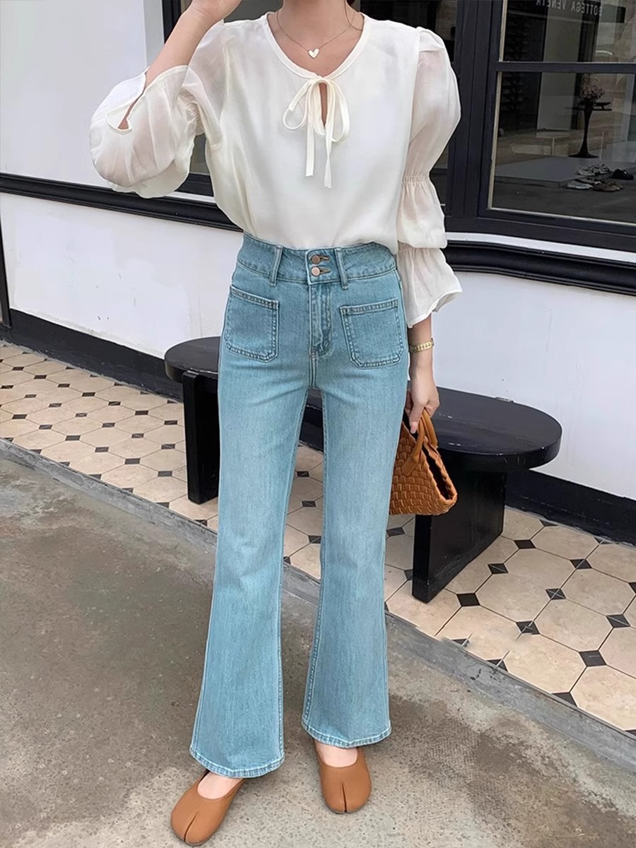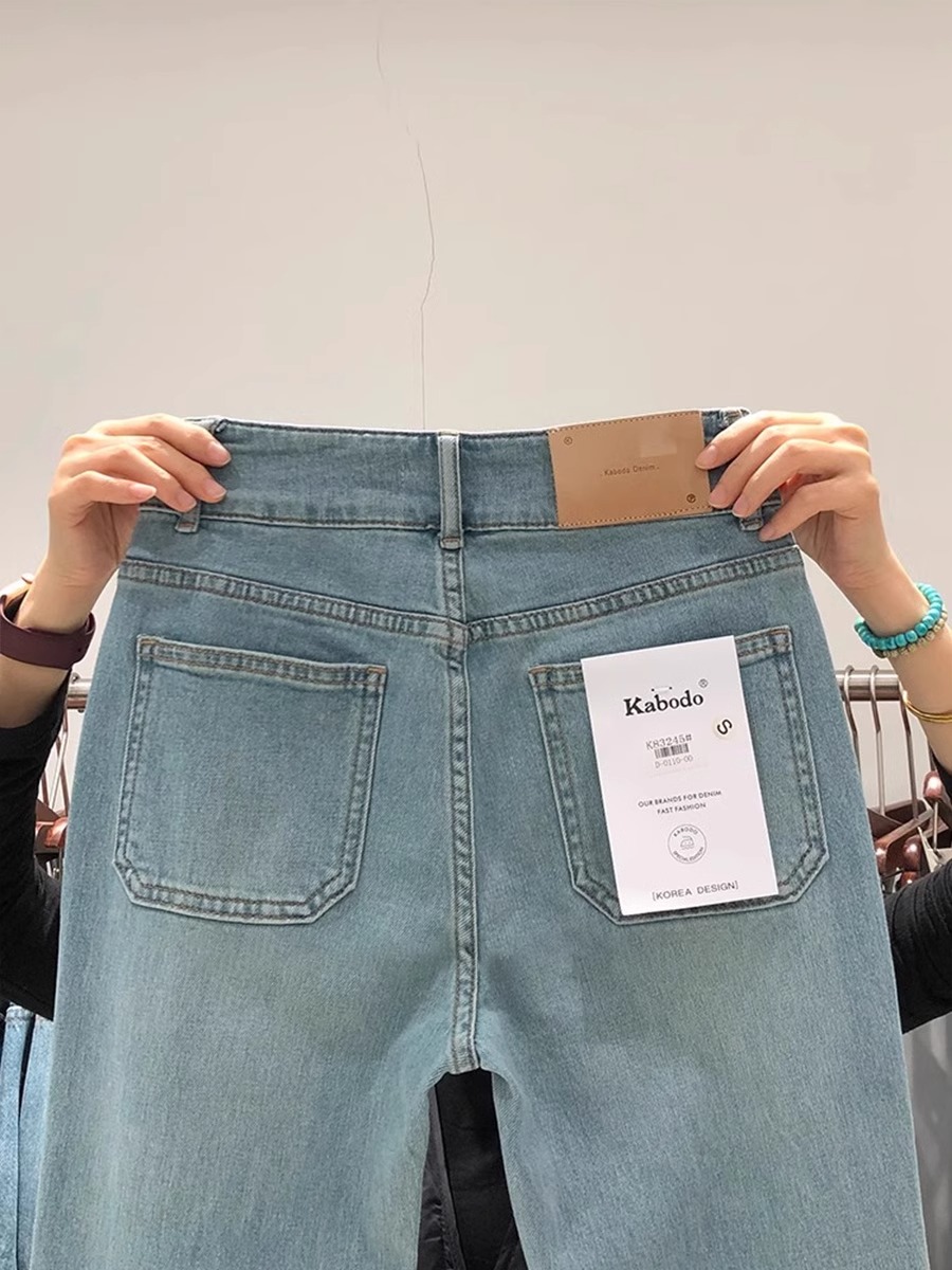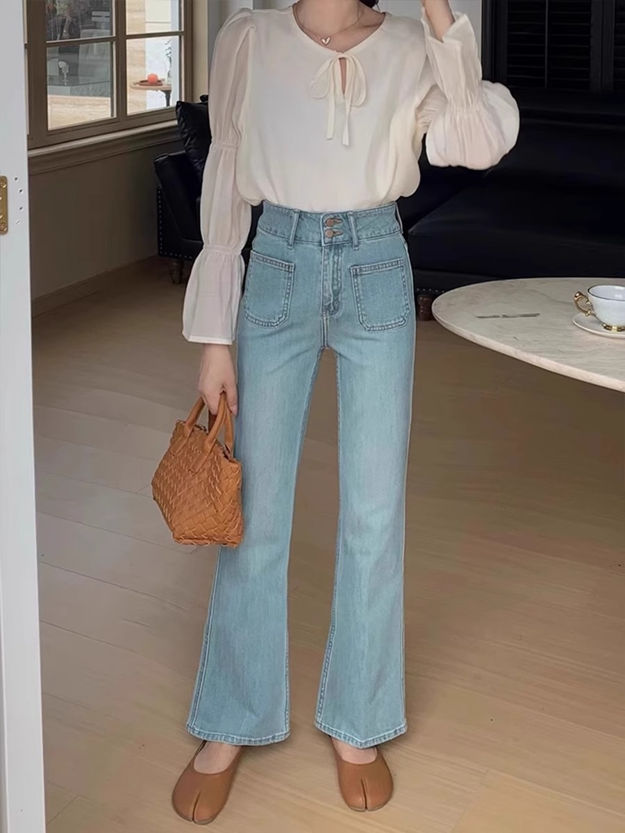 라이트 블루 마이크로 라 청바지 여성의 여름 얇은 2024 새로운 스타일 작은 높은 허리 슬리밍 플레어 팬츠스토어 가기
