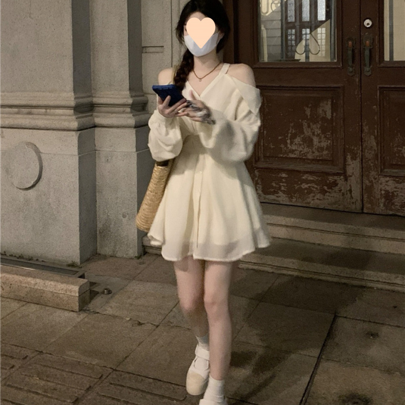 살구색 목 오프-어깨 긴팔 인테리어 반바지 원피스 세련된 세련된 우아한 타이트 허리 슬리밍 웨어 2 피스 세트