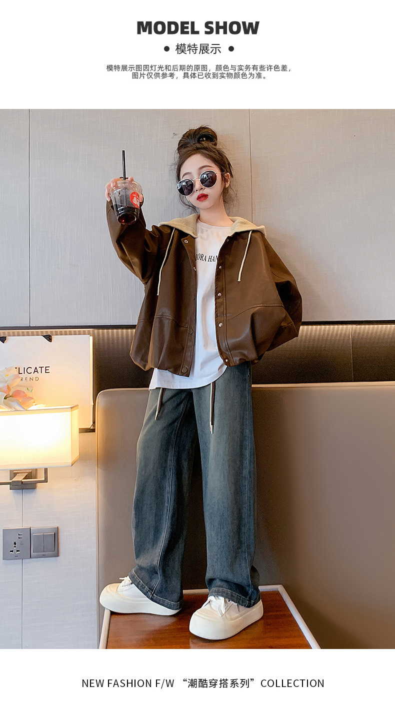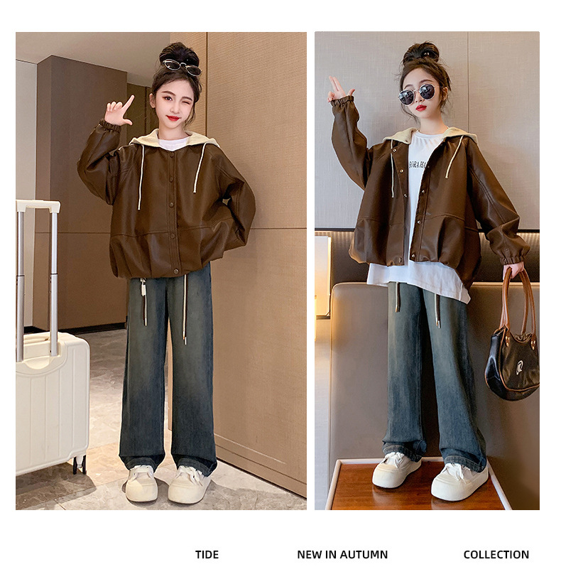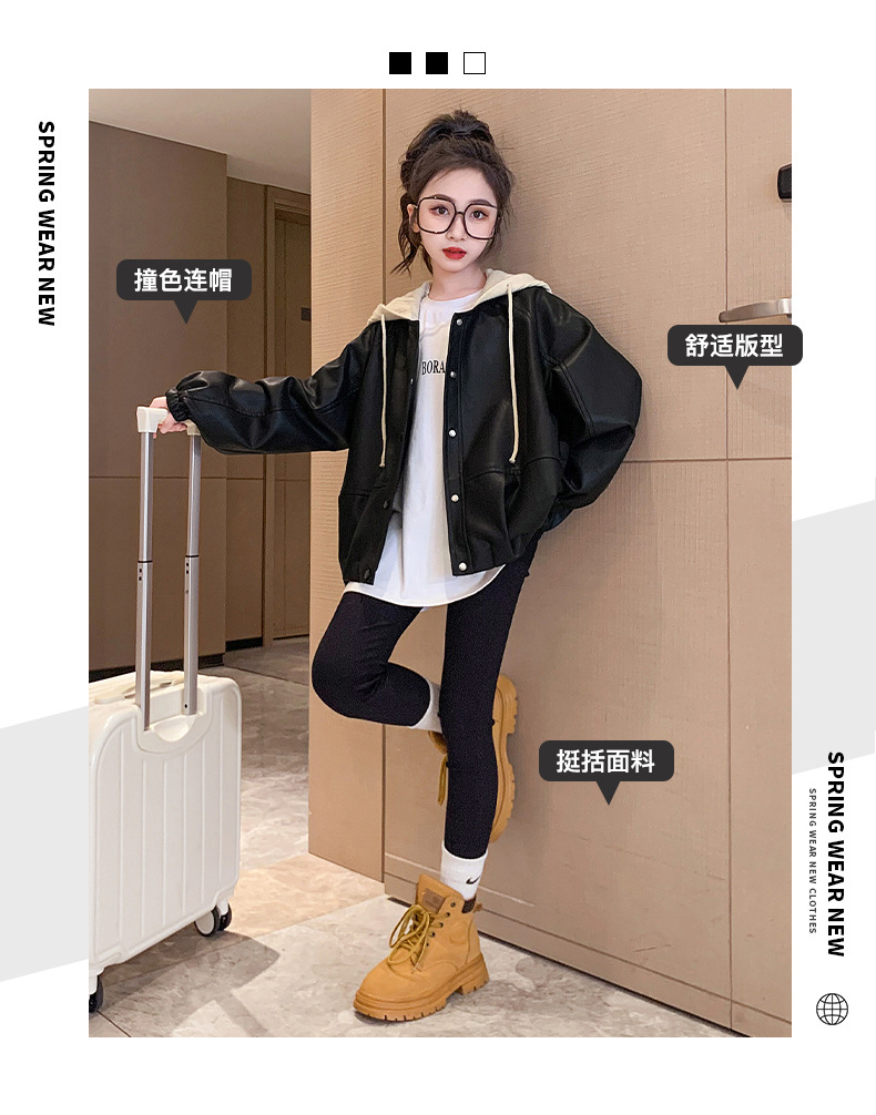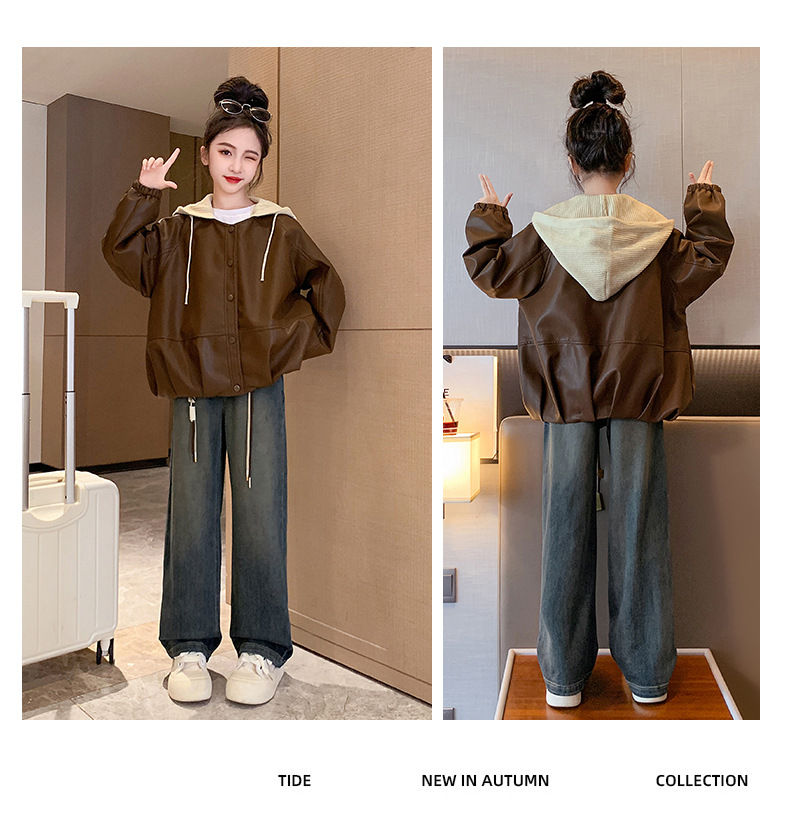 소녀 가죽 코트 봄과 가을 2025 새로운 어린이 가을 재킷 큰 아이 소녀 후드 탑 트렌디스토어 가기