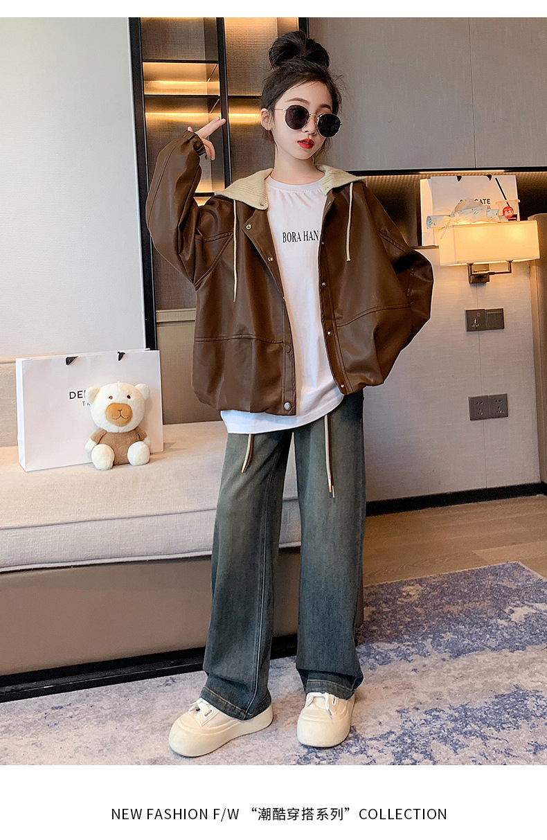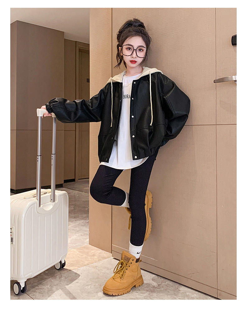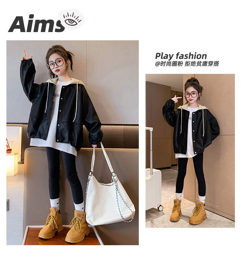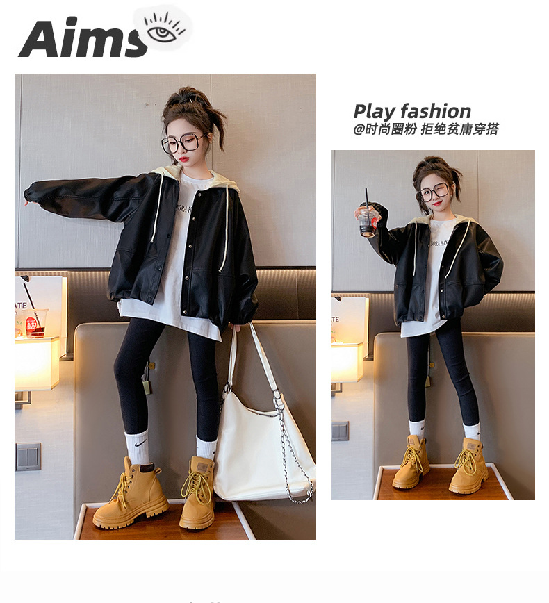 소녀 가죽 코트 봄과 가을 2025 새로운 어린이 가을 재킷 큰 아이 소녀 후드 탑 트렌디스토어 가기
