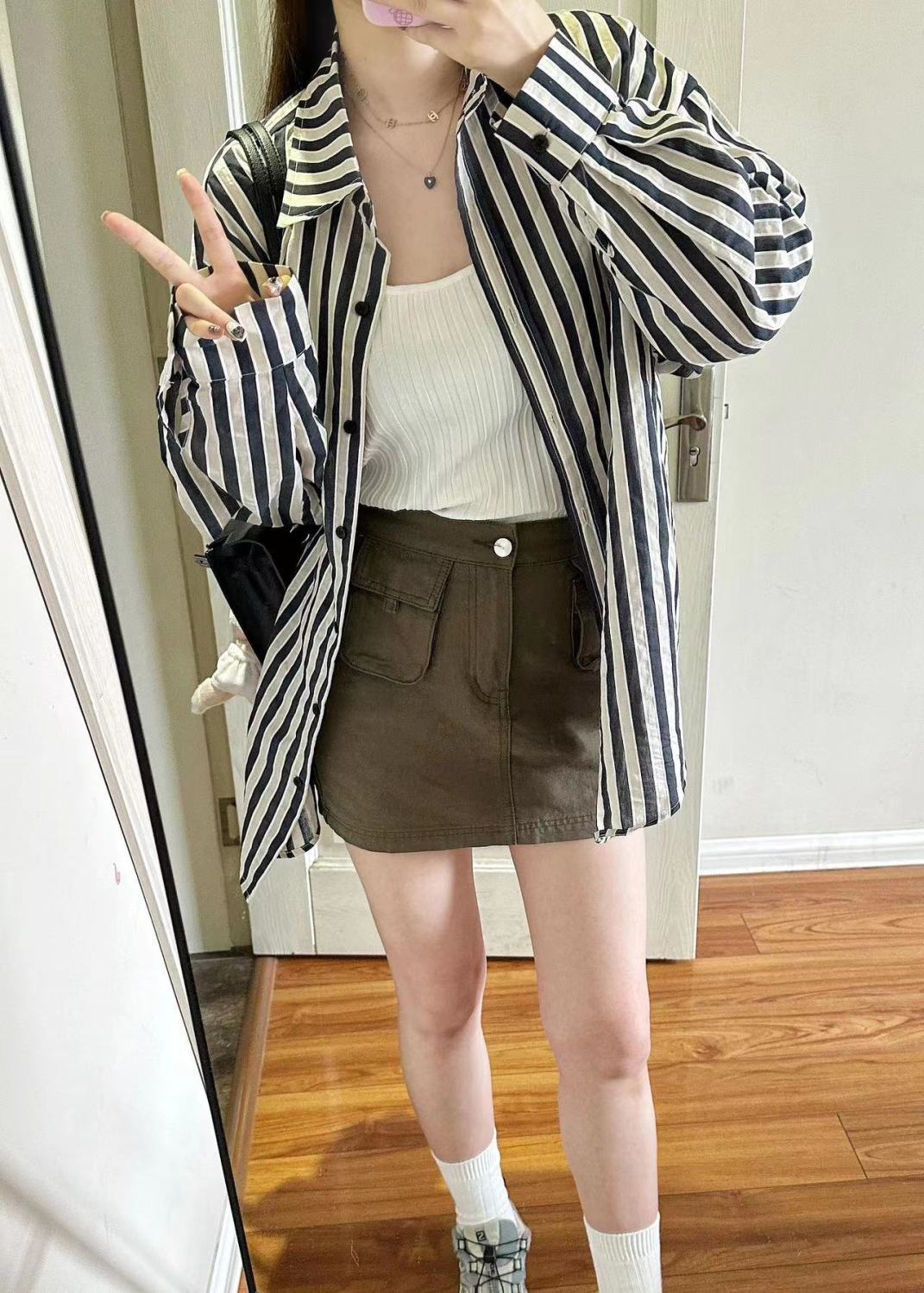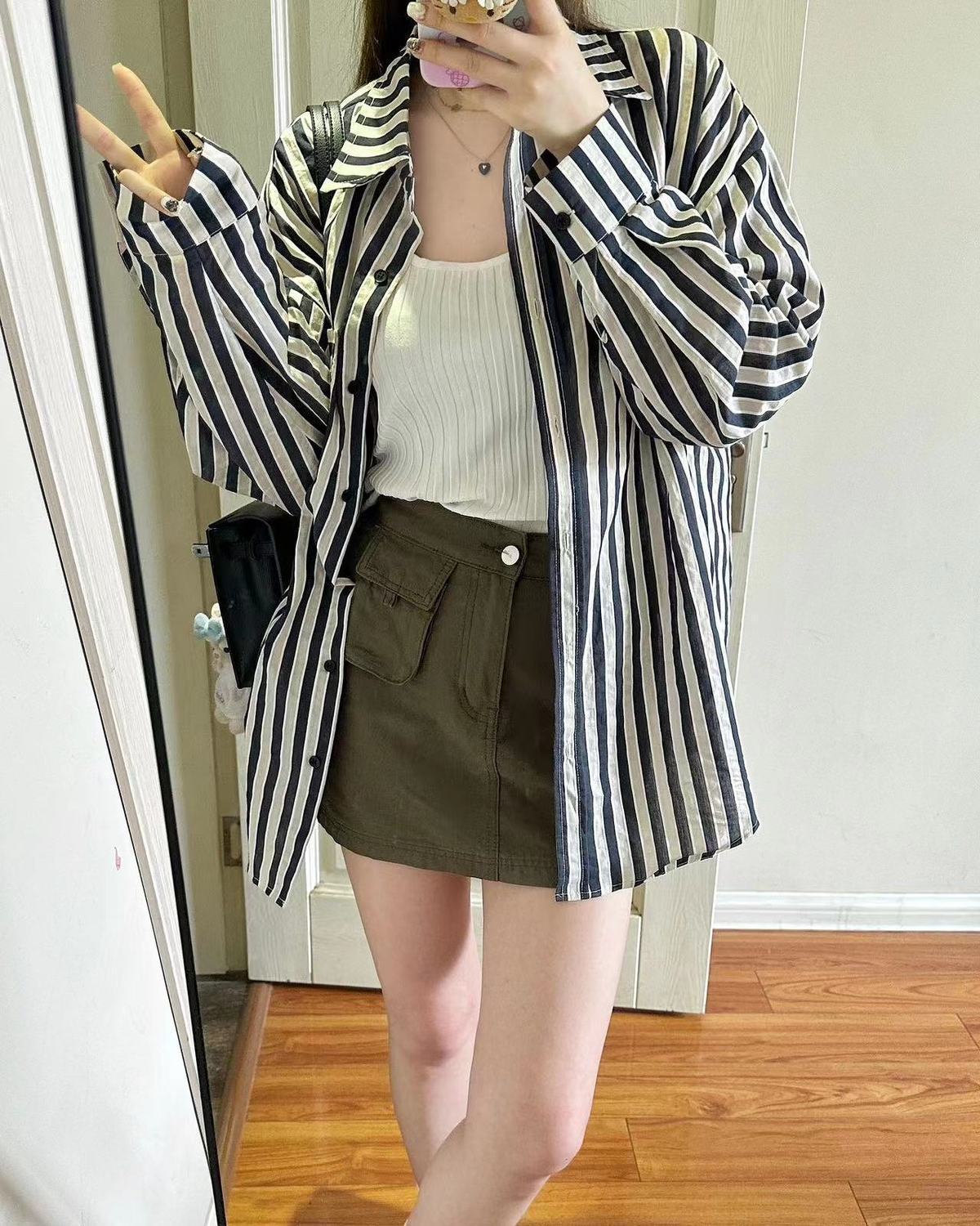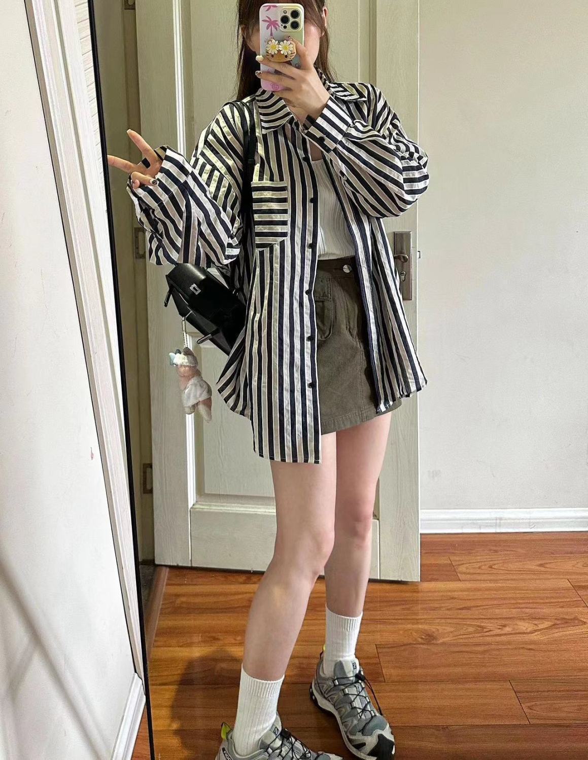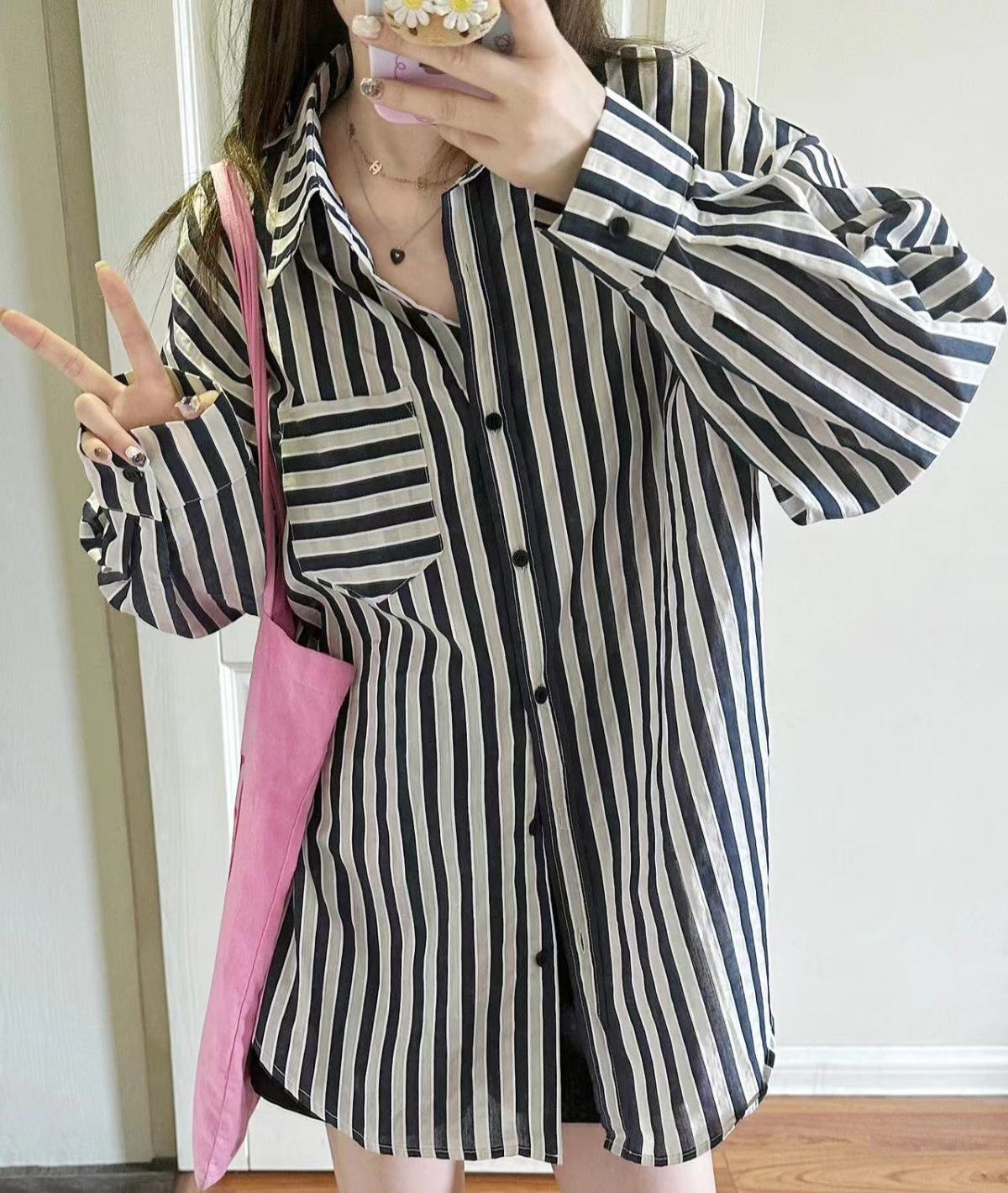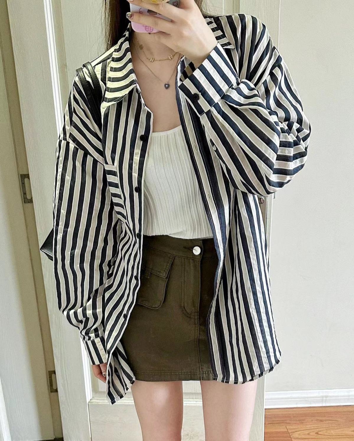 봄 얇은 긴팔 새 모리 스타일 흑백 줄무늬 셔츠 여성용 루즈 캐주얼 슬리밍 올 매치 셔츠스토어 가기