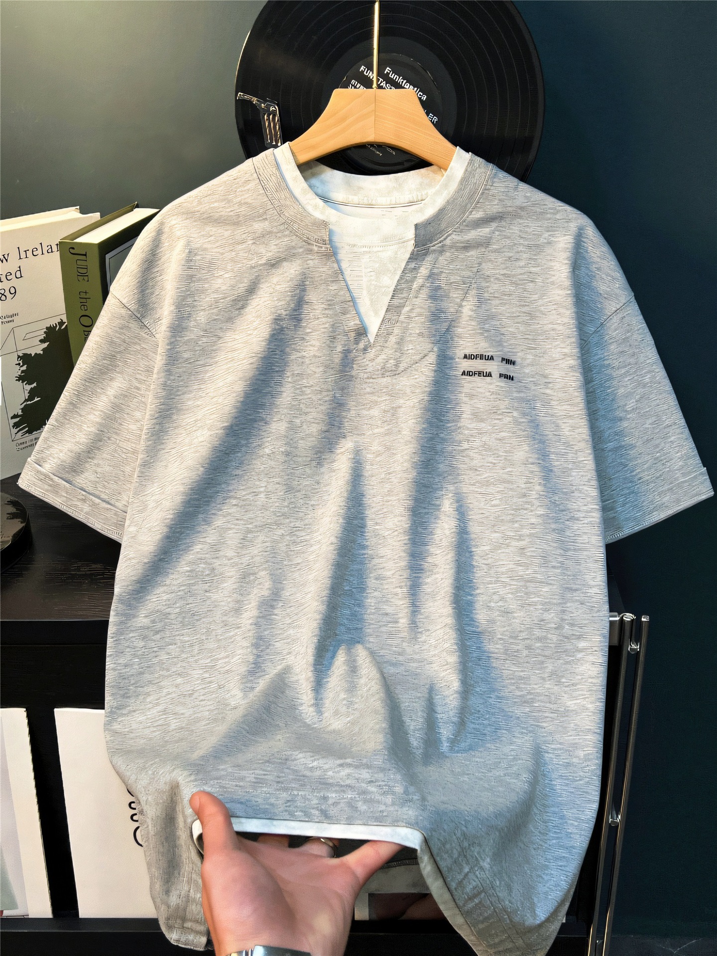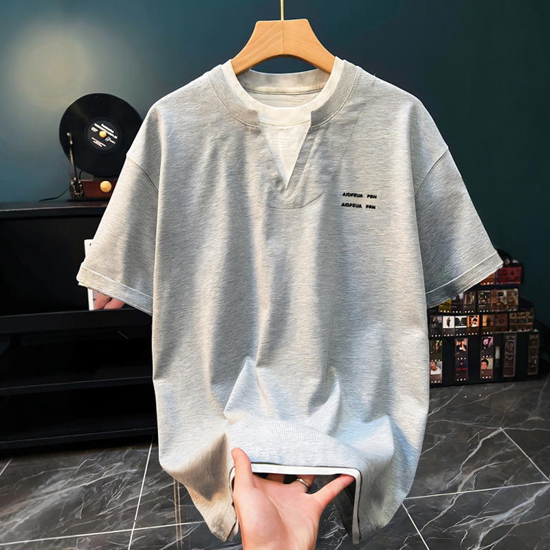 헤비 페이크 투피스 V-넥 반소매 티셔츠 남자 여름 루즈 레트로 디자인 유행 브랜드 한국식 간단한 올매치 반소매 티셔츠스토어 가기