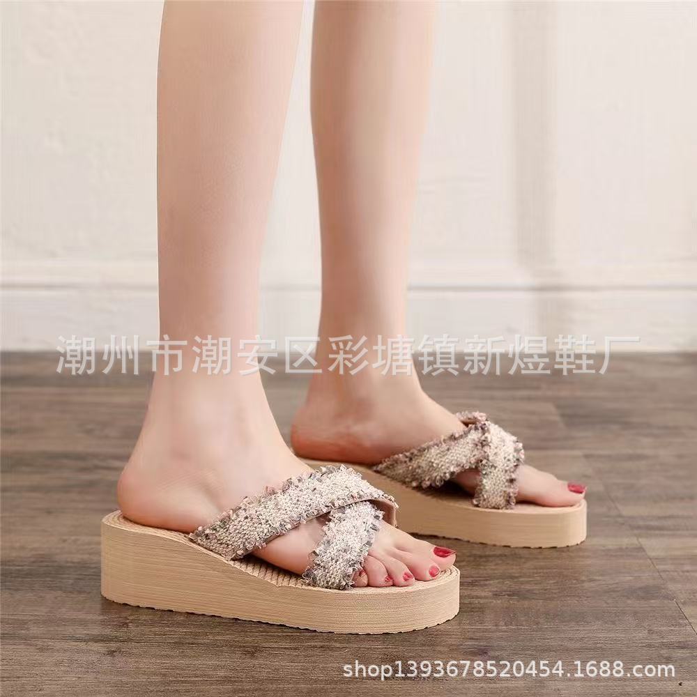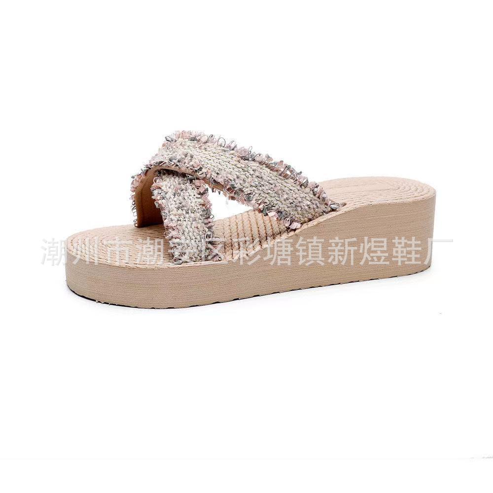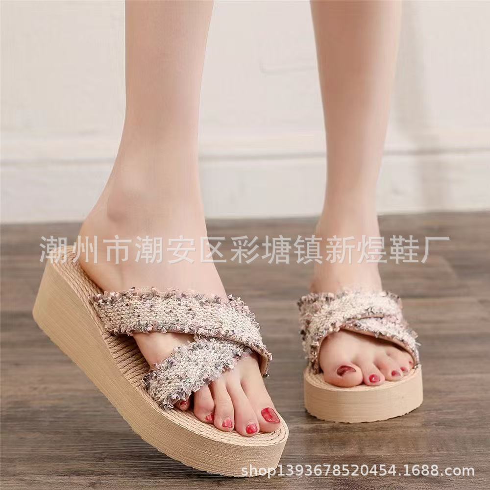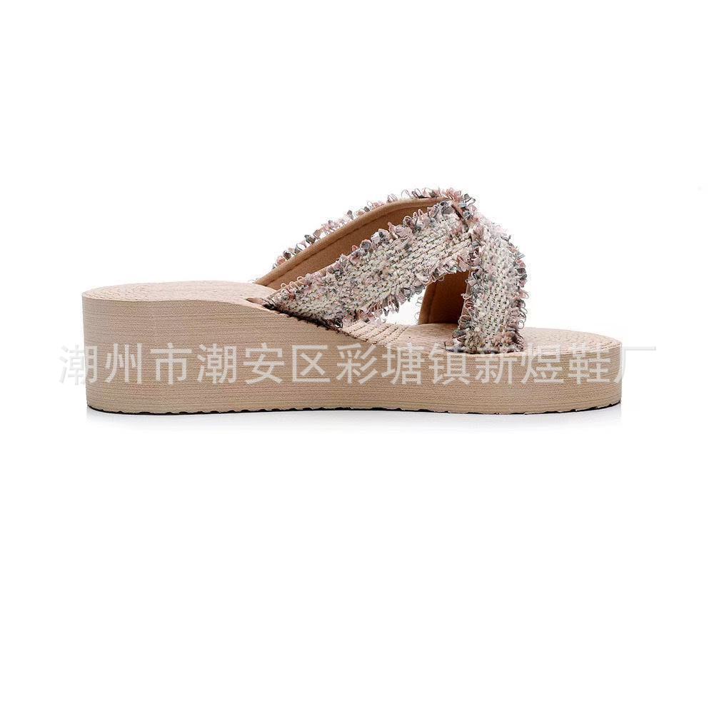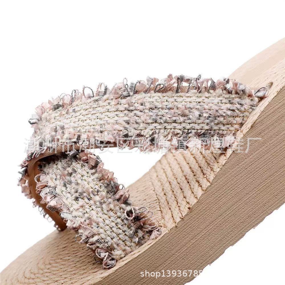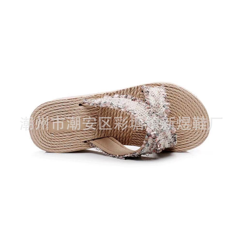 국경 간 여성 샤넬 스타일 내마모성 여성용 슬리퍼 여름 새로운 두꺼운 밑창 웨지 내마모성 대마 로프 플립 플롭 외착용스토어 가기