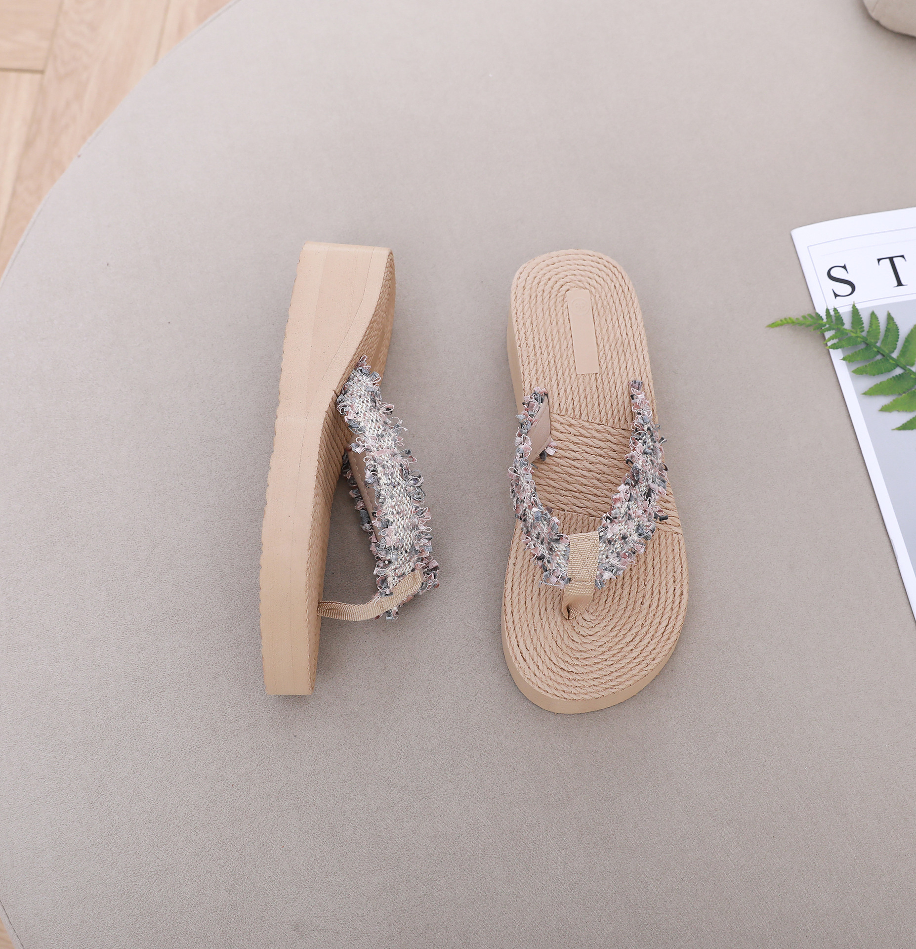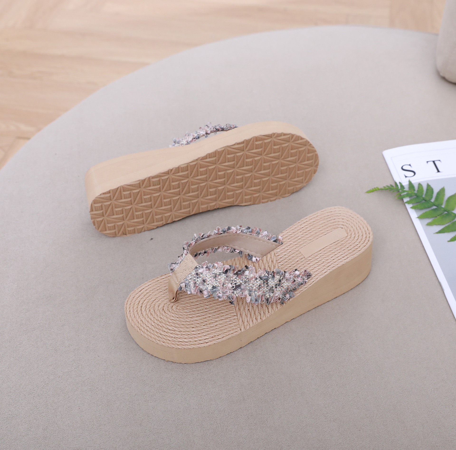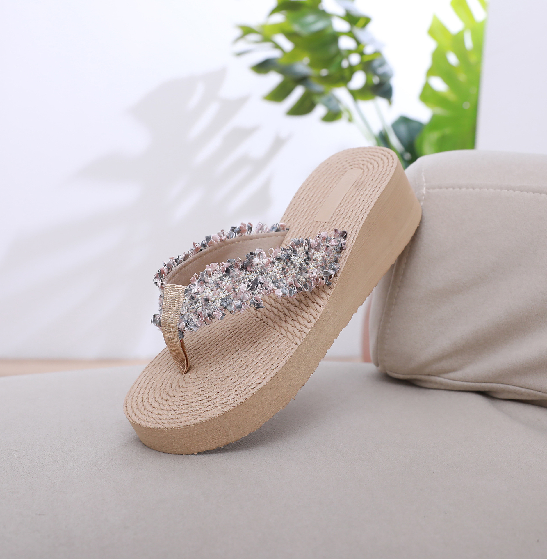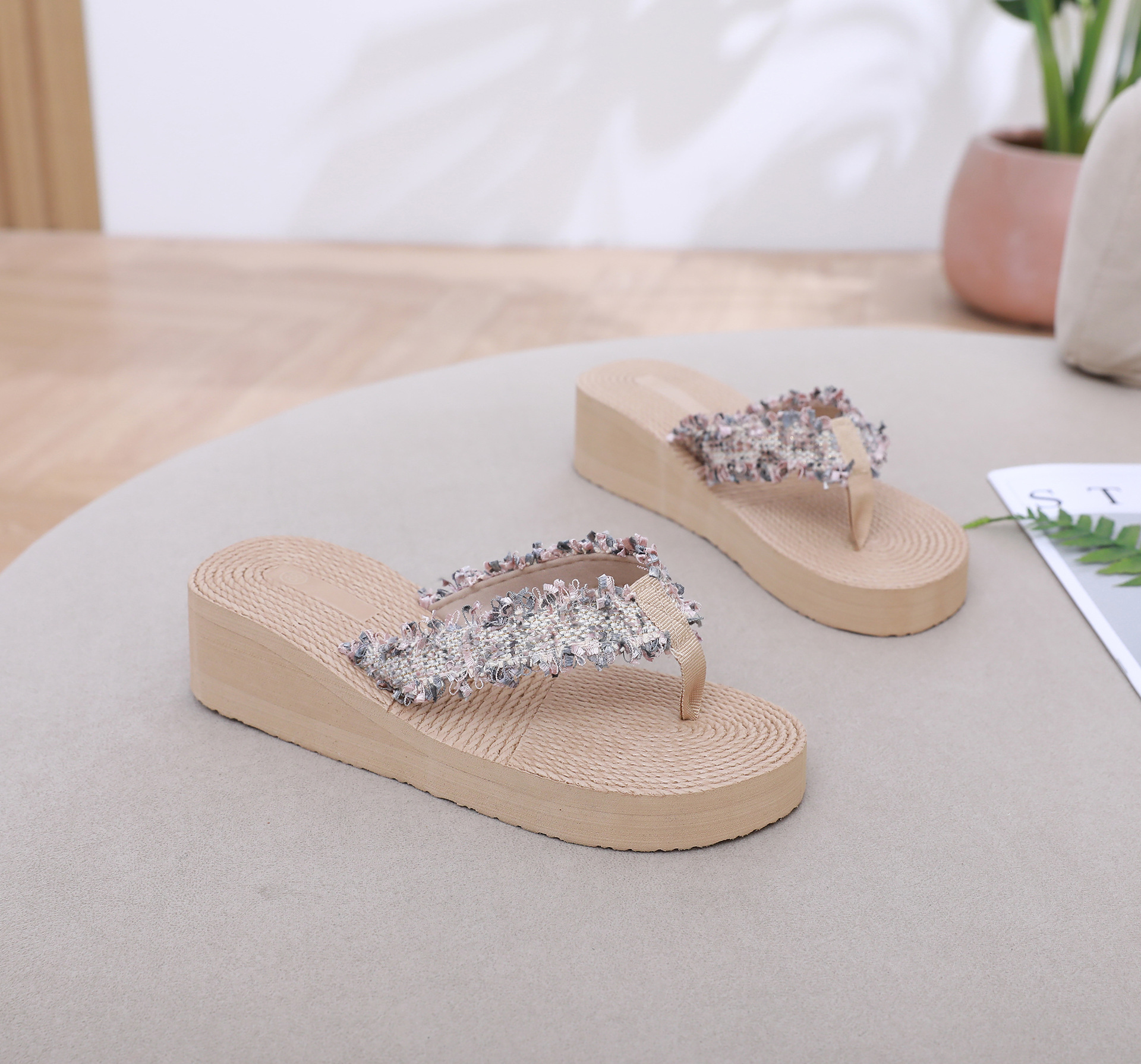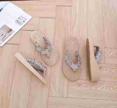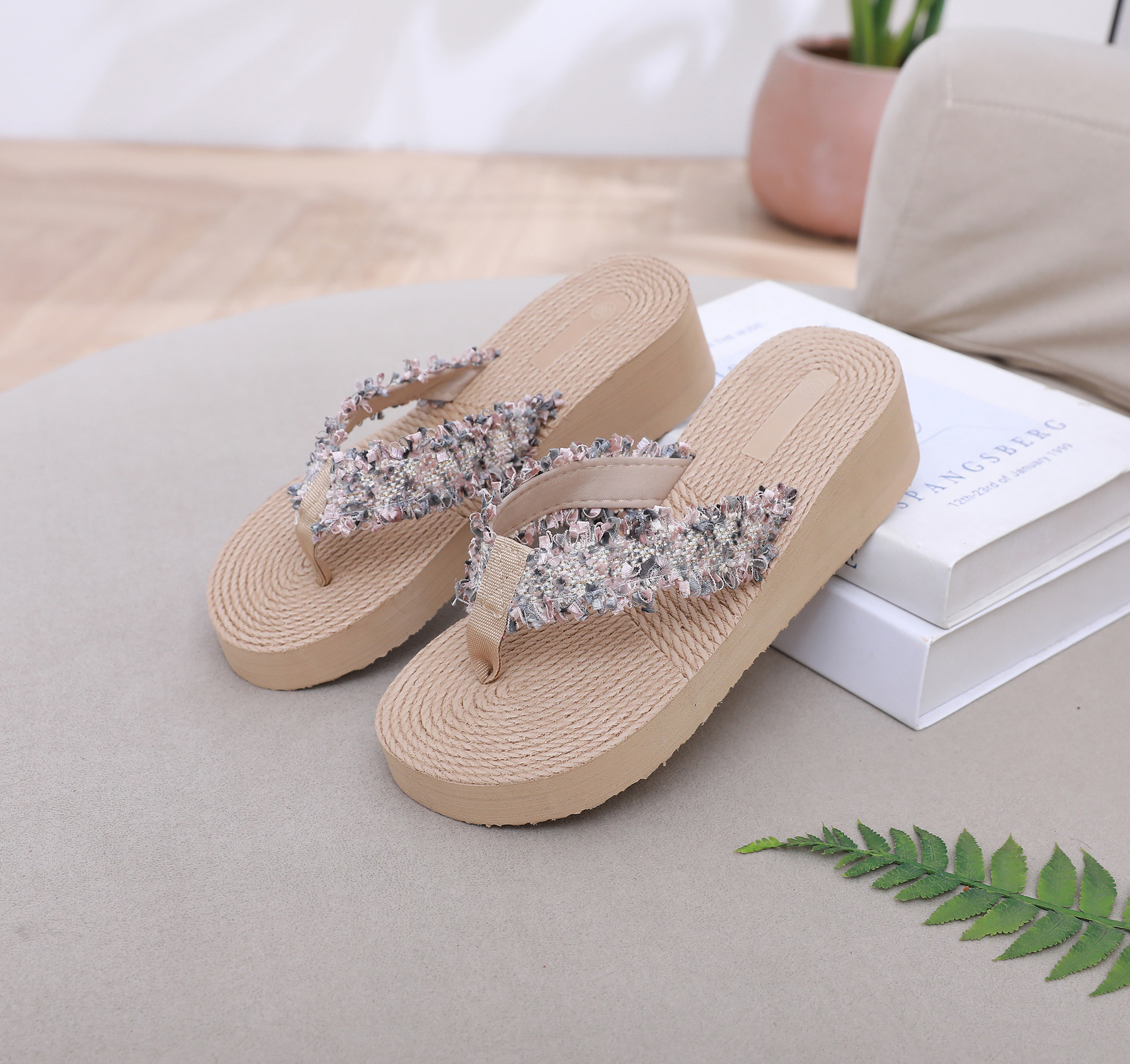 국경 간 여성 샤넬 스타일 내마모성 여성용 슬리퍼 여름 새로운 두꺼운 밑창 웨지 내마모성 대마 로프 플립 플롭 외착용스토어 가기
