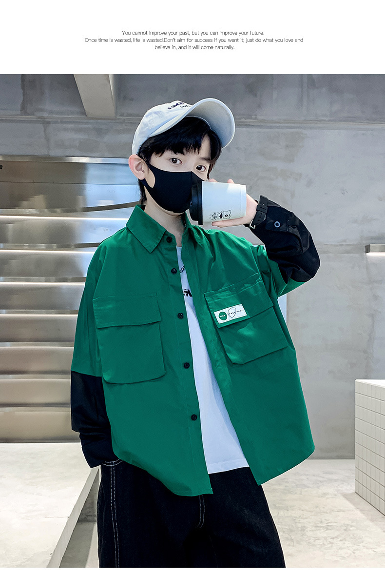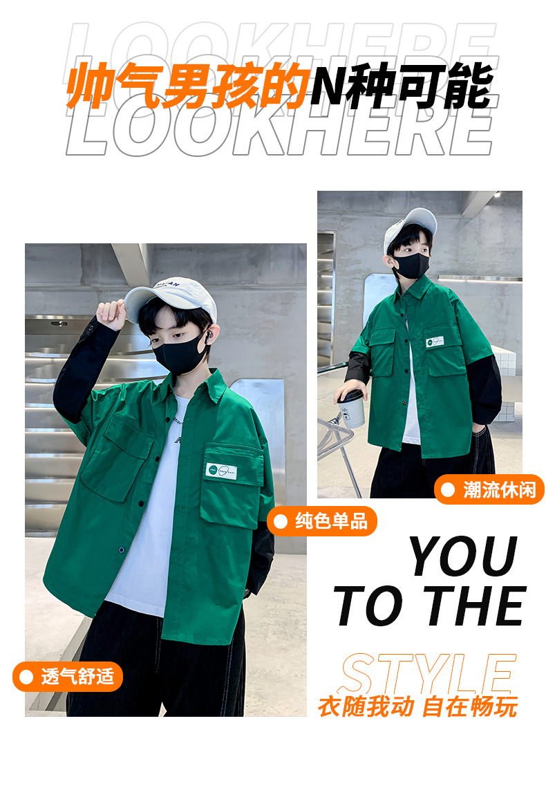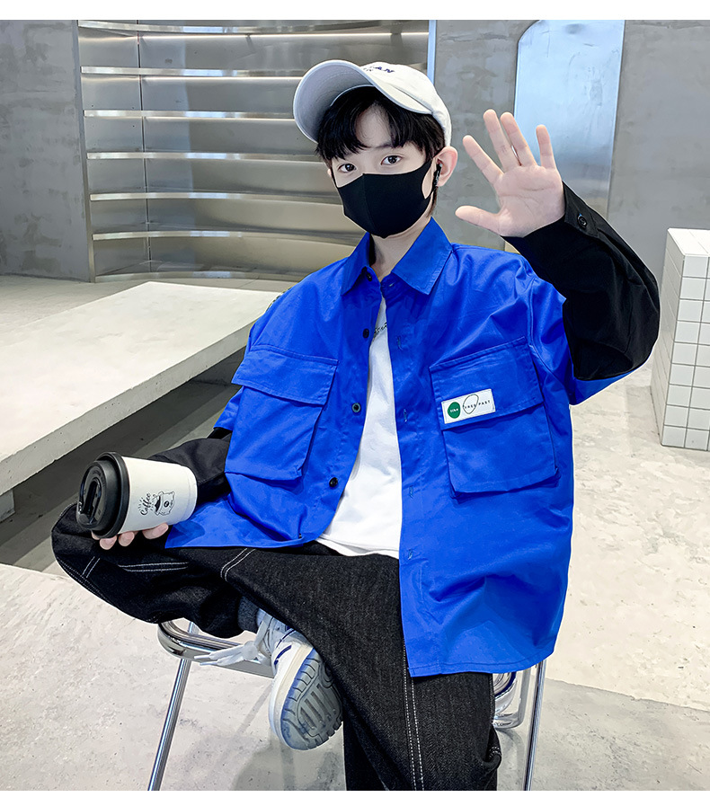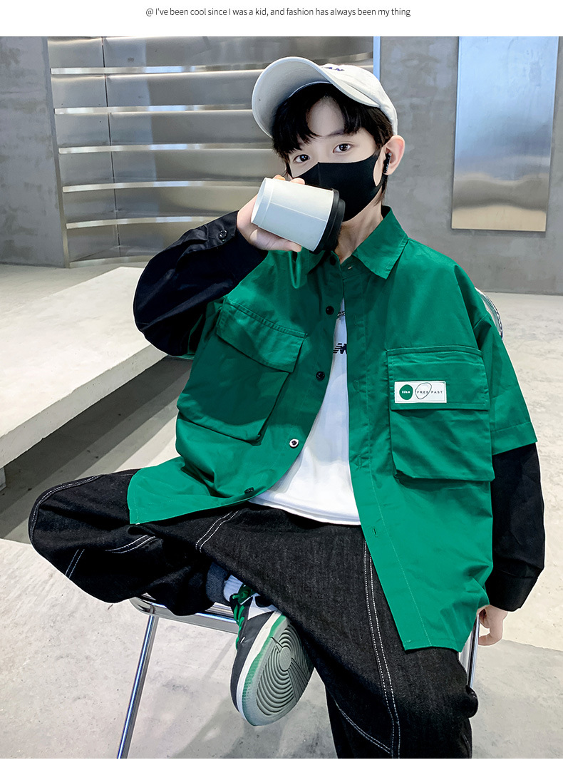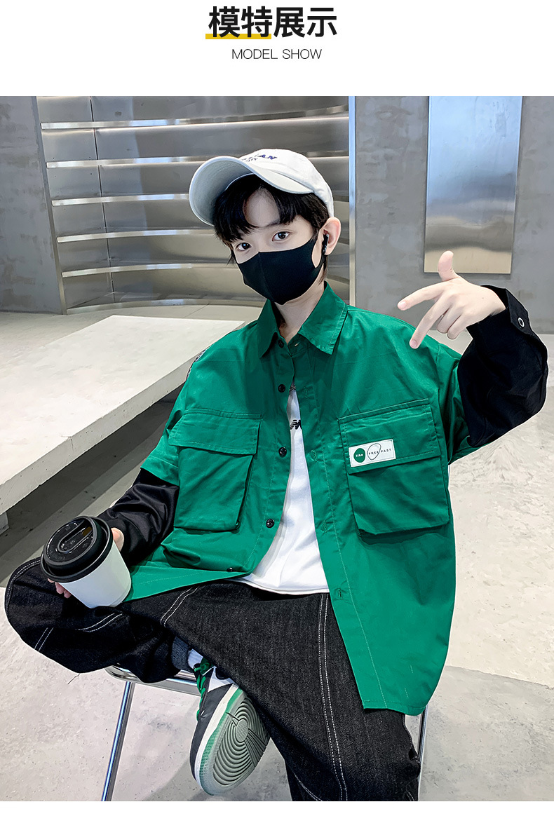 아동복 어린이 셔츠 큰 포켓 유행 잘 생긴 바느질 재킷 작업복 스타일 셔츠 2025 새로운 스타일 중 큰 어린이 패션스토어 가기