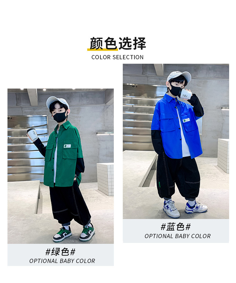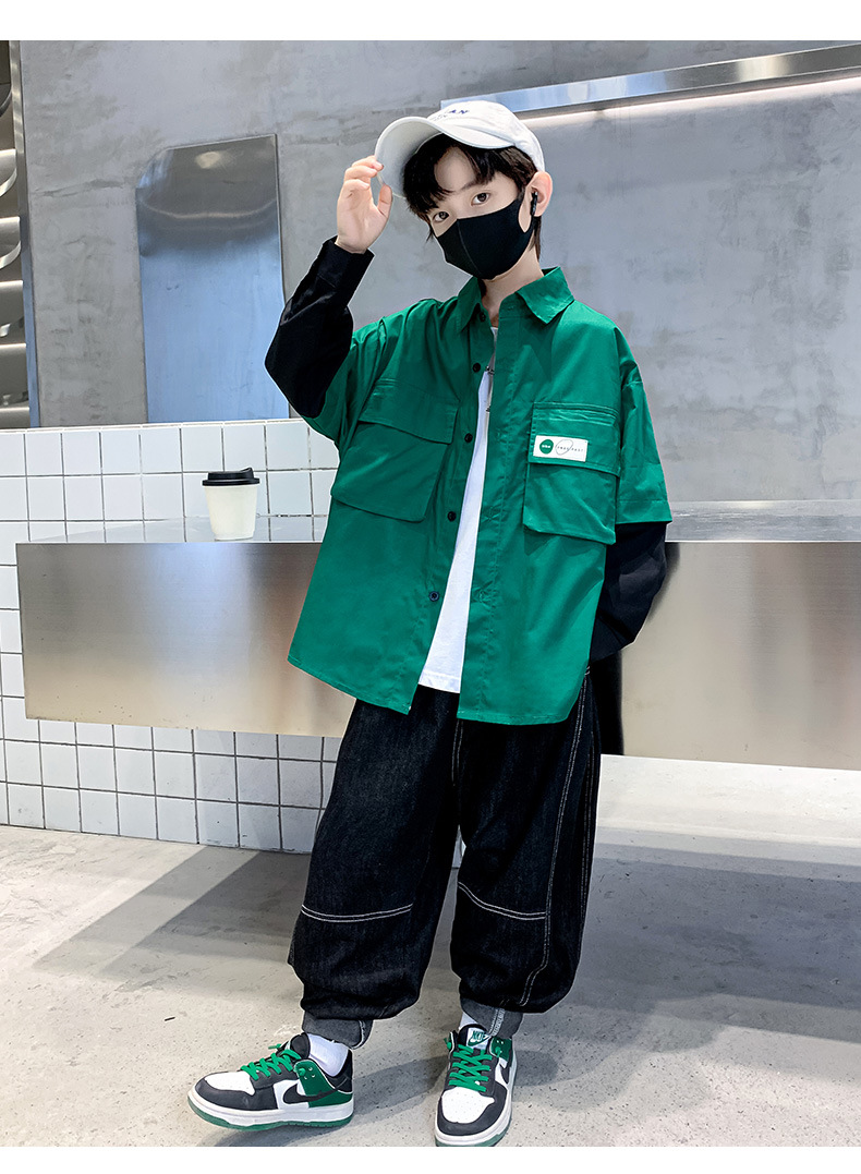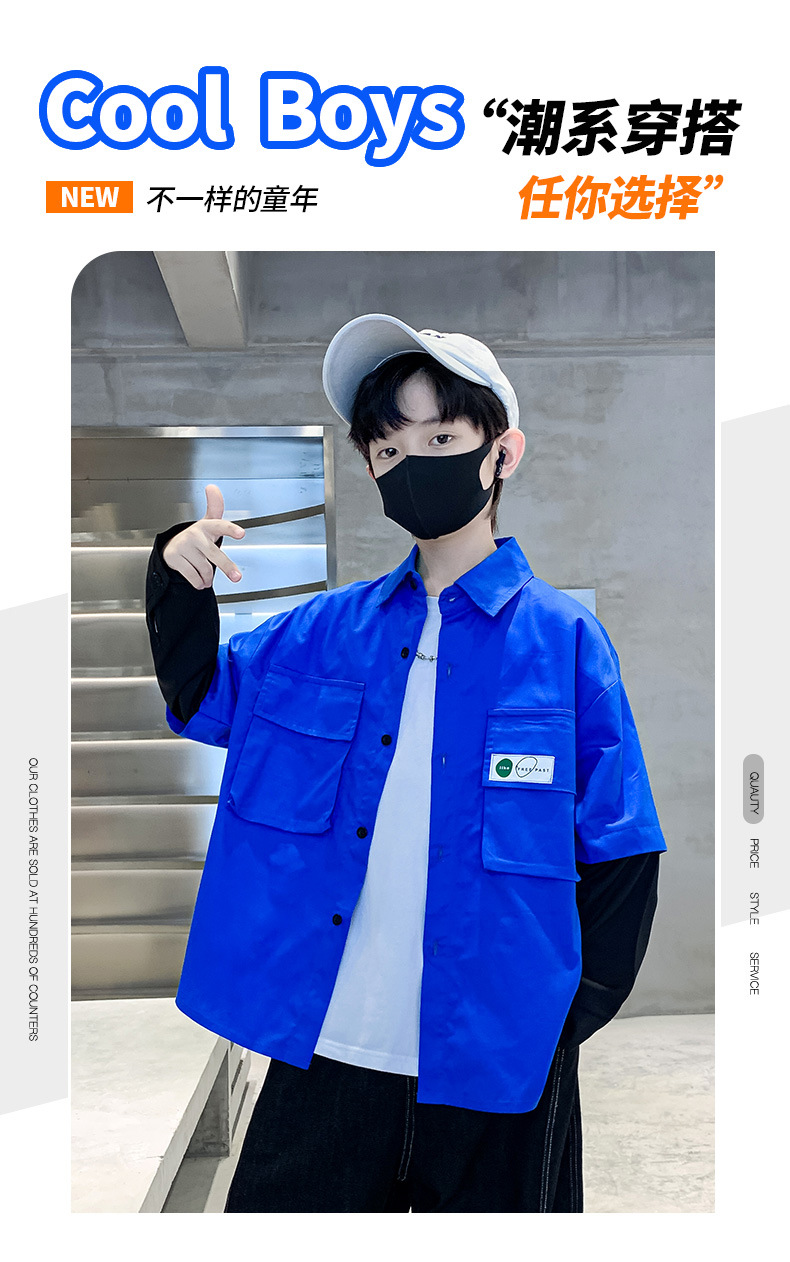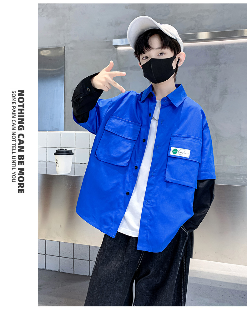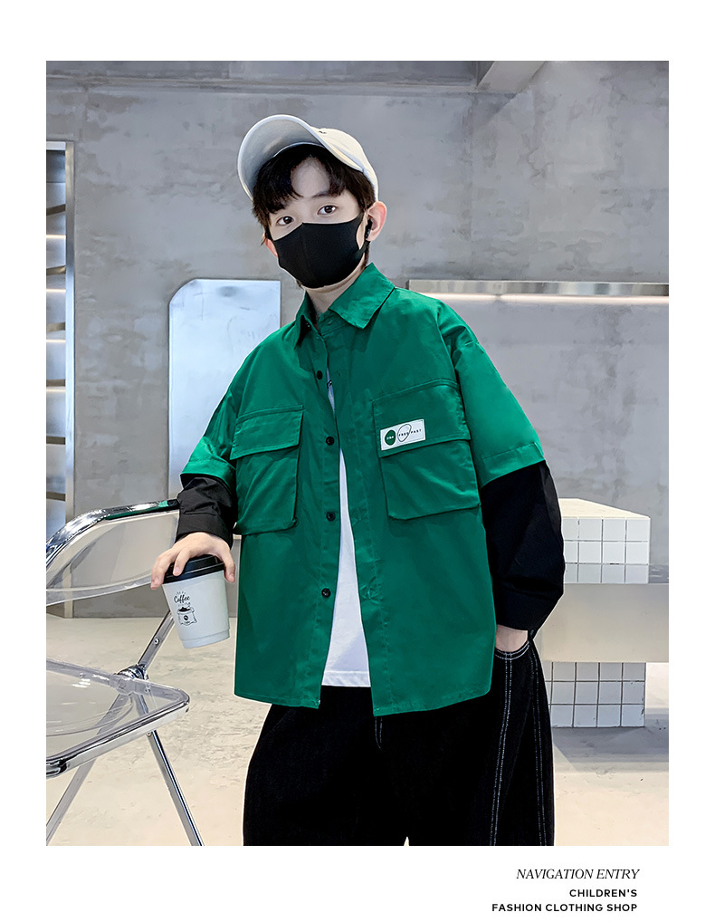 아동복 어린이 셔츠 큰 포켓 유행 잘 생긴 바느질 재킷 작업복 스타일 셔츠 2025 새로운 스타일 중 큰 어린이 패션스토어 가기