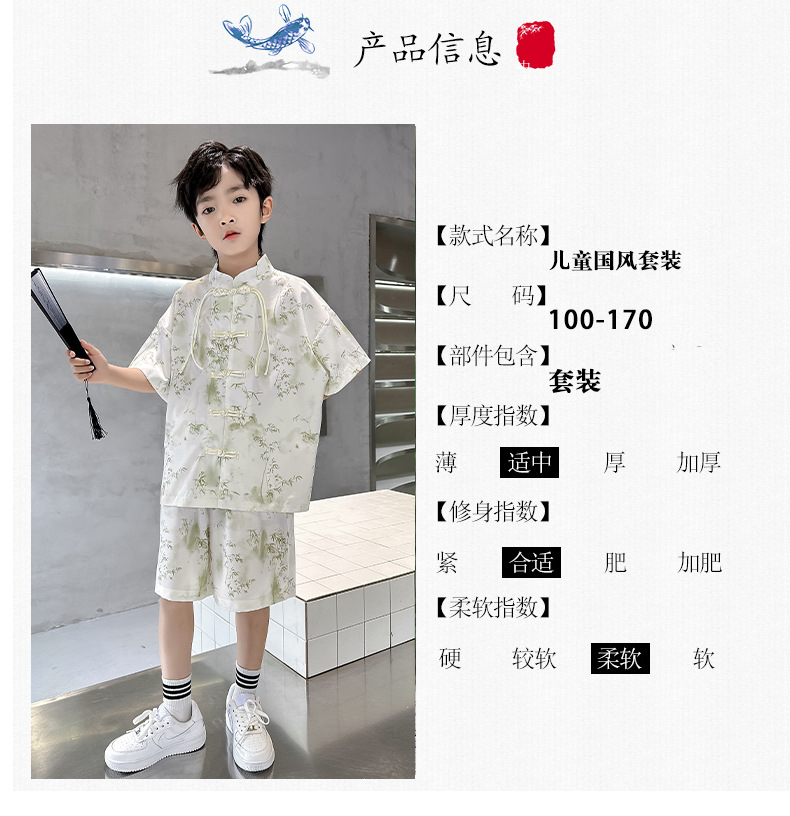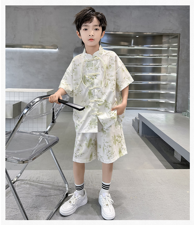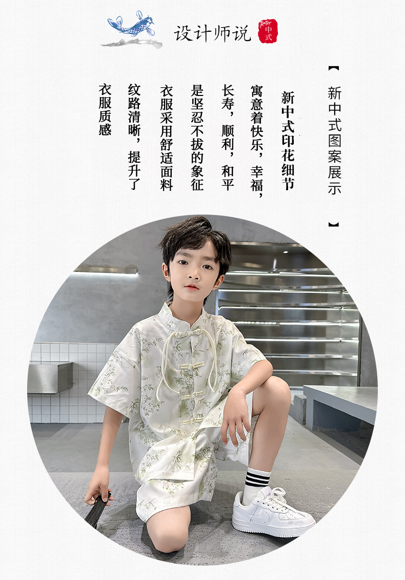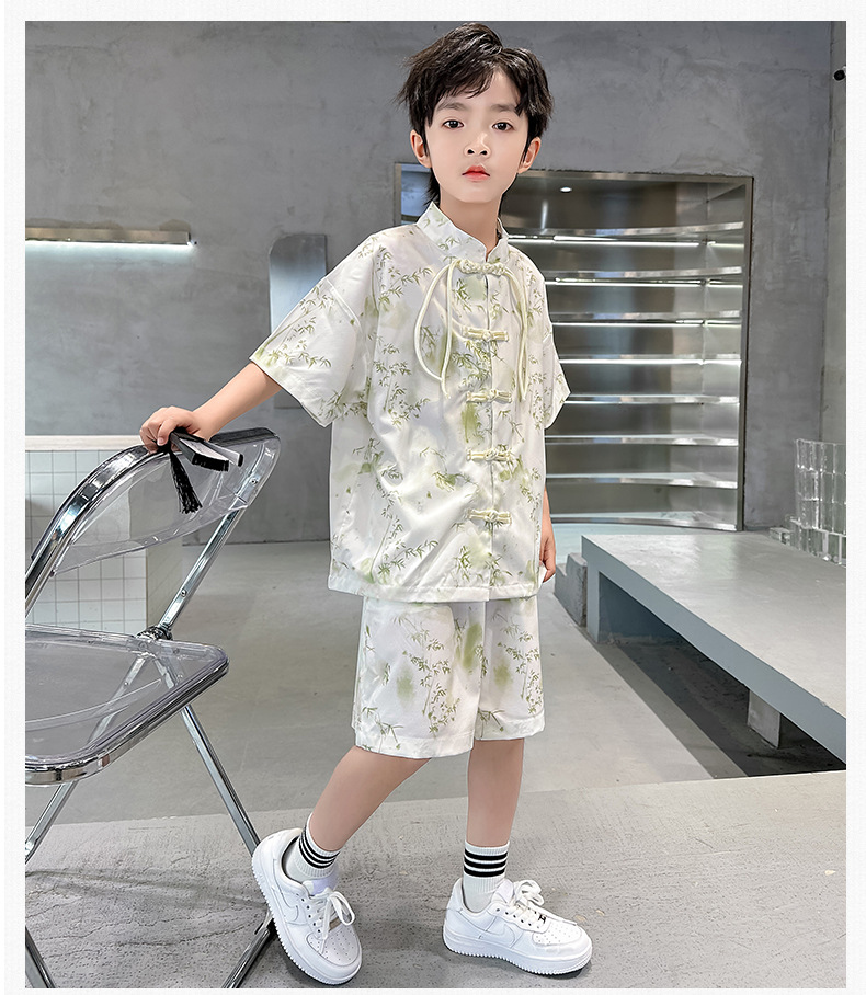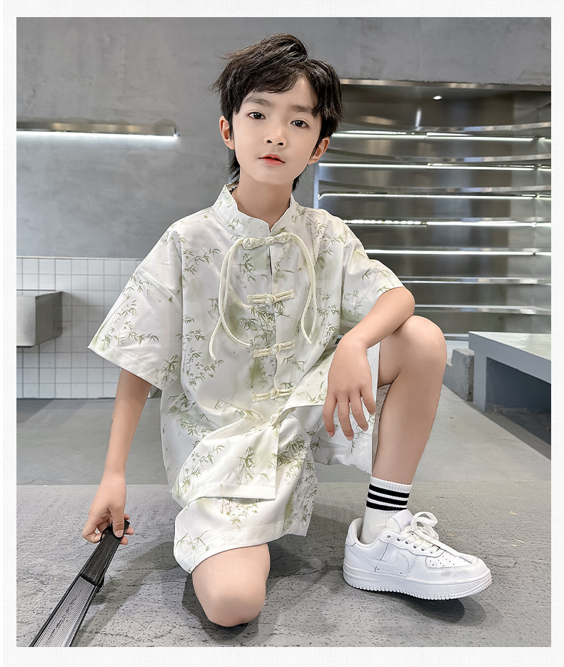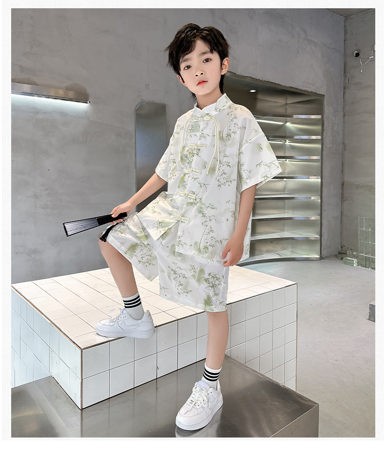 아동복 여름 얇은 세트 2025 새로운 중국 스타일 소년 버클 탕 원피스 골동품 잘 생긴 짧은 소매 중형 및 대형 아동복스토어 가기