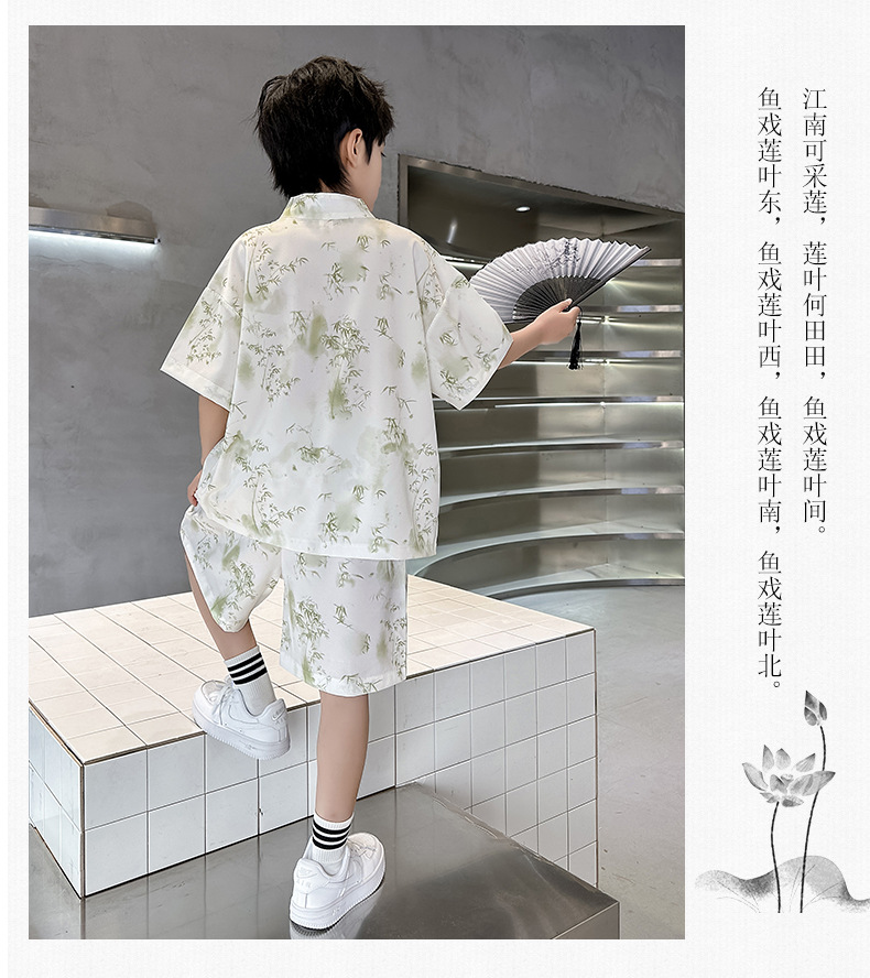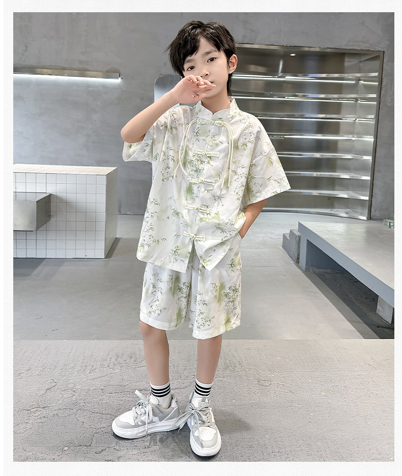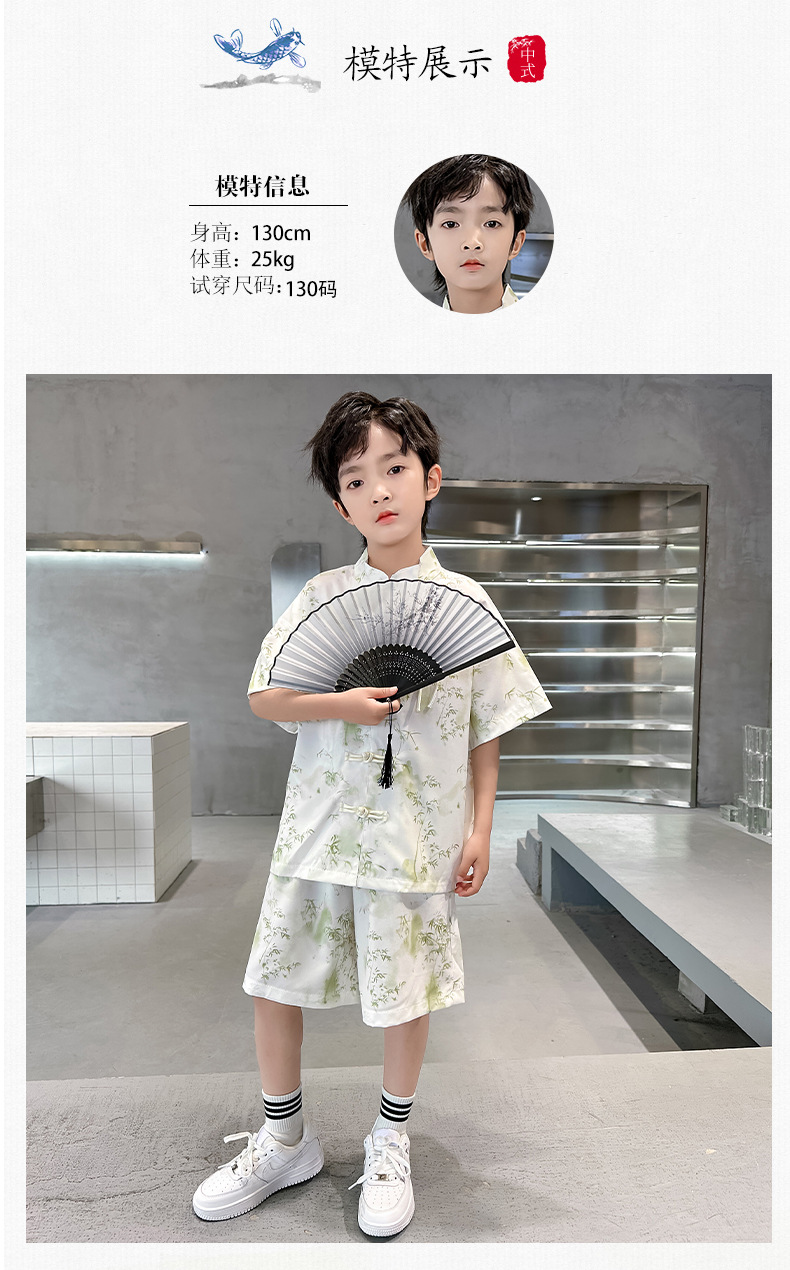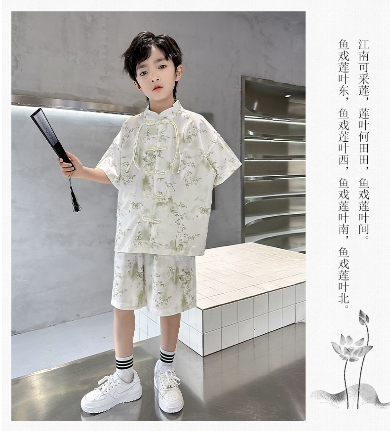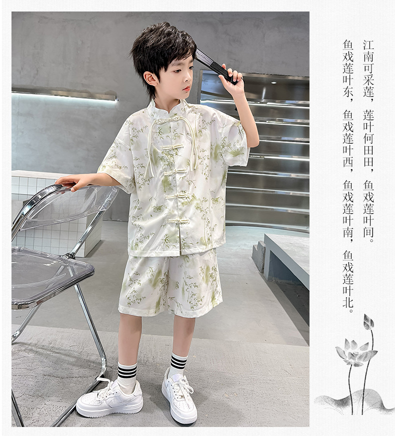 아동복 여름 얇은 세트 2025 새로운 중국 스타일 소년 버클 탕 원피스 골동품 잘 생긴 짧은 소매 중형 및 대형 아동복스토어 가기