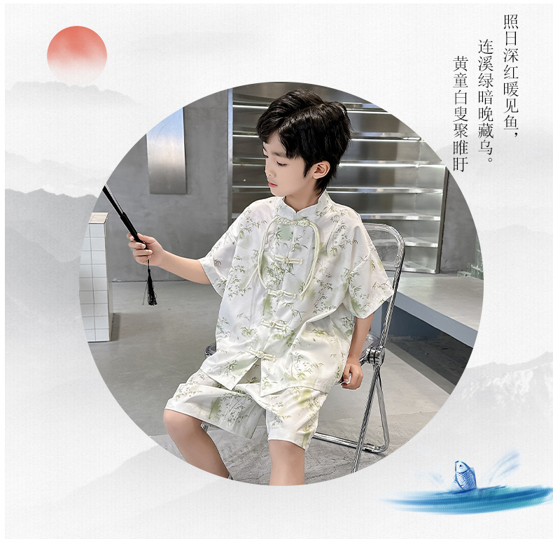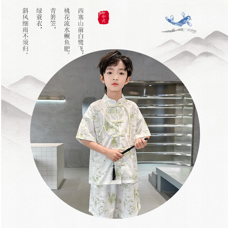 아동복 여름 얇은 세트 2025 새로운 중국 스타일 소년 버클 탕 원피스 골동품 잘 생긴 짧은 소매 중형 및 대형 아동복