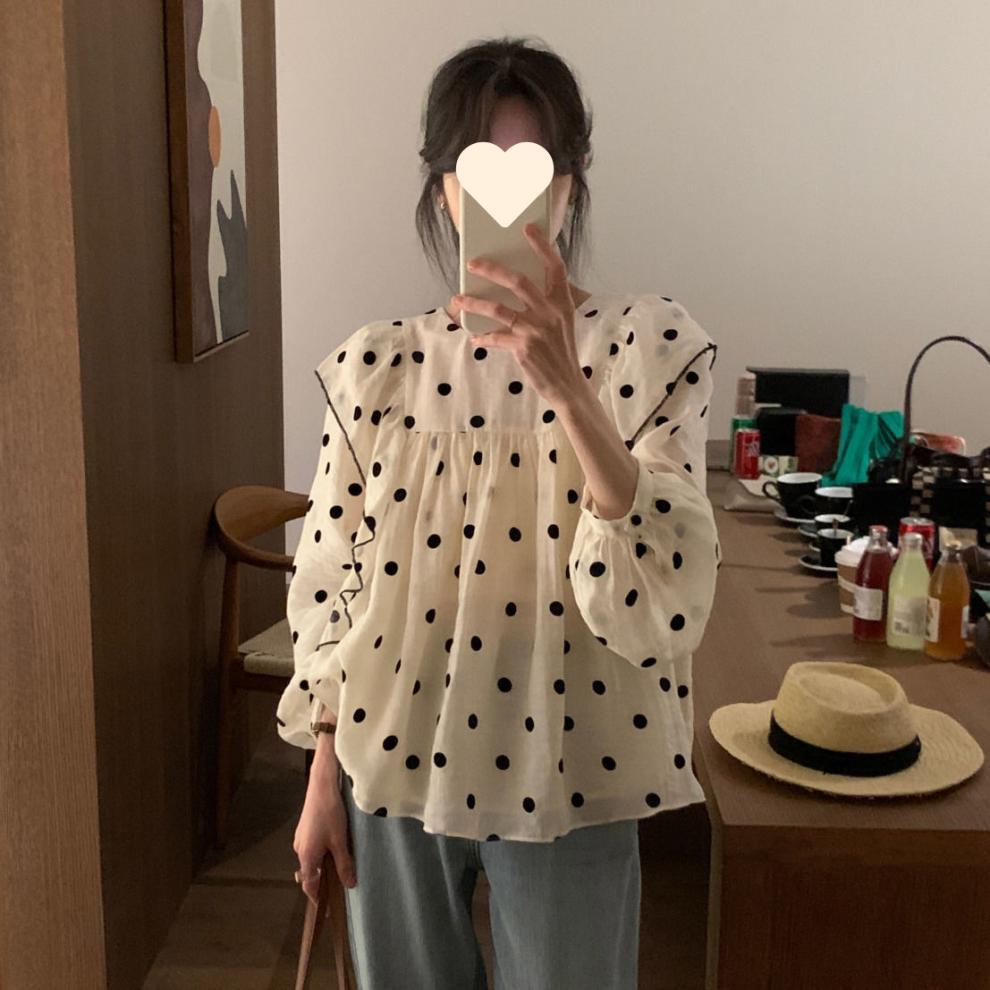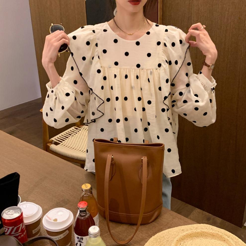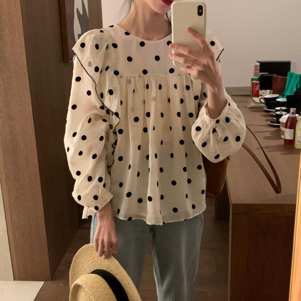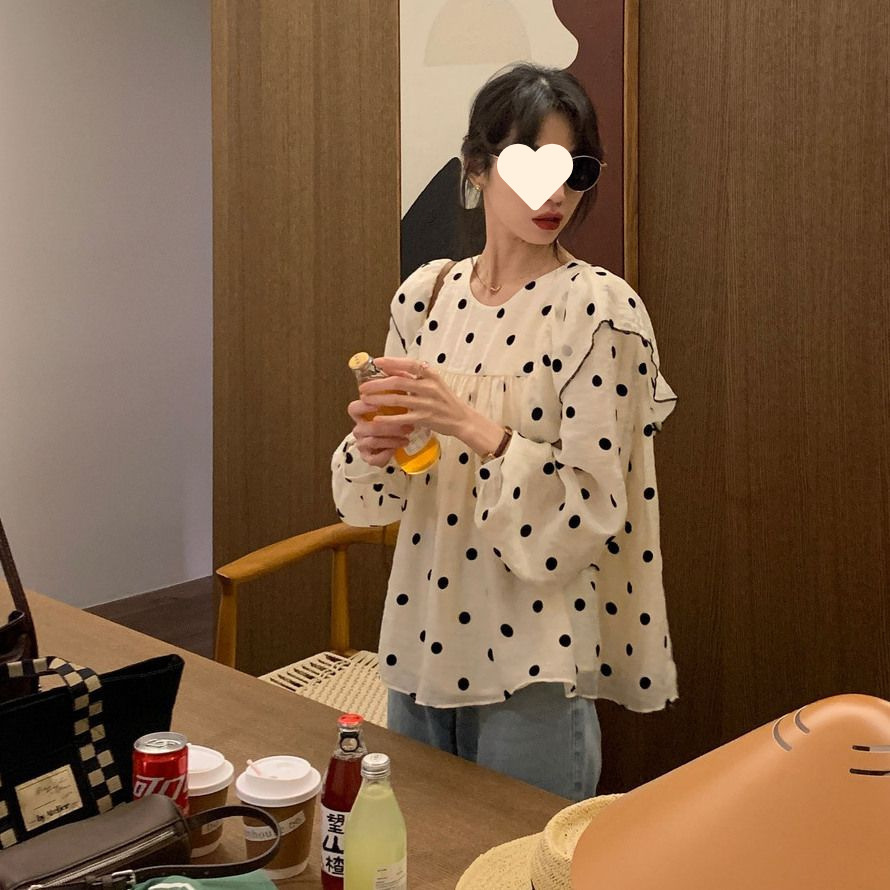 이른 가을 달콤한 세련된 귀 가장자리 웨이브 도트 셔츠 여성의 2024 외부 착용 디자인 센스 틈새 슬림 셔츠 긴 소매스토어 가기