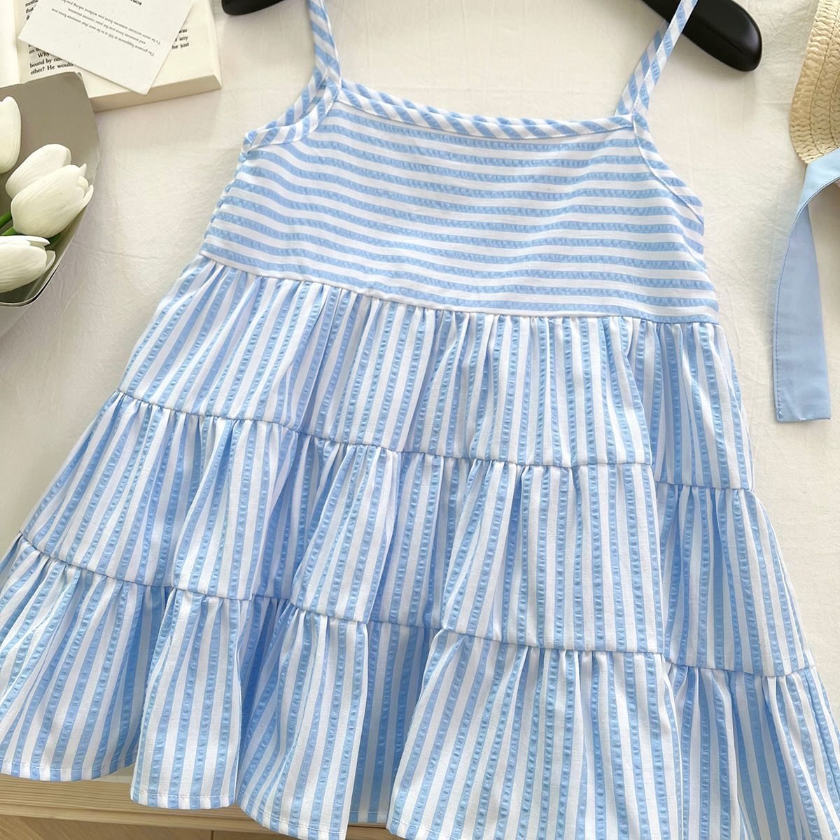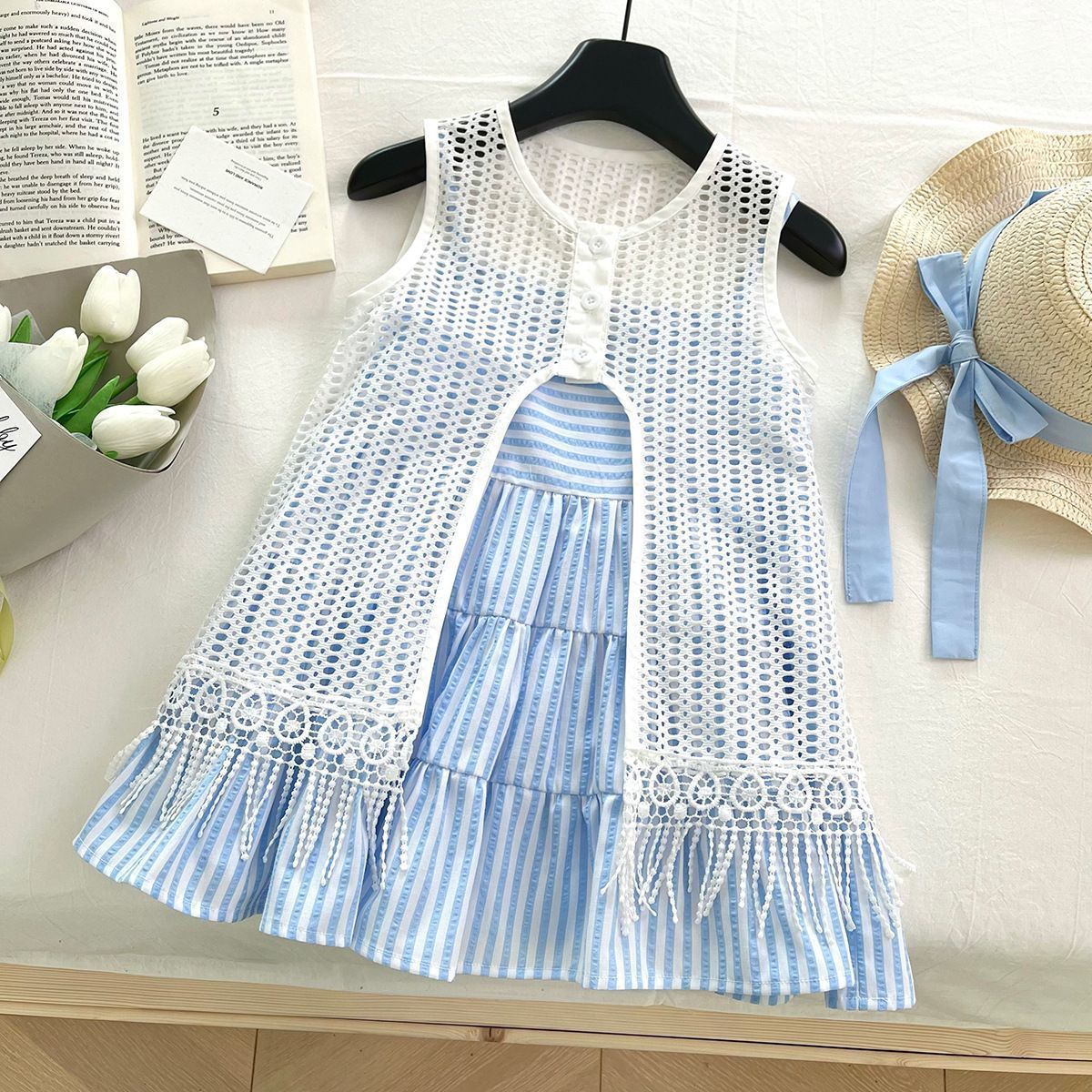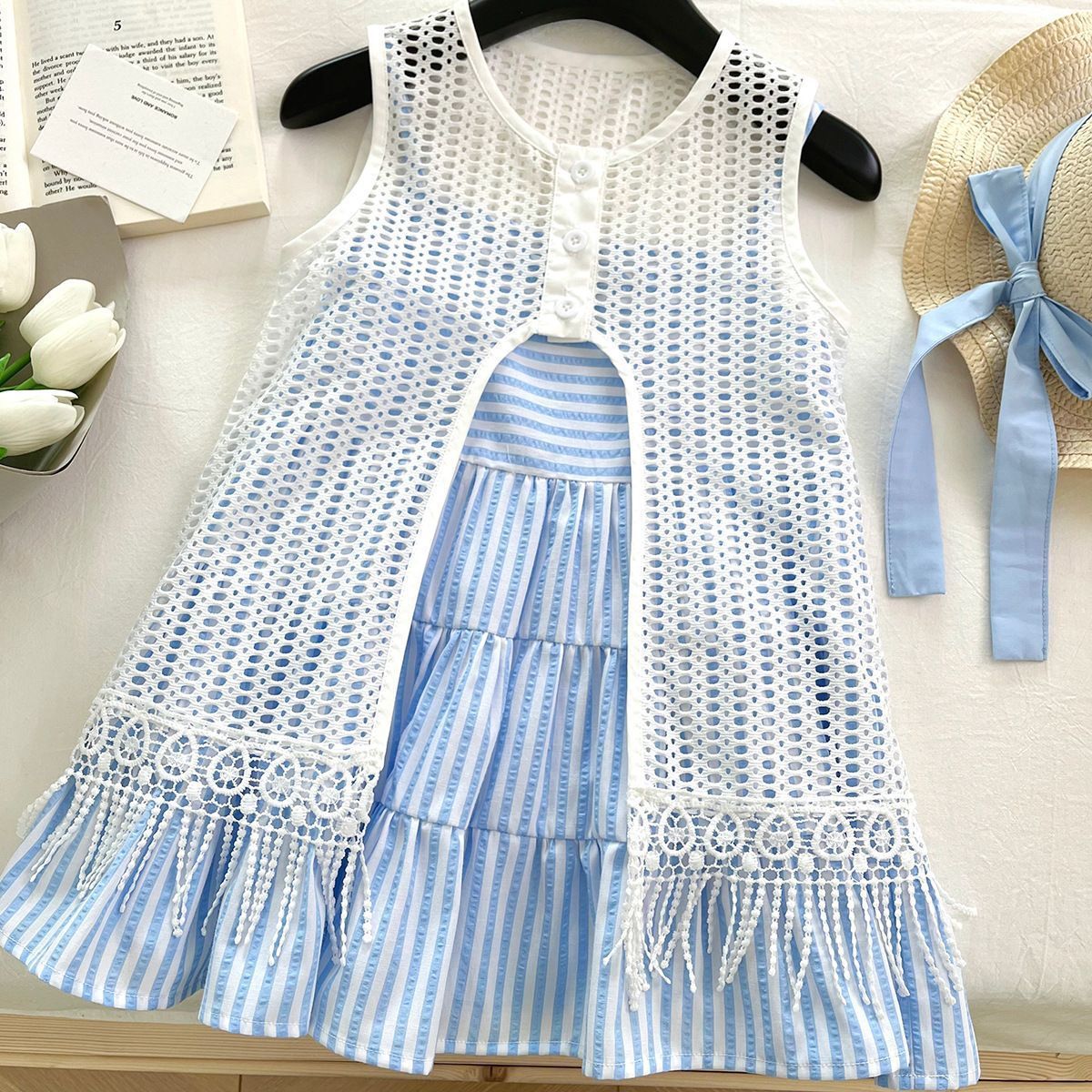 2025 새로운 한국 스타일 중공 휴가 카디건 스타일 줄무늬 원피스 소녀의 여름 달콤한 소녀 원피스 투피스 유행 세트스토어 가기