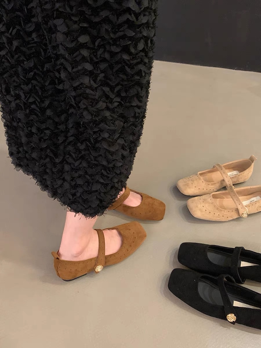 플랫 프렌치 메리 제인 싱글 신발 여성 신발 2025 새로운 봄 레트로 스웨이드 스퀘어 토 블랙 통근 신발스토어 가기