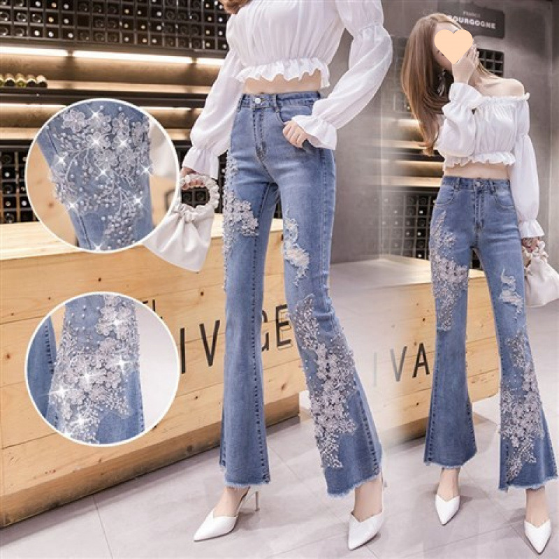 유럽 역 스트레치 청바지 여성용 플라 팬츠 2014 가을 새 구슬 자수 꽃 슬림 핏 피쉬 테일 바지