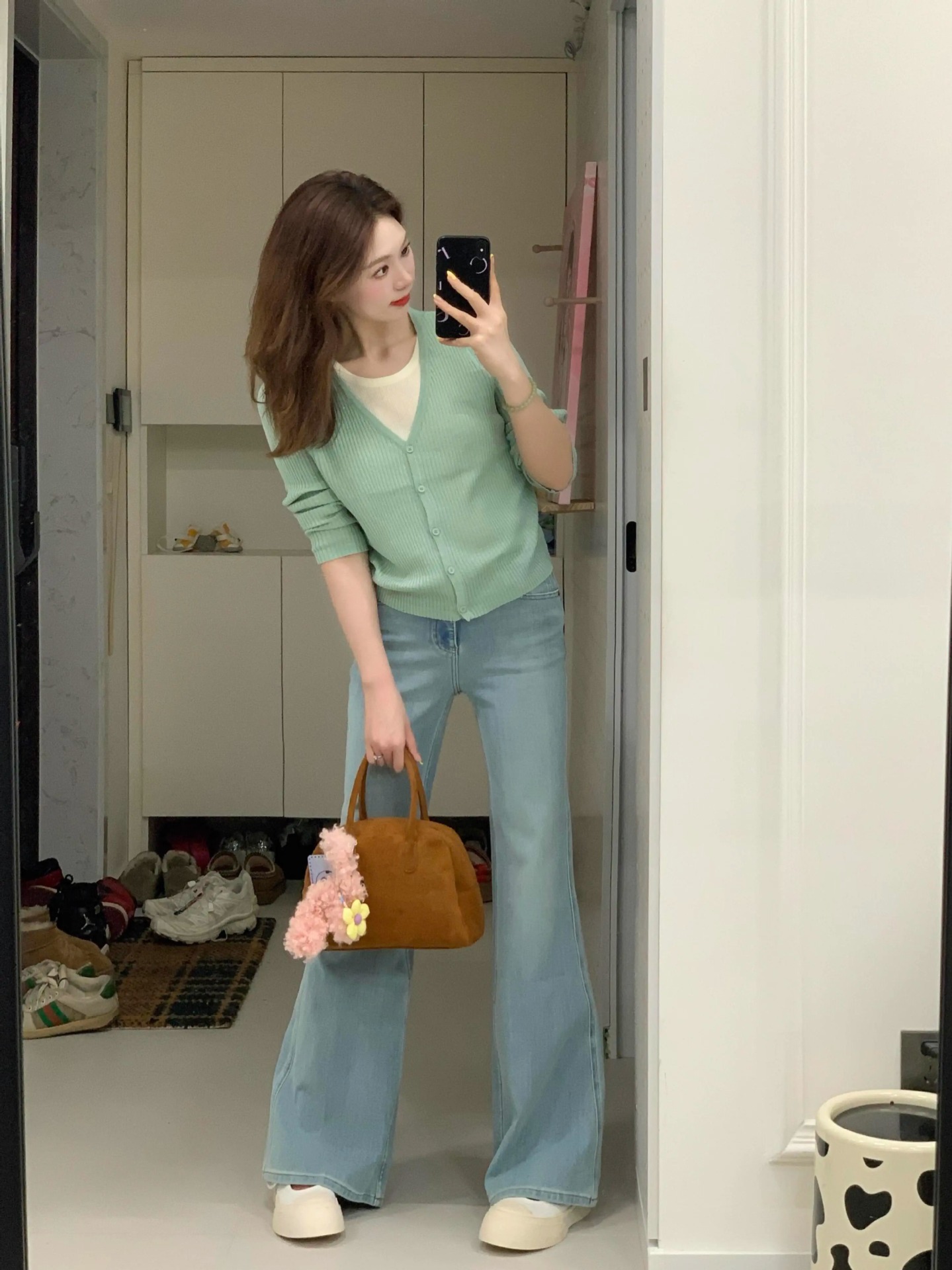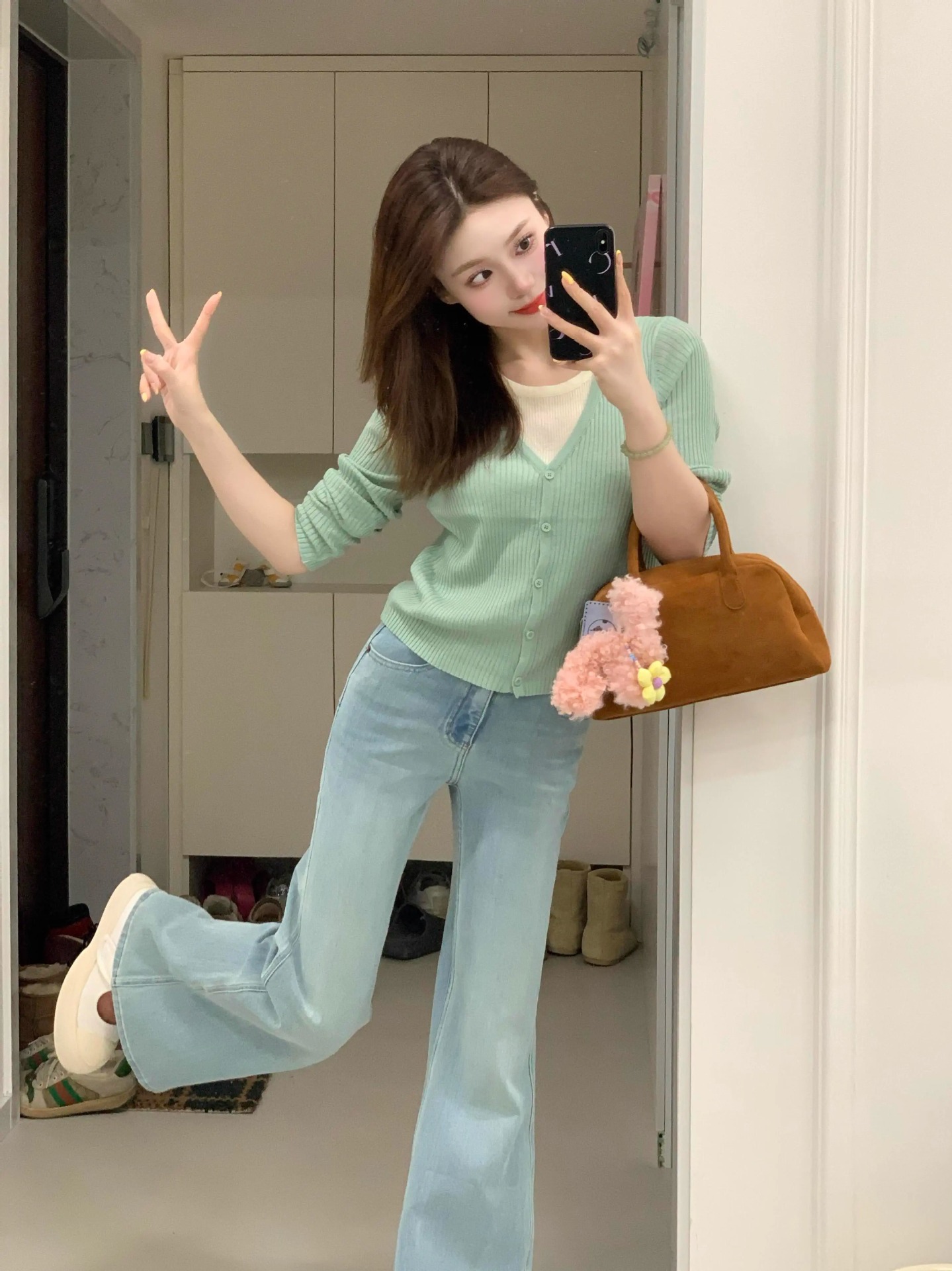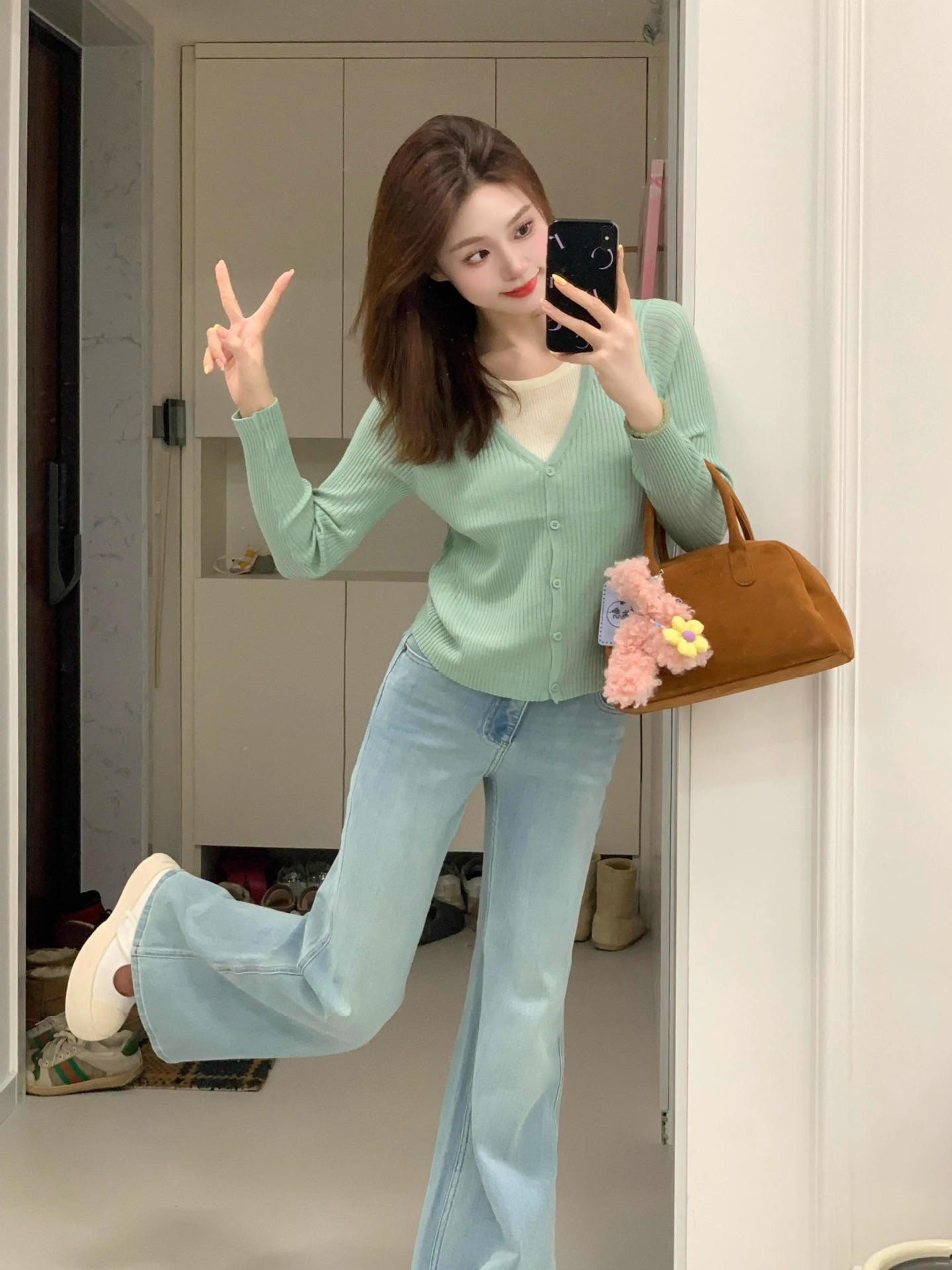 봄 한국식 그린 V 넥 짧은 카디건 코트 여성의 봄과 가을 가짜 투피스 스웨터 니트웨어 탑스토어 가기