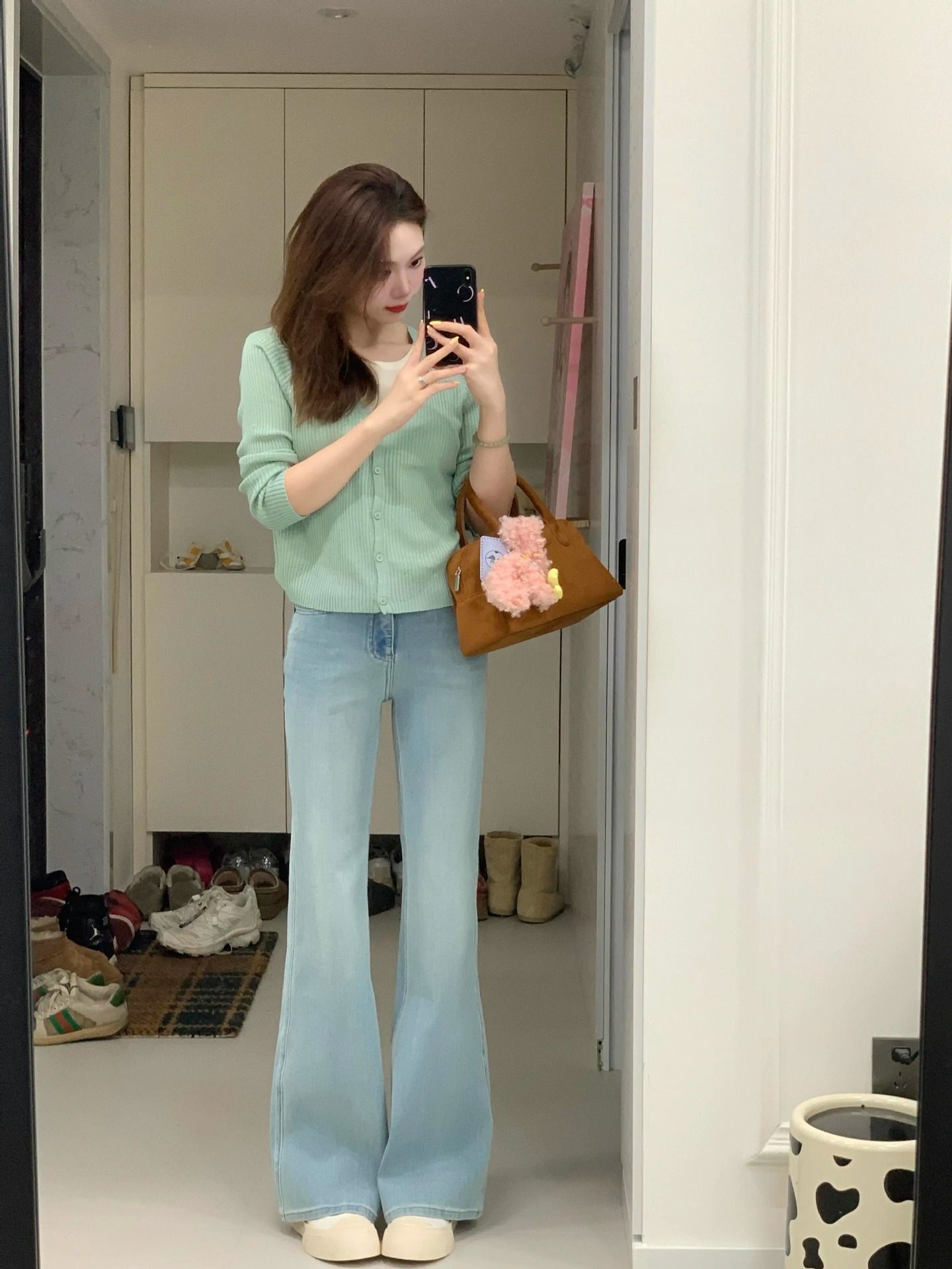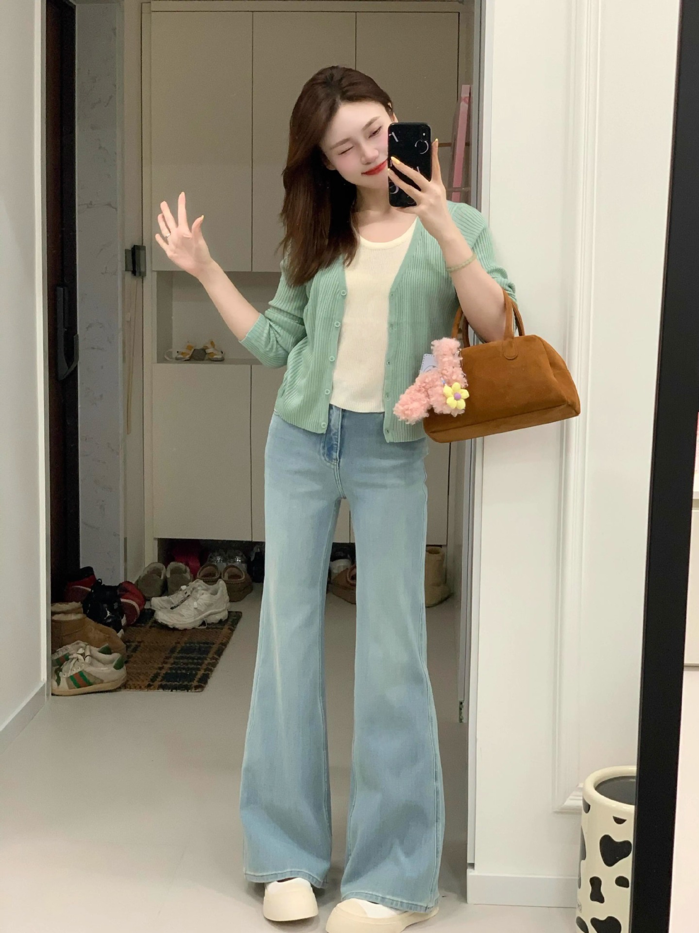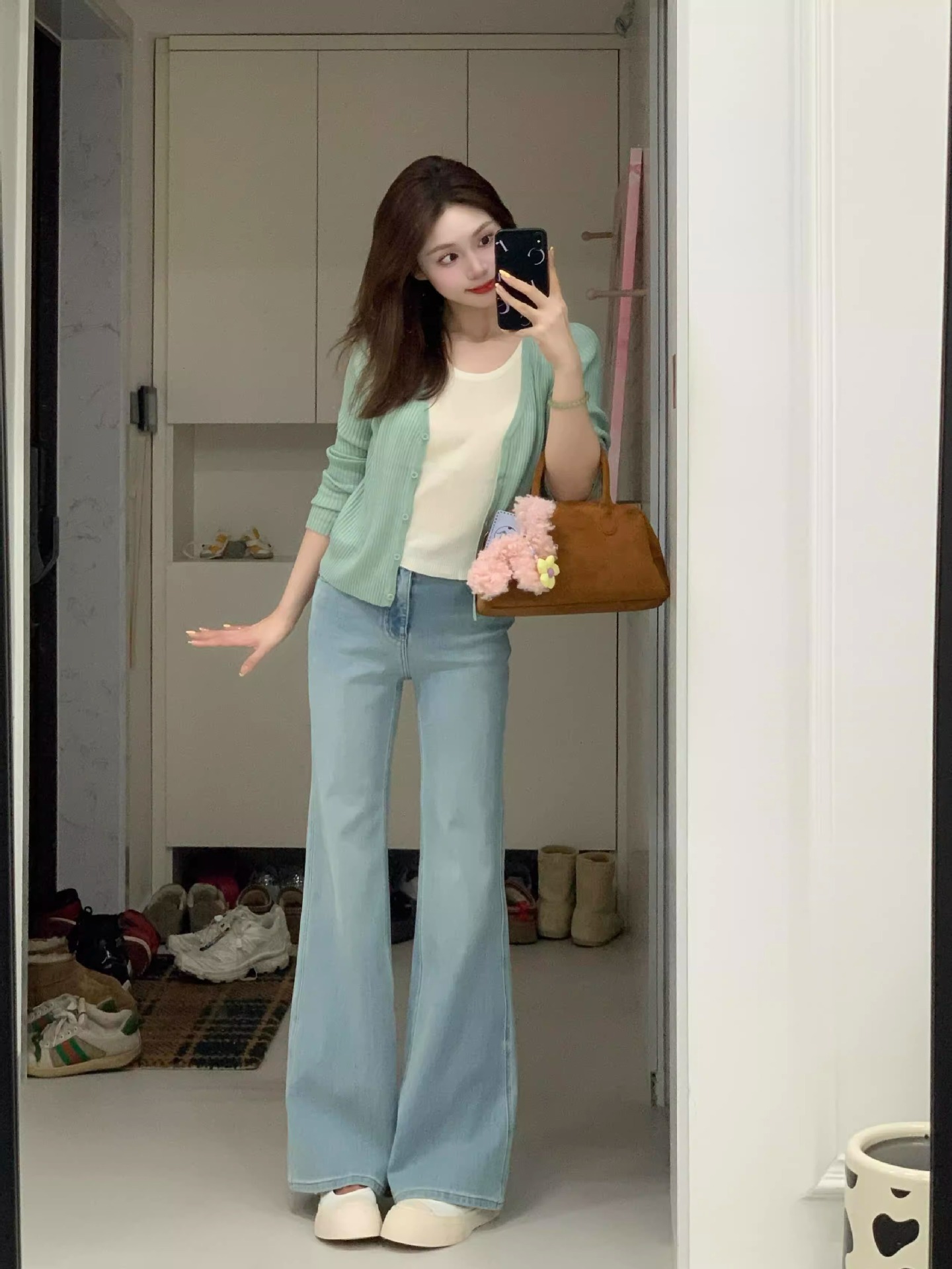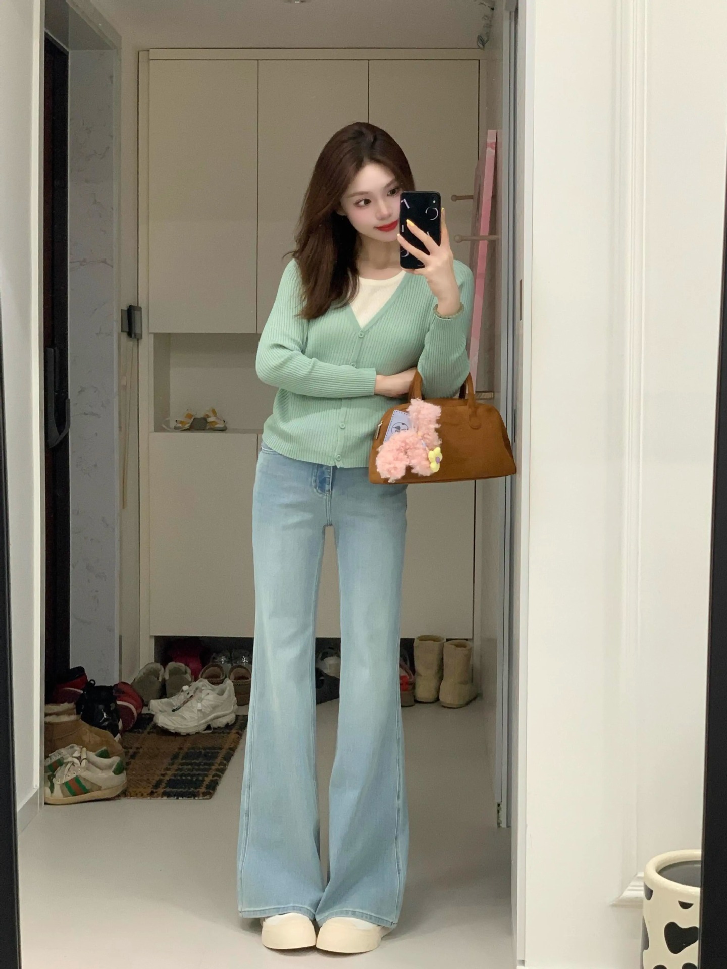 봄 한국식 그린 V 넥 짧은 카디건 코트 여성의 봄과 가을 가짜 투피스 스웨터 니트웨어 탑스토어 가기