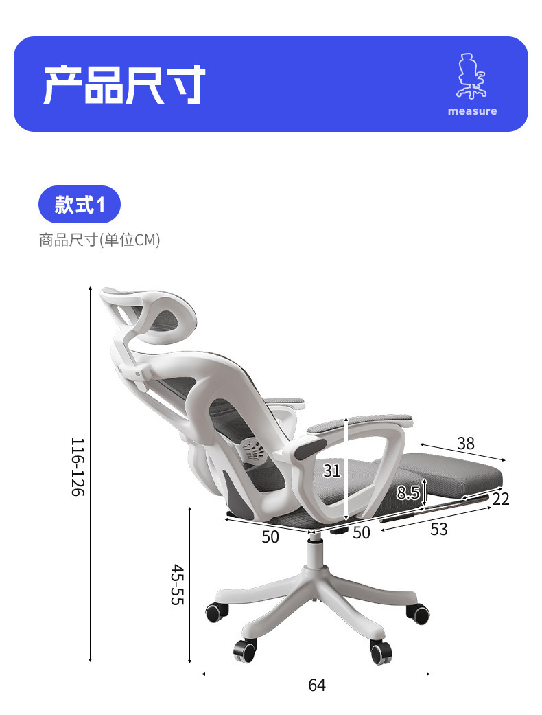 • 기본모델 [화이트 프레임 그레이 메쉬] 9CM 두께의 스펀지쿠션+발판+리클라이닝 150°