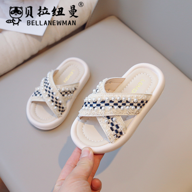 선택 뜨거운 판매 어린이 패션 슬리퍼 2025 여름 새로운 소녀 크로스 진주 플랫 슬리퍼 신발스토어 가기