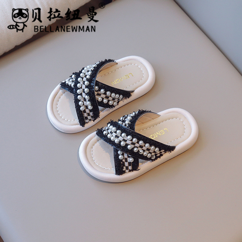 선택 뜨거운 판매 어린이 패션 슬리퍼 2025 여름 새로운 소녀 크로스 진주 플랫 슬리퍼 신발