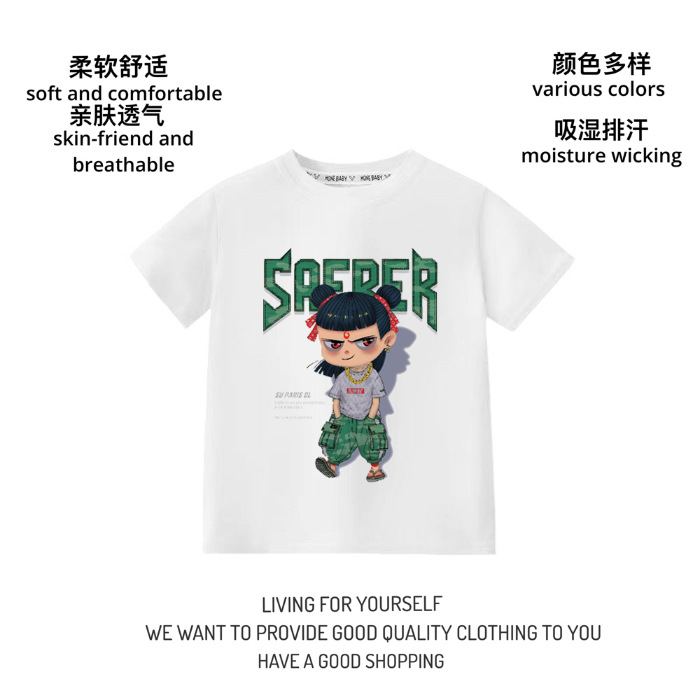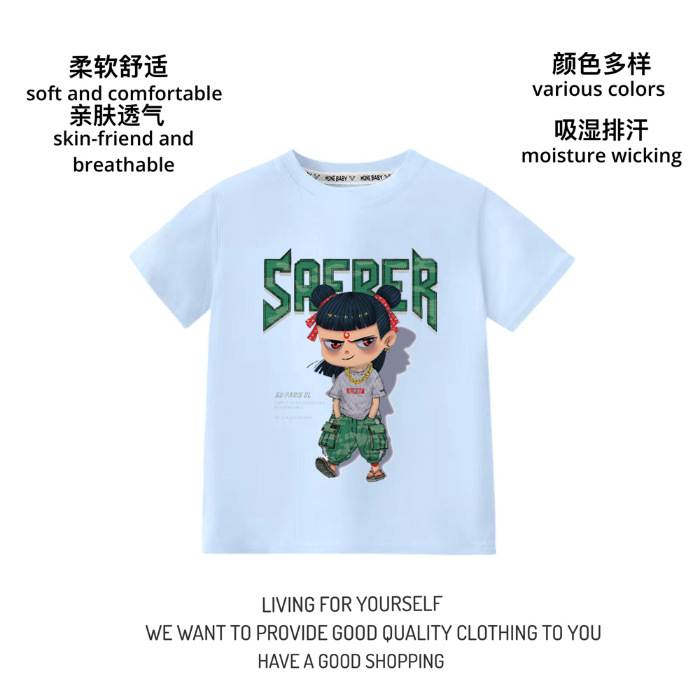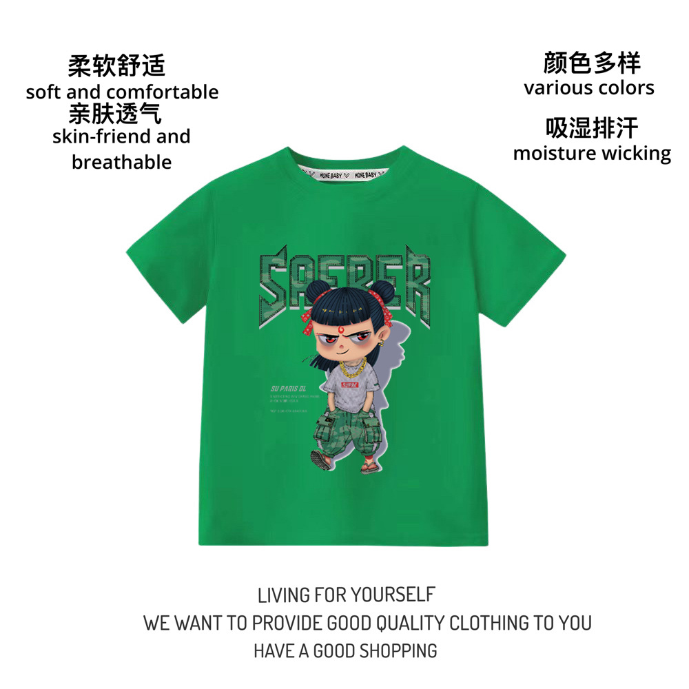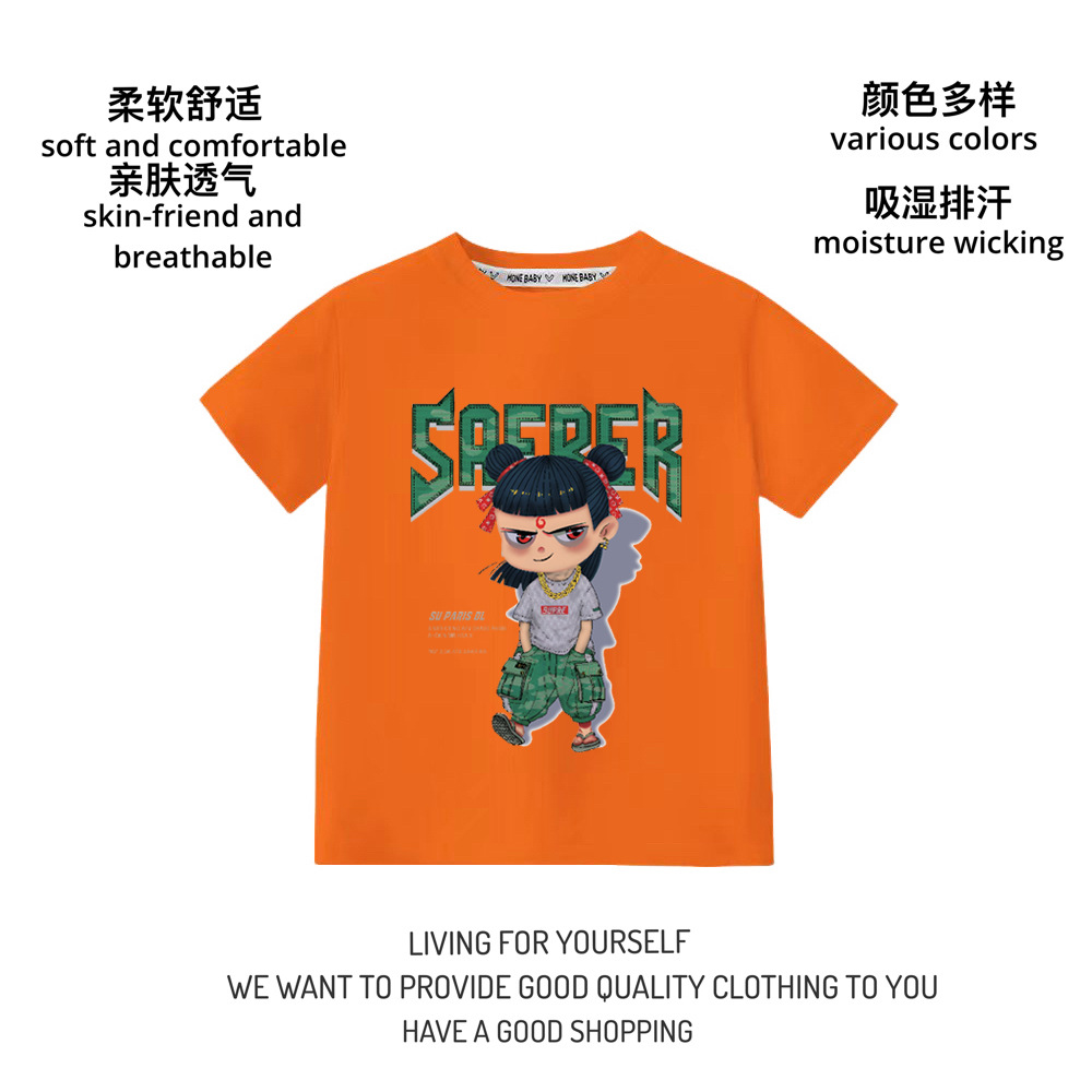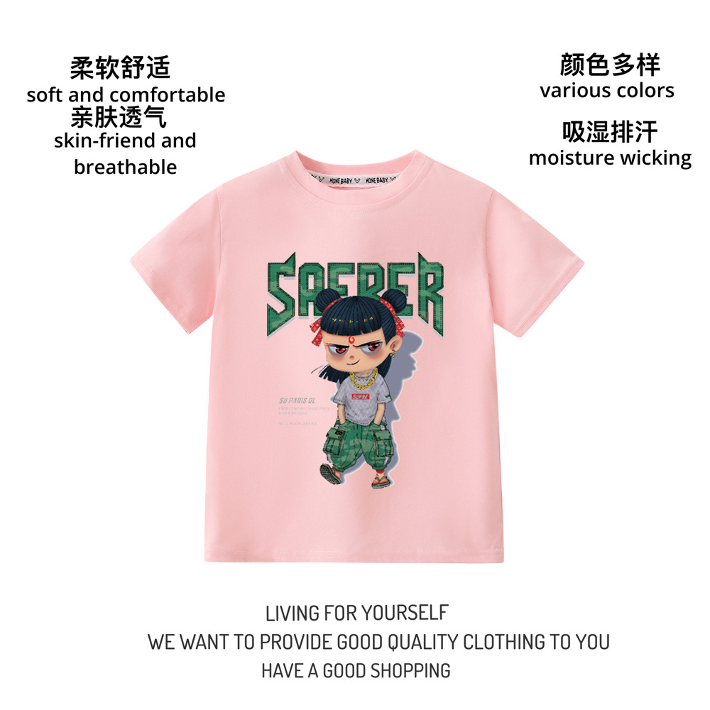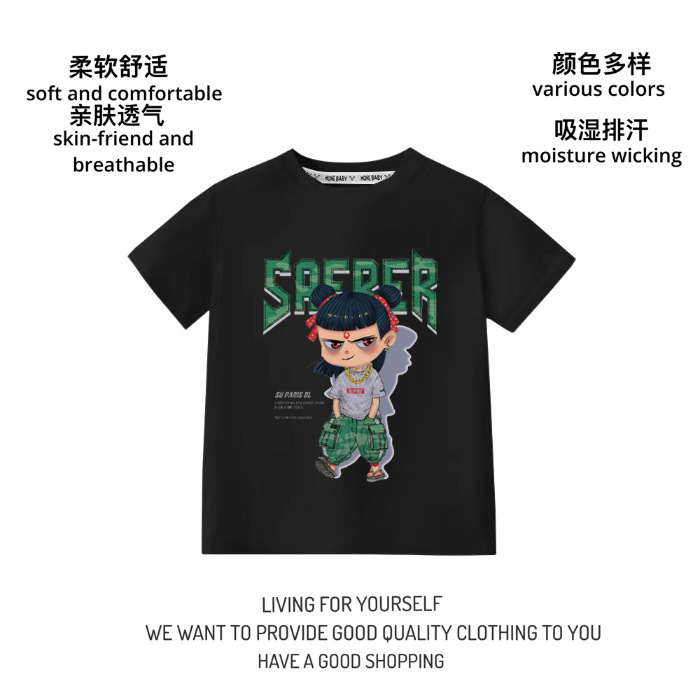 National Tide Nezha 2 만화 반팔 어린이 만화 탑 외국 스타일 올 매치 캐주얼 티셔츠