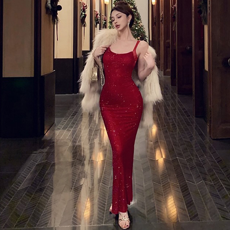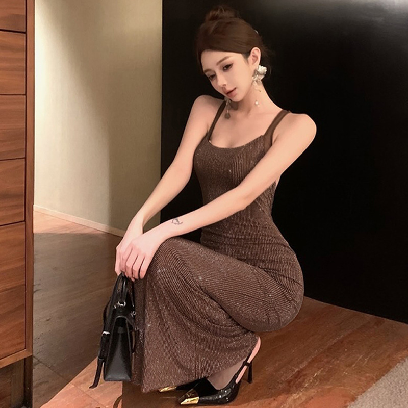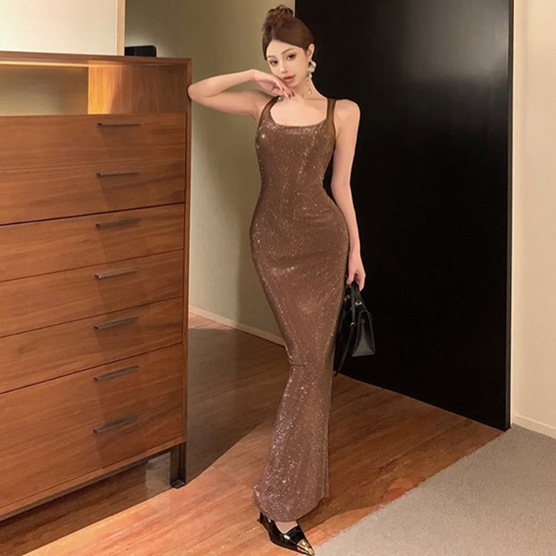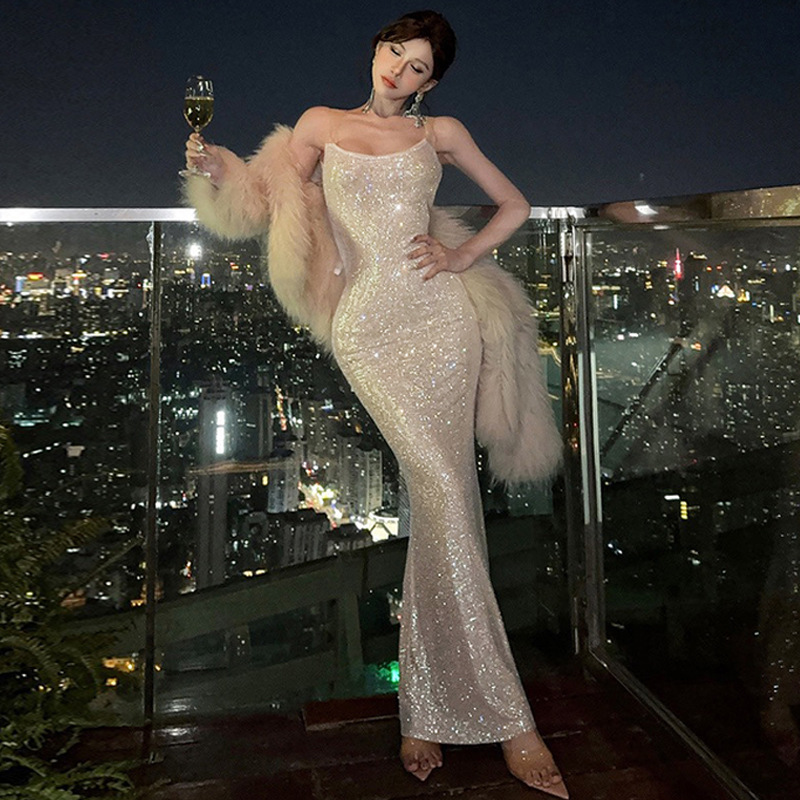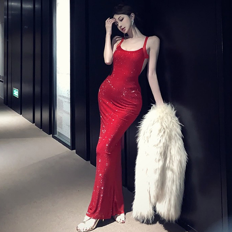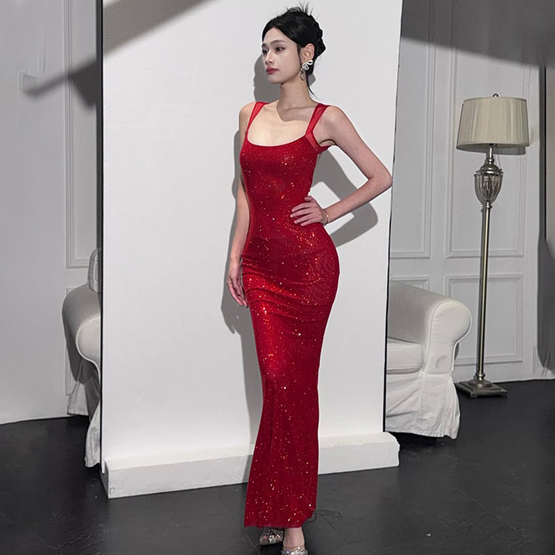 유럽과 미국 스타일 2025 여름 새로운 여성의 섹시한 백리스 메쉬 스티칭 사교계 기질 슬림 원피스 세대 헤어스토어 가기