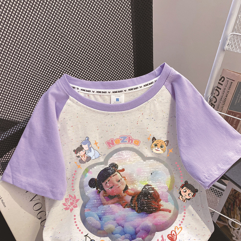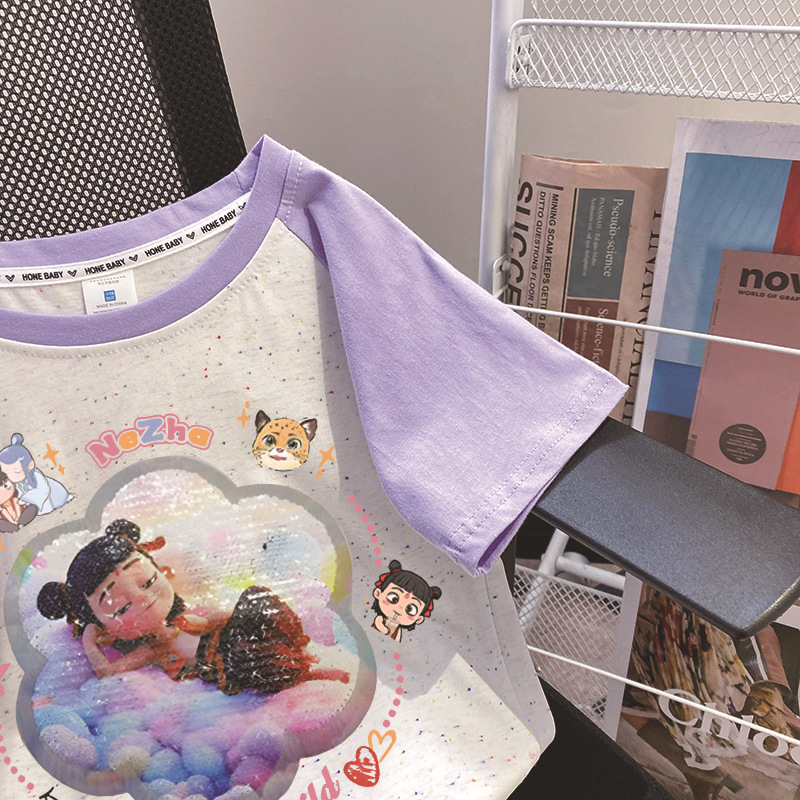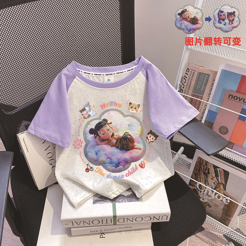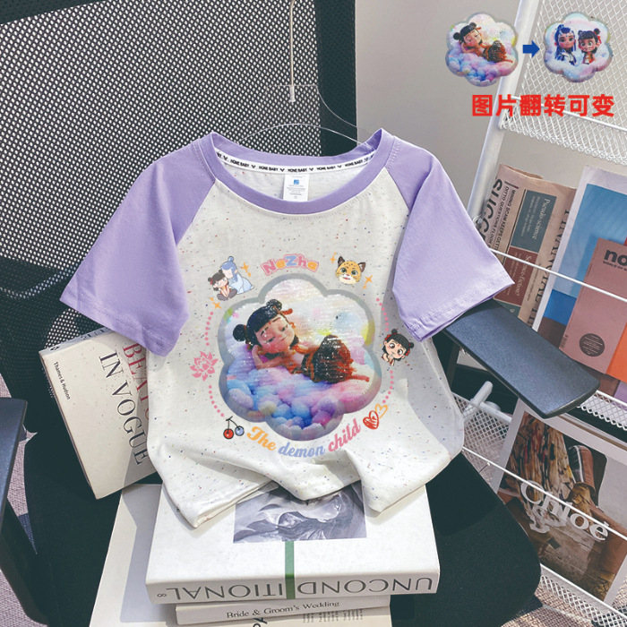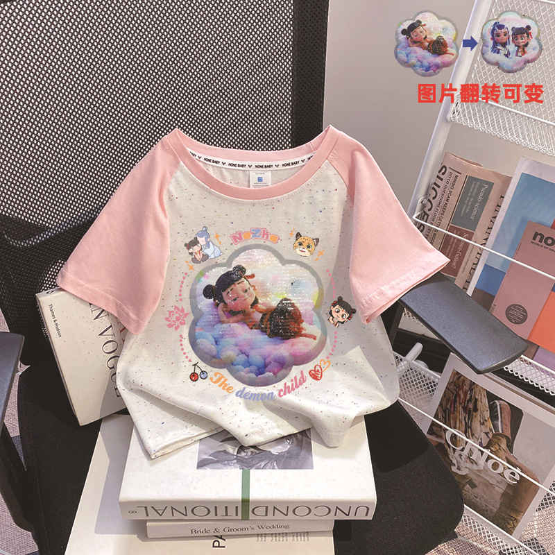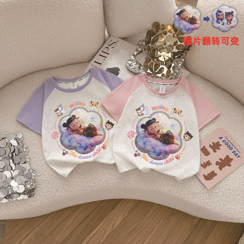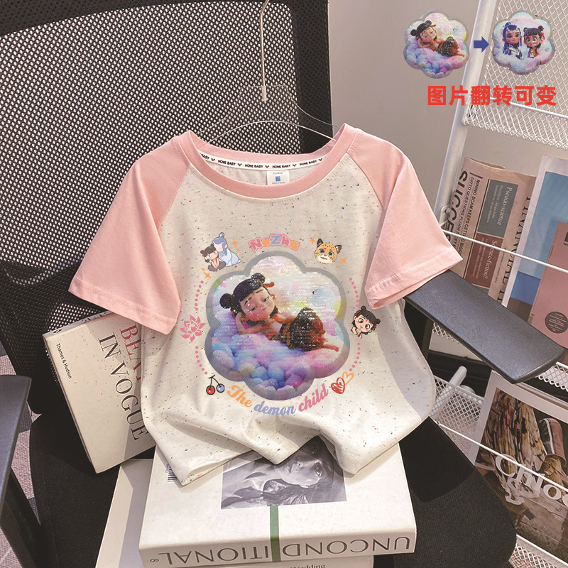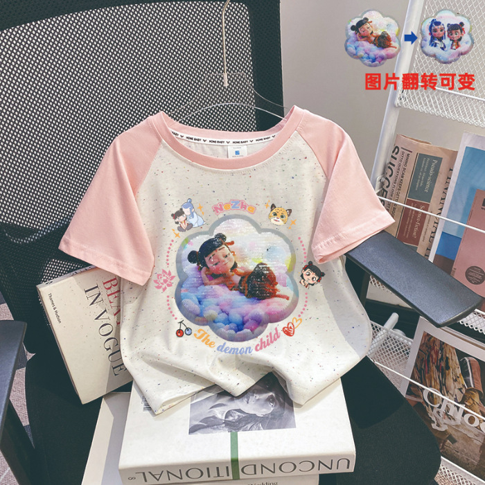 여자 서양식 플립 패턴 네자 매직 어린이 반팔 티셔츠 여름 2025 새로운 어린이 컬러 매칭 탑스토어 가기