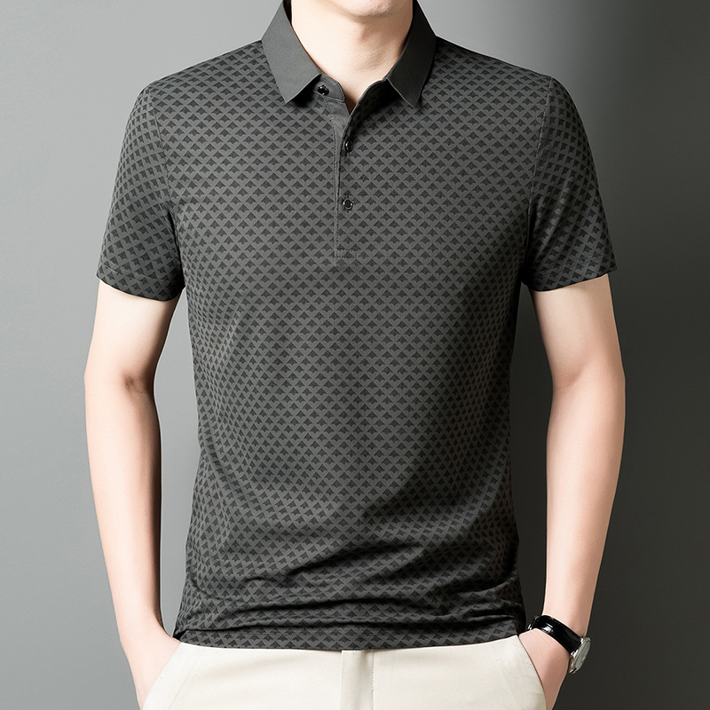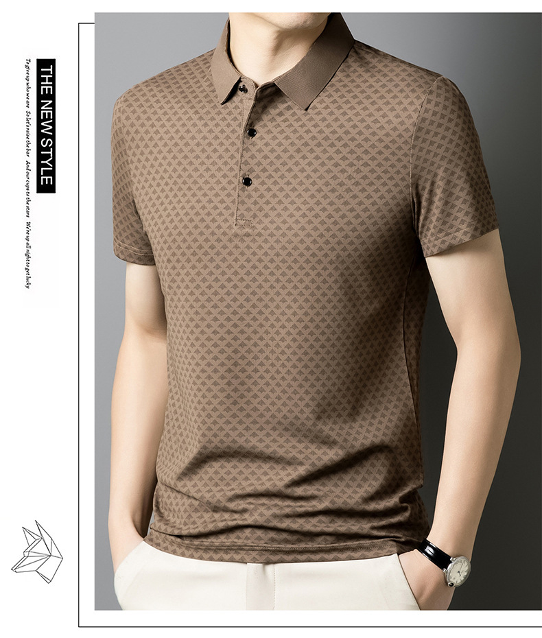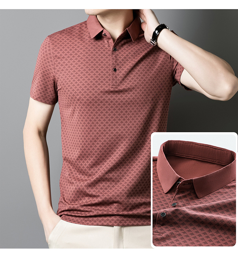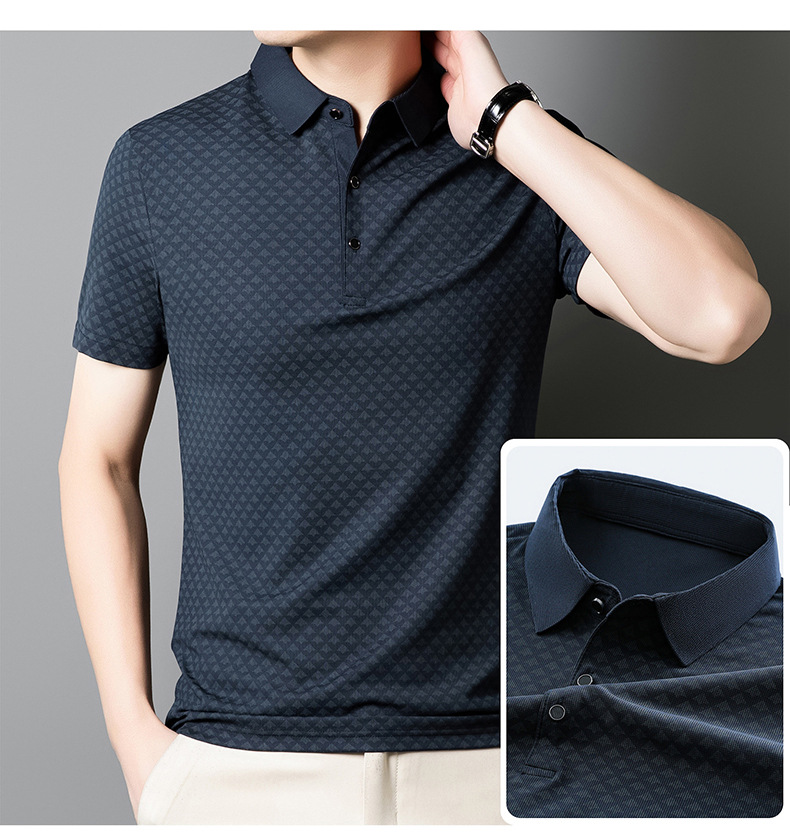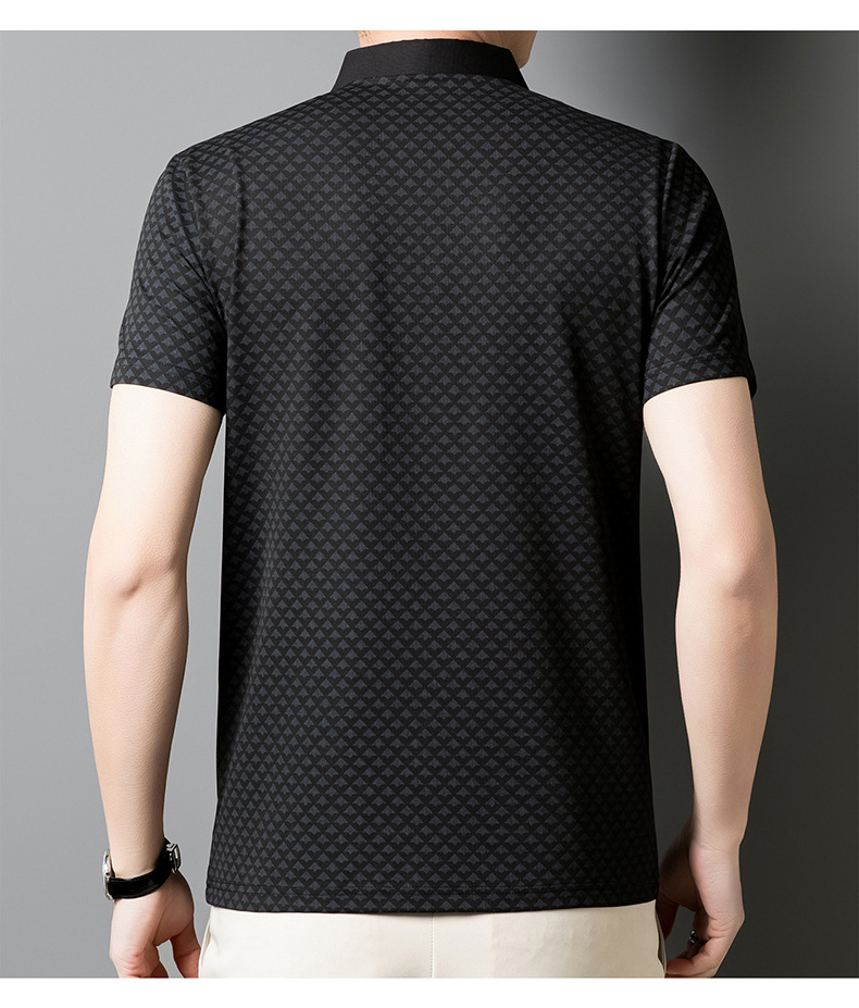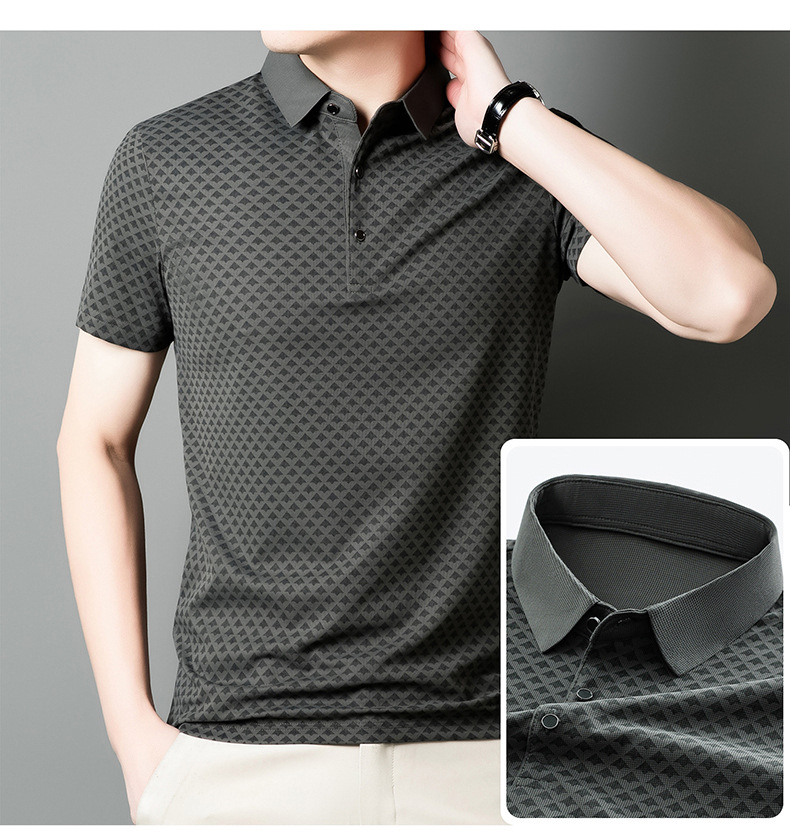 격자 무늬 아이스 실크 남성용 폴로 셔츠 반팔 2025 여름 새로운 도착 중년 아빠의 프린트 랩 티셔츠 남성용