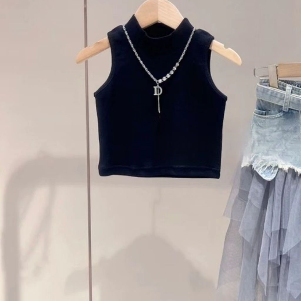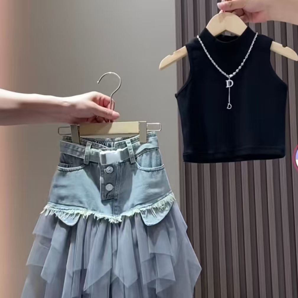 여자 여름 새로운 인터넷 축하 세트 2025 한국 스타일 아기 소녀 조끼 최고 메쉬 스티칭 데님 스커트 세트스토어 가기