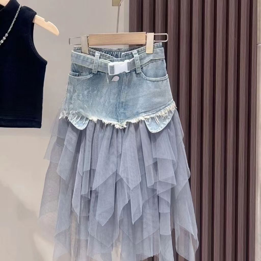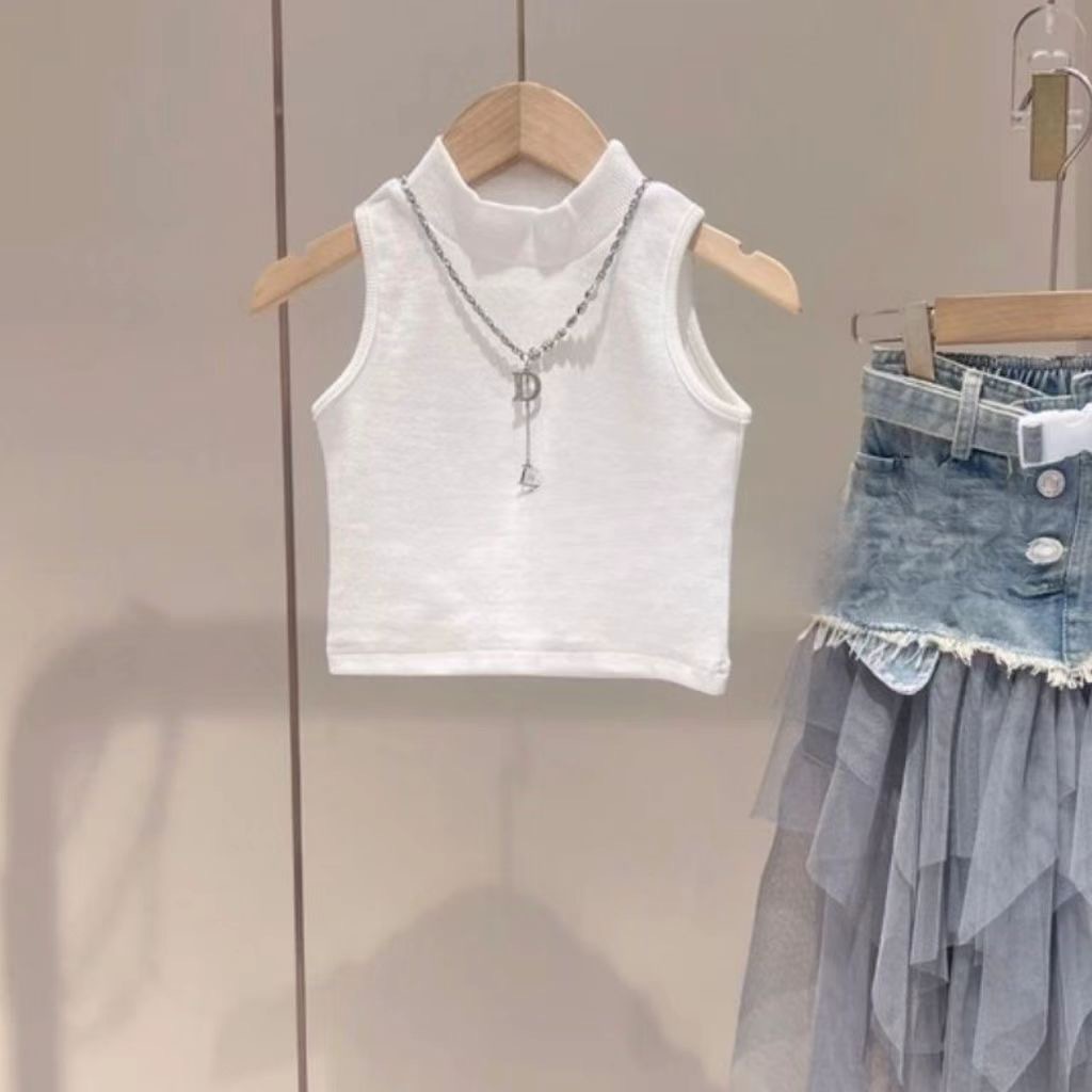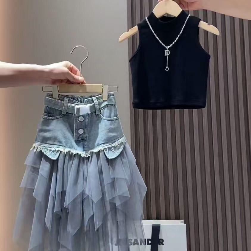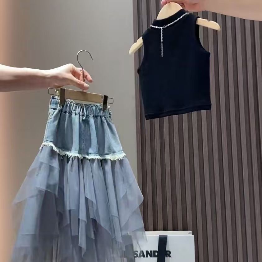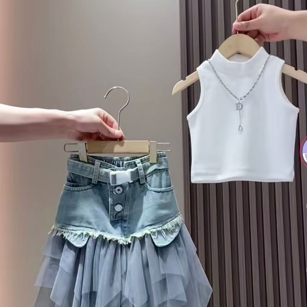 여자 여름 새로운 인터넷 축하 세트 2025 한국 스타일 아기 소녀 조끼 최고 메쉬 스티칭 데님 스커트 세트
